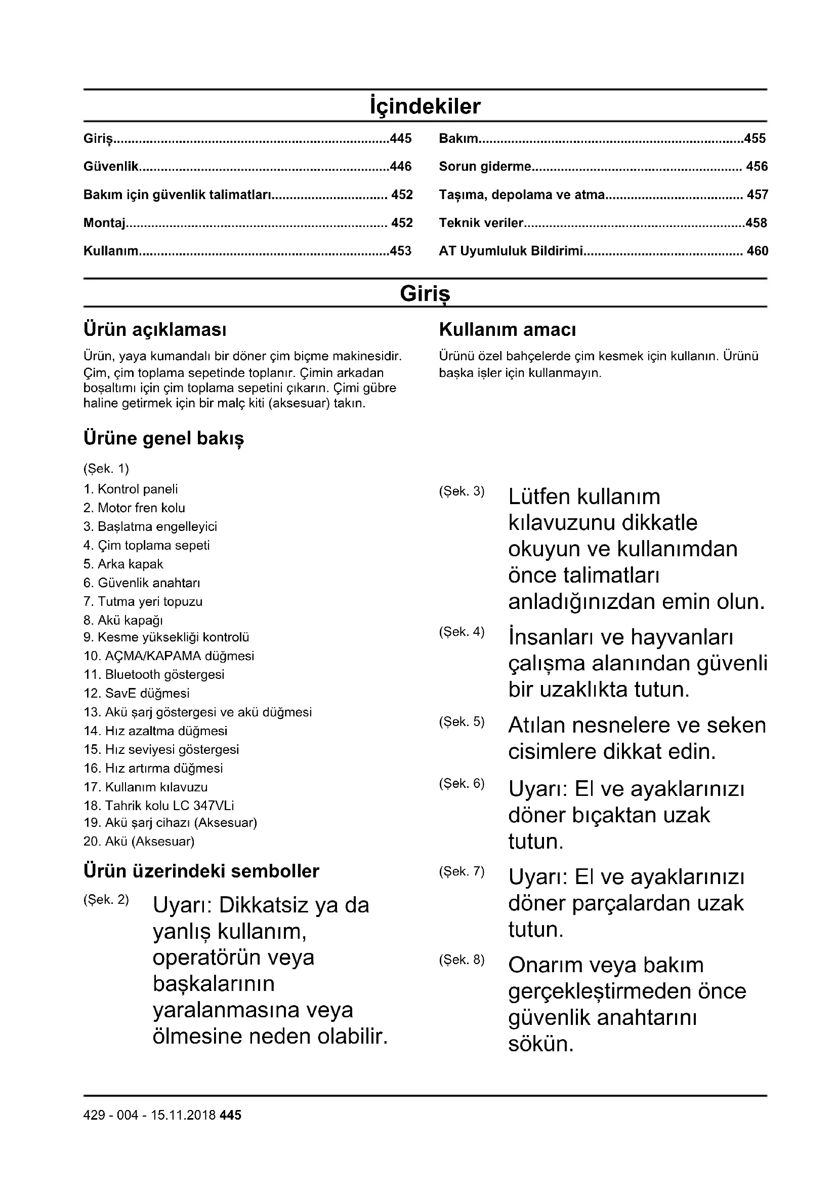 - AT Uyumluluk Bildirimi Giriş Ürün açıklaması Ürün, yaya kumandalı bir döner çim biçme makinesidir. Çim, çim toplama sepetinde toplanır. Çimin arkadan boşaltımı için çim toplama sepetini çıkarın. Çimi gübre haline getirmek için bir malç kiti (aksesuar) takın. Kullanım amacı Ürünü özel bahçelerde çim kesmek için kullanın. Ürünü başka işler için kullanmayın. Ürüne genel bakış (Şek. 1) p. 460