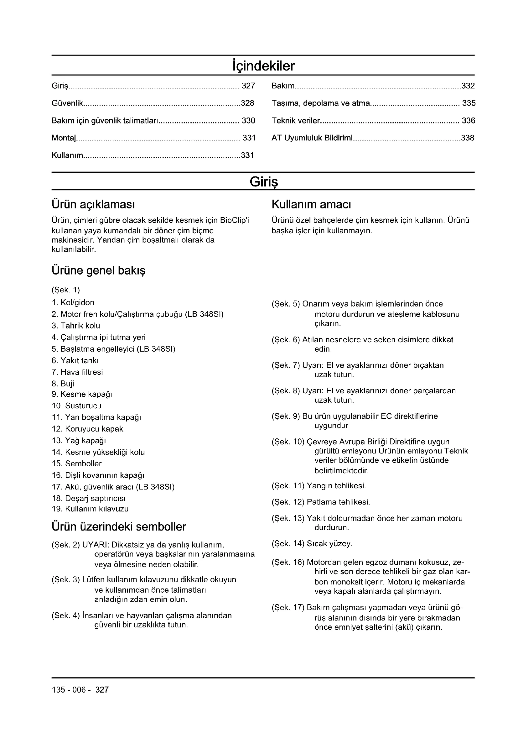 - AT Uyumluluk Bildirimi Giriş Ürün açıklaması Ürün, çimleri gübre olacak şekilde kesmek için BioClip'i kullanan yaya kumandalı bir döner çim biçme makinesidir. Yandan çim boşaltmalı olarak da kullanılabilir. Kullanım amacı Ürünü özel bahçelerde çim kesmek için kullanın. Ürünü başka işler için kullanmayın. Ürüne genel bakış (Şek. 1) p. 338