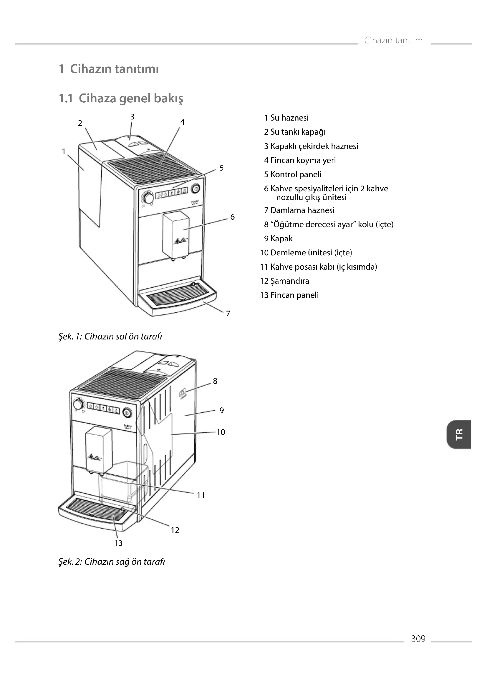 Şek. 2: Cihazın sağ ön tarafı 1 Su haznesi 2 Su tankı kapağı 3 Kapaklı çekirdek haznesi 4 Fincan koyma yeri 5 Kontrol paneli 6 Kahve spesiyaliteleri için 2 kahve nozullu çıkış ünitesi 7 Damlama haznesi 8 “Öğütme derecesi ayar” kolu (içte) 9 Kapak 10 Demleme ünitesi (içte) 11 Kahve posası kabı (iç kısımda) 12 Şamandıra 13 Fincan paneliCihazın tanıtımı
