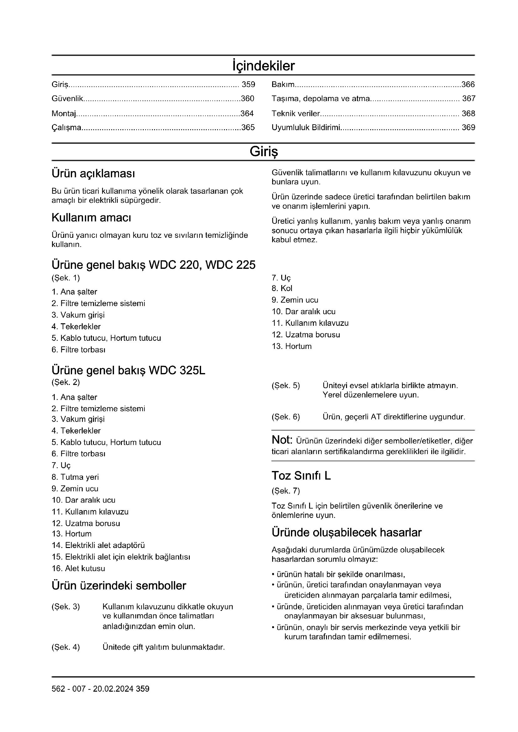 - Uyumluluk Bildirimi Giriş Ürün açıklaması Bu ürün ticari kullanıma yönelik olarak tasarlanan çok amaçlı bir elektrikli süpürgedir. Kullanım amacı Ürünü yanıcı olmayan kuru toz ve sıvıların temizliğinde kullanın. Güvenlik talimatlarını ve kullanım kılavuzunu okuyun ve bunlara uyun. Ürün üzerinde sadece üretici tarafından belirtilen bakım ve onarım işlemlerini yapın. Üretici yanlış kullanım, yanlış bakım veya yanlış onarım sonucu ortaya çıkan hasarlarla ilgili hiçbir yükümlülük kabul etmez. Ürüne genel bakış WDC 220, WDC 225 (Şek. 1) p. 369