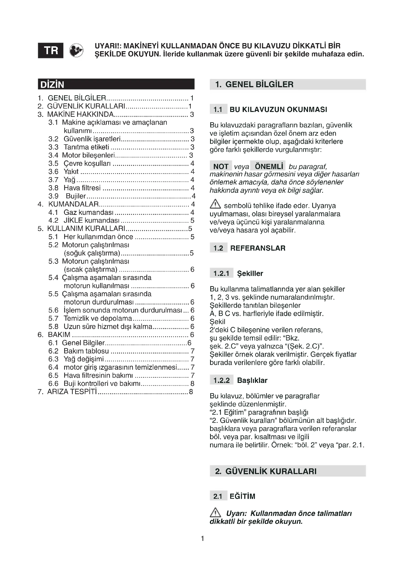 Bu kılavuz, bölümler ve paragraar şeklinde düzenlenmiştir. “2.1 Eğitim” paragrafının başlığı “2. Güvenlik kuralları" bölümünün alt başlığıdır. başlıklara veya paragraara verilen referanslar böl. veya par. kısaltması ve ilgili numara ile belirtilir. Örnek: “böl. 2” veya “par. 2.1.