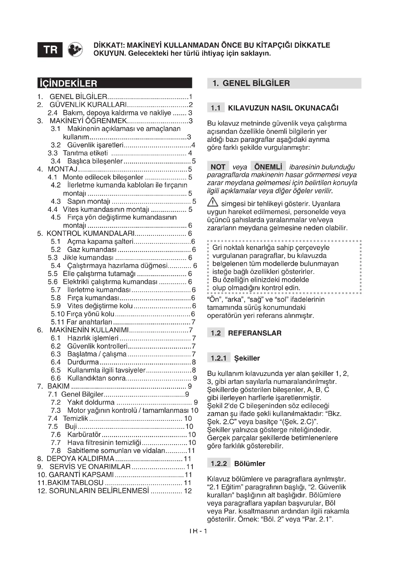Kılavuz bölümlere ve paragraara ayrılmıştır. “2.1 Eğitim” paragrafının başlığı, “2. Güvenlik kuralları" başlığının alt başlığıdır. Bölümlere veya paragraara yapılan başvurular, Böl veya Par. kısaltmasının ardından ilgili rakamla gösterilir. Örnek: “Böl. 2” veya “Par. 2.1”. DİKKAT!: MAKİNEYİ KULLANMADAN ÖNCE BU KİTAPÇIĞI DİKKATLE OKUYUN. Gelecekteki her türlü ihtiyaç için saklayın.