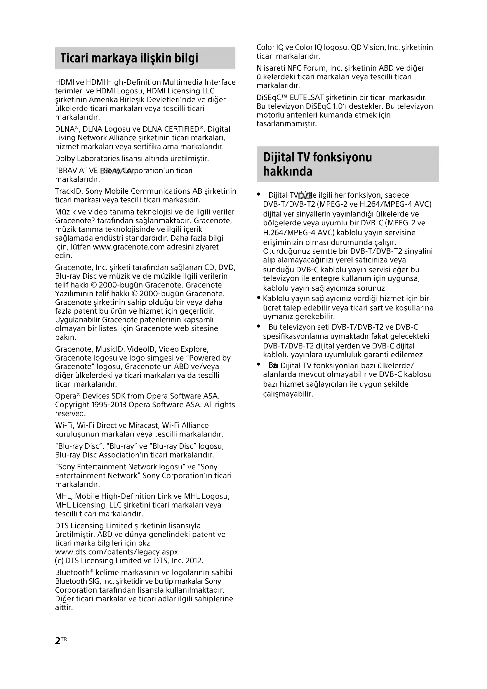 HDMI ve HDMI High-Definition Multimedia Interface terimleri ve HDMI Logosu, HDMI Licensing LLC şirketinin Amerika Birleşik Devletleri’nde ve diğer ülkelerde ticari markaları veya tescilli ticari markalarıdır. DLNA®, DLNA Logosu ve DLNA CERTIFIED®, Digital Living Network Alliance şirketinin ticari markaları, hizmet markaları veya sertifikalama markalarıdır. Dolby Laboratories lisansı altında üretilmiştir. “BRAVIA” VE Sony Corporation’un ticari markalarıdır. TrackID, Sony Mobile Communications AB şirketinin ticari markası veya tescilli ticari markasıdır. Müzik ve video tanıma teknolojisi ve de ilgili veriler Gracenote® tarafından sağlanmaktadır. Gracenote, müzik tanıma teknolojisinde ve ilgili içerik sağlamada endüstri standardıdır. Daha fazla bilgi için, lütfen www.gracenote.com adresini ziyaret edin. Gracenote, Inc. şirketi tarafından sağlanan CD, DVD, Blu-ray Disc ve müzik ve de müzikle ilgili verilerin telif hakkı © 2000-bugün Gracenote. Gracenote Yazılımının telif hakkı © 2000-bugün Gracenote. Gracenote şirketinin sahip olduğu bir veya daha fazla patent bu ürün ve hizmet için geçerlidir. Uygulanabilir Gracenote patenlerinin kapsamlı olmayan bir listesi için Gracenote web sitesine bakın. Gracenote, MusicID, VideoID, Video Explore, Gracenote logosu ve logo simgesi ve “Powered by Gracenote” logosu, Gracenote'un ABD ve/veya diğer ülkelerdeki ya ticari markaları ya da tescilli ticari markalarıdır. Opera® Devices SDK from Opera Software ASA. Copyright 1995-2013 Opera Software ASA. All rights reserved. Wi-Fi, Wi-Fi Direct ve Miracast, Wi-Fi Alliance kuruluşunun markaları veya tescilli markalarıdır. “Blu-ray Disc”, “Blu-ray” ve “Blu-ray Disc” logosu, Blu-ray Disc Association’ın ticari markalarıdır. “Sony Entertainment Network logosu” ve “Sony Entertainment Network” Sony Corporation’ın ticari markalarıdır. MHL, Mobile High-Definition Link ve MHL Logosu, MHL Licensing, LLC şirketini ticari markaları veya tescilli ticari markalarıdır. DTS Licensing Limited şirketinin lisansıyla üretilmiştir. ABD ve dünya genelindeki patent ve ticari marka bilgileri için bkz www.dts.com/patents/legacy.aspx. (c) DTS Licensing Limited ve DTS, Inc. 2012. Bluetooth® kelime markasının ve logolarının sahibi Bluetooth SIG, Inc. şirketidir ve bu tip markalar Sony Corporation tarafından lisansla kullanılmaktadır. Diğer ticari markalar ve ticari adlar ilgili sahiplerine aittir. Color IQ ve Color IQ logosu, QD Vision, Inc. şirketinin ticari markalarıdır. N işareti NFC Forum, Inc. şirketinin ABD ve diğer ülkelerdeki ticari markaları veya tescilli ticari markalarıdır. DiSEqC™ EUTELSAT şirketinin bir ticari markasıdır. Bu televizyon DiSEqC 1.0’ı destekler. Bu televizyon motorlu antenleri kumanda etmek için tasarlanmamıştır. Dijital TV ( ) ile ilgili her fonksiyon, sadece DVB-T/DVB-T2 (MPEG-2 ve H.264/MPEG-4 AVC) dijital yer sinyallerin yayınlandığı ülkelerde ve bölgelerde veya uyumlu bir DVB-C (MPEG-2 ve H.264/MPEG-4 AVC) kablolu yayın servisine erişiminizin olması durumunda çalışır. Oturduğunuz semtte bir DVB-T/DVB-T2 sinyalini alıp alamayacağınızı yerel satıcınıza veya sunduğu DVB-C kablolu yayın servisi eğer bu televizyon ile entegre kullanım için uygunsa, kablolu yayın sağlayıcınıza sorunuz. Kablolu yayın sağlayıcınız verdiği hizmet için bir ücret talep edebilir veya ticari şart ve koşullarına uymanız gerekebilir. Bu televizyon seti DVB-T/DVB-T2 ve DVB-C spesifikasyonlarına uymaktadır fakat gelecekteki DVB-T/DVB-T2 dijital yerden ve DVB-C dijital kablolu yayınlara uyumluluk garanti edilemez.