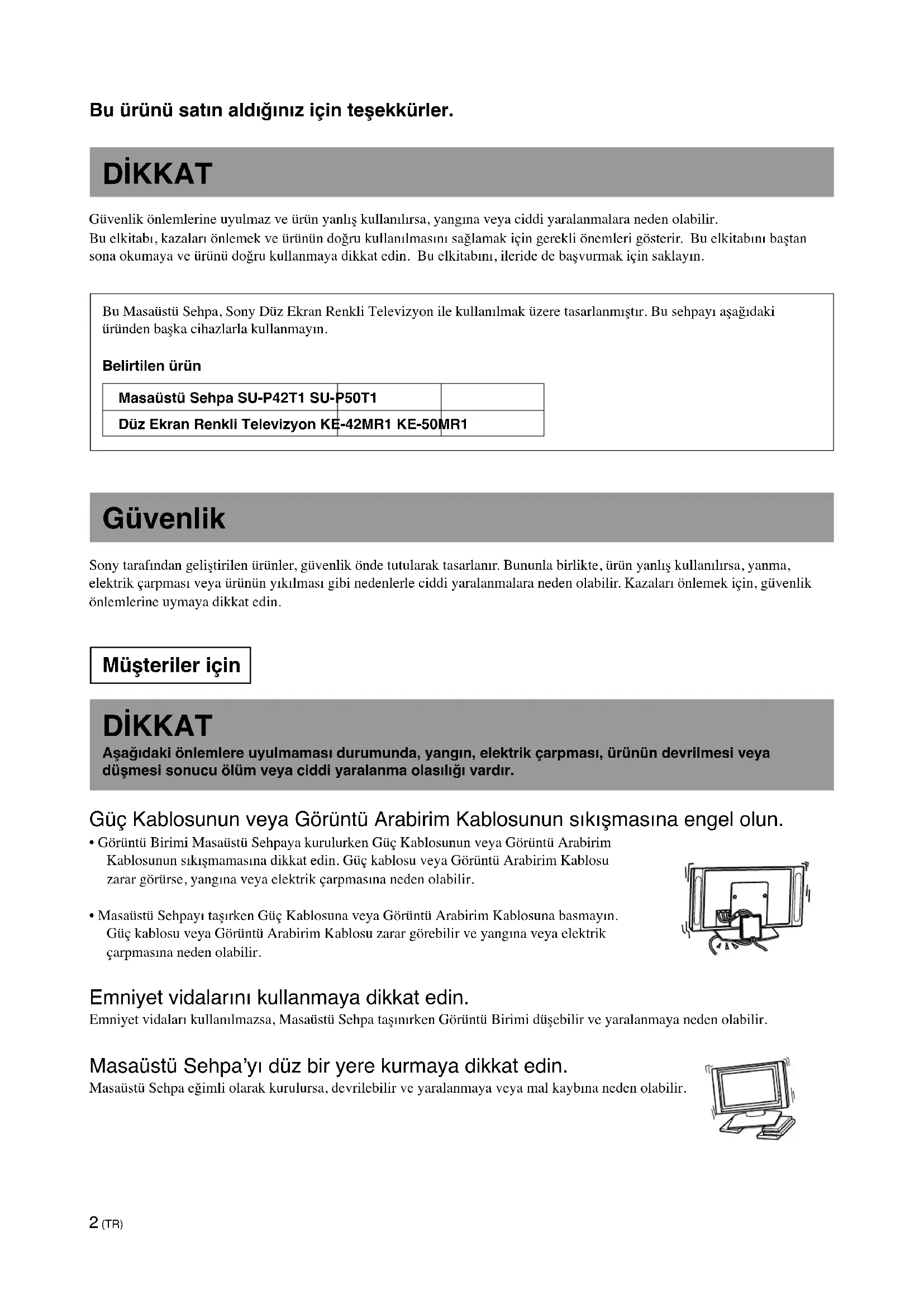 - Masaüstü Sehpay› tafl›rken Güç Kablosuna veya Görüntü Arabirim Kablosuna basmay›n. Güç kablosu veya Görüntü Arabirim Kablosu zarar görebilir ve yang›na veya elektrik çarpmas›na neden olabilir. Emniyet vidalar›n› kullanmaya dikkat edin. Emniyet vidalar› kullan›lmazsa, Masaüstü Sehpa tafl›n›rken Görüntü Birimi düflebilir ve yaralanmaya neden olabilir. Masaüstü Sehpa’y› düz bir yere kurmaya dikkat edin. Masaüstü Sehpa e¤imli olarak kurulursa, devrilebilir ve yaralanmaya veya mal kayb›na neden olabilir.3 (TR) Masaüstü Sehpa’y› sabit bir yüzeye kurmaya dikkat edin. Masaüstü Sehpa’y› sabit olmayan bir yüzeye kurarsan›z, dengesini kaybedip devrilebilirveya düflebilir. Bu da yaralanmaya veya mal kayb›na neden olabilir. Sehpan›n y›k›lmamas› için önlem al›n. Aksi taktirde, Masaüstü Sehpa deprem durumunda y›k›l›p yaralanmalara veya mal kayb›na neden olabilir. Masaüstü Sehpa’y›sa¤lam biçimde ba¤lamak ve devrilmesini önlemek için, Ana Destek’in üst k›sm›nda bulunan Emniyet Ba¤lant›lar›’n›ndeliklerinden bir tel veya benzerini geçirin ve tellerin di¤er uçlar›n› duvara sabitleyin. Masaüstü Sehpa’ya yaslanmay›n ve as›lmay›n. Masaüstü Sehpa y›k›l›p yaralanmalara neden olabilir. Görüntü Birimi’ndeki havaland›rma deliklerini kapatmay›n. Masaüstü Sehpa’n›n üstünü bir kumafl veya benzeri ile örterek Görüntü Birimi’ndekihavaland›rma deliklerini kapat›rsan›z, Görüntü Birimi afl›r› ›s›nabilir ve yang›na nedenolabilir. Sehpay› bu elkitab›nda gösterilen flekilde tafl›maya dikkat edin. Masaüstü Sehpa yanl›fl tafl›n›rsa devrilebilir veya yaralanmaya neden olabilir. Güç Kablosuna veya Görüntü Arabirim Kablosuna tak›lmay›n. Güç kablosuna veya Görüntü Arabirim Kablosuna tak›l›rsan›z, Masaüstü Sehpa devrilip yaralanmalara neden olabilir. Masaüstü Sehpa’y›, üstüne Görüntü Birimi kurulmufl olarak tafl›may›n. Masaüstü Sehpa’y› tafl›madan önce Görüntü Birimi’ni ç›karmaya dikkat edin. Aksi taktirde,Görüntü Birimi düflüp yaralanmalara neden olabilir. UYARI Afla¤›daki önlemlere uyulmazsa, kullan›c› yaralanabilir veya mal kayb›na u¤rayabilir. Belirtilen üründen baflka gereçler kurmay›n. Masaüstü Sehpa, belirtilen ürünle birlikte kullan›lmak üzere tasarlanm›flt›r. Belirtilenden baflka ürün kurarsan›z, düflüpyaralanmalara veya mal kayb›na neden olabilir. Türkçe TR4 (TR) Önlemler Sehpay› temizlemek için, belirli aral›klarla kuru ve yumuflak bir bez kullan›n. ‹natç› lekeler, suland›r›lm›fl bulafl›k deterjan›yla biraz ›slat›lm›fl bir bezle ç›kar›labilir. Ard›ndan bölgeyi yumuflak, kuru bir bezle silin. Sehpan›n parlakl›¤›n› bozabilece¤i için, tiner, benzin gibi kimyasal maddeler kullanmay›n. Masaüstü Sehpan›n Montaj› Sony Sat›c›lar› için Afla¤›daki yönergeler yaln›zca Sony Sat›c›lar› içindir. Yukar›da aç›klanan güvenlik önlemlerini okuyun ve bu ürünün kurulum, bak›m ve denetim ifllemleri s›ras›nda güvenli¤e gerekli dikkati gösterin. Kurulum iflinin en az iki kifli taraf›ndan yap›lmas›n› sa¤lay›n. Görüntü Birimi, Masaüstü Sehpa’n›n üzerine kurulurken, kurulum iflinin en az iki kifli taraf›ndan yap›lmas›n› sa¤lay›n. Kurulumu bir kifli tek bafl›na yaparsa, kaza veya yaralanmaya neden olabilir. Masaüstü Sehpa’y› bu elkitab›ndaki yönergeleri izleyerek güvenli biçimde monte etmeye dikkat edin. Vidalardan biri gevfler veya düflerse, Masaüstü Sehpa e¤ilip devrilebilir veya Görüntü Birimi düflebilir. Bu da yaralanmaya veya mal kayb›na neden olabilir. Görüntü Birimi’nin, yönergelere uyularak güvenli biçimde kurulmas›na dikkat edin. Vidalar›n iyice s›k›lmas›n› sa¤lay›n. Görüntü Birimi sa¤lam biçimde kurulmazsa, düfler ve yaralanmalara neden olabilir. Masaüstü Sehpa’y› monte ederken ellerinizi veya parmaklar›n›z› yaralamamaya dikkat edin. Masaüstü Sehpa’y› monte ederken veya Görüntü Birimini kurarken ellerinizi veya parmaklar›n›z› yaralamamaya dikkat edin. Kurulumla ilgili önlemler