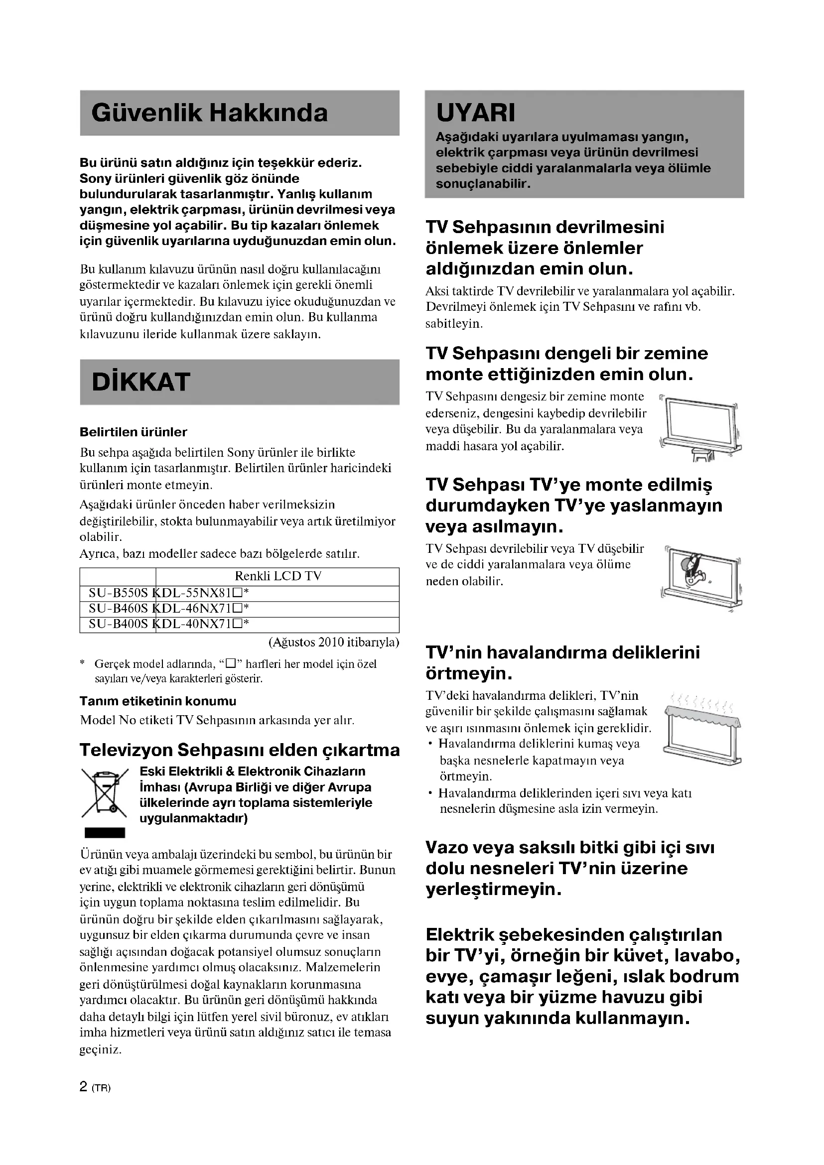 - Ο πλήρης ψηφιακς ενισχυτής S-Master επιτυγχάνει απδοση ισχύος μεγαλύτερη απ 85 %.2 (TR) Bu ürünü satın aldığınız için teşekkür ederiz. Sony ürünleri güvenlik göz önünde bulundurularak tasarlanmıştır. Yanlış kullanım yangın, elektrik çarpması, ürünün devrilmesi veya düşmesine yol açabilir. Bu tip kazaları önlemek için güvenlik uyarılarına uyduğunuzdan emin olun. Bu kullanım kılavuzu ürünün nasıl doğru kullanılacağını göstermektedir ve kazaları önlemek için gerekli önemli uyarılar içermektedir. Bu kılavuzu iyice okuduğunuzdan ve ürünü doğru kullandığınızdan emin olun. Bu kullanma kılavuzunu ileride kullanmak üzere saklayın. Belirtilen ürünler Bu sehpa aşağıda belirtilen Sony ürünler ile birlikte kullanım için tasarlanmıştır. Belirtilen ürünler haricindeki ürünleri monte etmeyin. Aşağıdaki ürünler önceden haber verilmeksizin değiştirilebilir, stokta bulunmayabilir veya artık üretilmiyor olabilir. Ayrıca, bazı modeller sadece bazı bölgelerde satılır. (Ağustos 2010 itibarıyla)