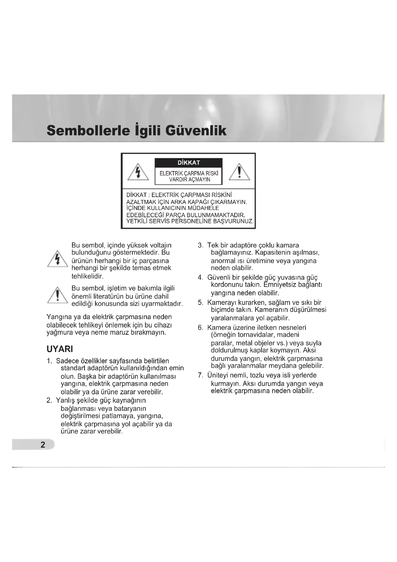 Sembollerle İgili Güvenlik Bu sembol, içinde yüksek voltajın bulunduğunu göstermektedir. Bu ürünün herhangi bir iç parçasına herhangi bir şekilde temas etmek tehlikelidir. Bu sembol, işletim ve bakımla ilgili önemli literatürün bu ürüne dahil edildiği konusunda sizi uyarmaktadır. Yangına ya da elektrik çarpmasına neden olabilecek tehlikeyi önlemek için bu cihazı yağmura veya neme maruz bırakmayın. UYARI