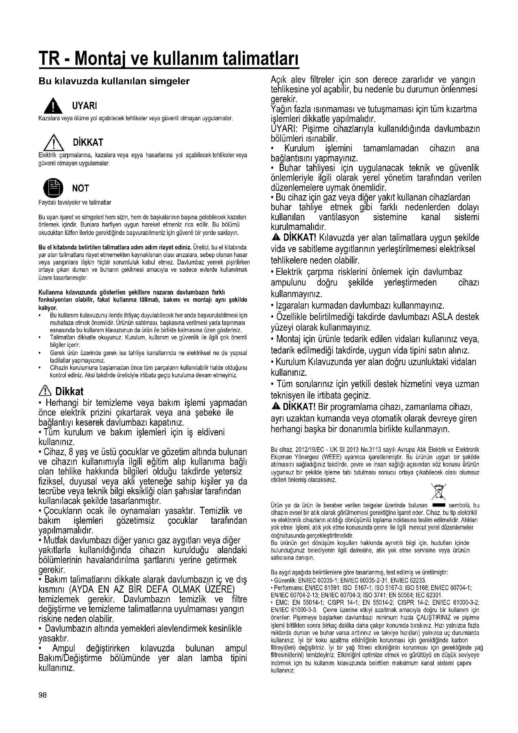 - Tüm sorularınız için yetkili destek hizmetini veya uzman teknisyen ile irtibata geçiniz. DİKKAT! Bir programlama cihazı, zamanlama cihazı, ayrı uzaktan kumanda veya otomatik olarak devreye giren herhangi başka bir donanımla birlikte kullanmayın. Bu cihaz, 2012/19/EC - UK SI 2013 No.3113 sayılı Avrupa Atık Elektrik ve Elektronik Ekipman Yönergesi (WEEE) uyarınca işaretlenmiştir. Bu ürünün uygun bir şekilde atılmasını sağladığınız takdirde, çevre ve insan sağlığı açısından söz konusu ürünün uygunsuz bir şekilde işleme tabi tutulması sonucu ortaya çıkabilecek olası olumsuz etkileri önlemiş olacaksınız. Ürün ya da ürün ile beraber verilen belgeler üzerinde bulunan sembolü, bu cihazın evsel bir atık olarak görülmemesi gerektiğine işaret eder. Cihaz, bu tip elektrikli ve elektronik cihazların atıldığı dönüşümlü toplama noktasına teslim edilmelidir. Atıkları yok etme işlemi, atık yok etme konusunda çevre ile ilgili mevcut yerel düzenlemeler doğrultusunda gerçekleştirilmelidir. Bu ürünün geri dönüşüm koşulları hakkında ayrıntılı bilgi için, hudutları içinde bulunduğunuz belediyenin ilgili dairesine, atık yok etme servisine veya ürünün satıcısına danışın. Bu aygıt aşağıda belirtilenlere göre tasarlanmış, test edilmiş ve üretilmiştir: