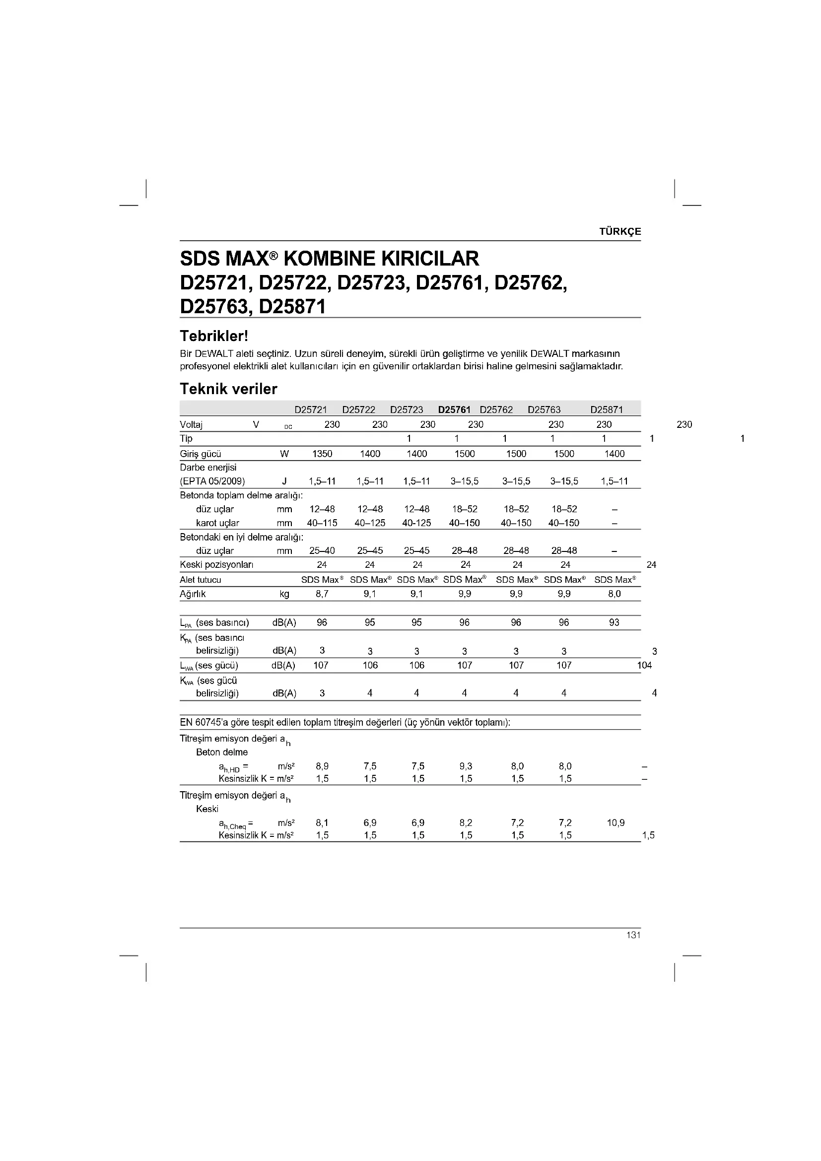 KOMBINE KIRICILAR D25721, D25722, D25723, D25761, D25762, D25763, D25871 Tebrikler! Bir DEWALT aleti seçtiniz. Uzun süreli deneyim, sürekli ürün geliştirme ve yenilik DEWALT markasının profesyonel elektrikli alet kullanıcıları için en güvenilir ortaklardan birisi haline gelmesini sağlamaktadır. Teknik veriler D25721 D25722 D25723 D25761 D25762 D25763 D25871 Voltaj V