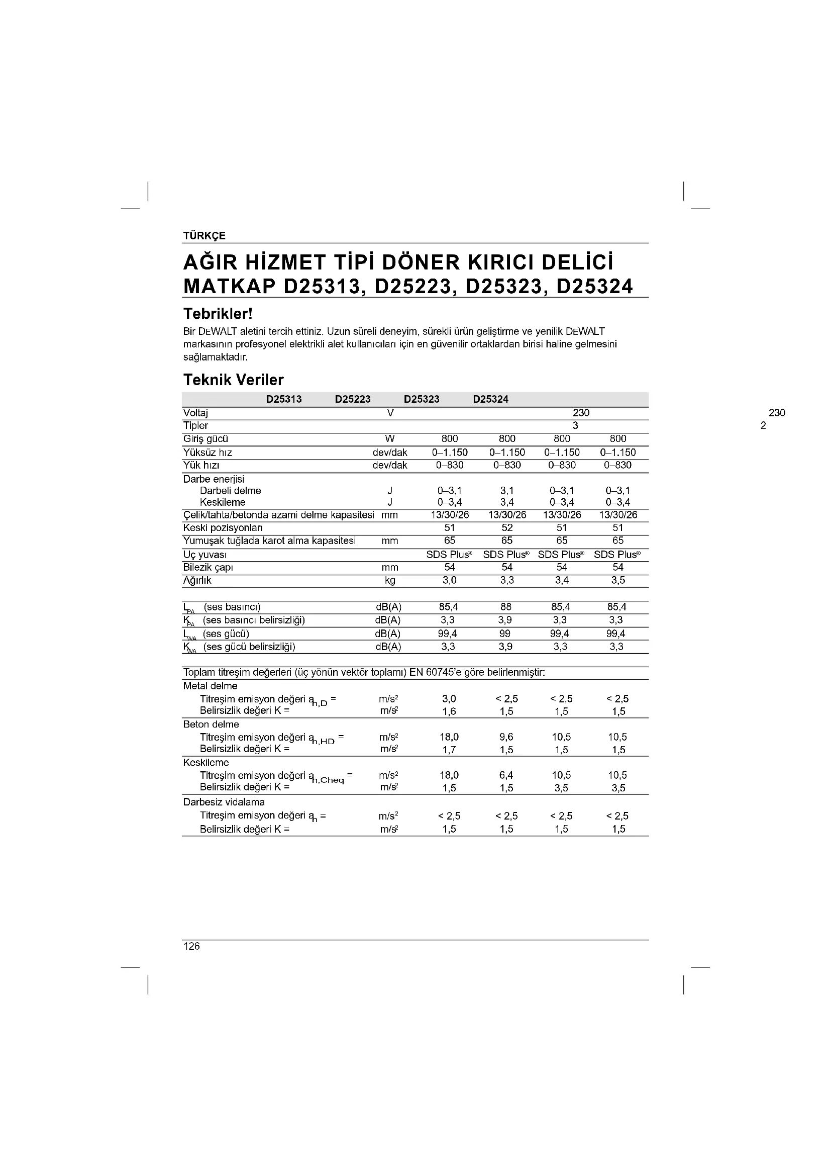 Tebrikler! Bir DEWALT aletini tercih ettiniz. Uzun süreli deneyim, sürekli ürün geliştirme ve yenilik DEWALT markasının profesyonel elektrikli alet kullanıcıları için en güvenilir ortaklardan birisi haline gelmesini sağlamaktadır. Teknik Veriler D25313 D25223 D25323 D25324 Voltaj V 230 230 230 230 Tipler 3 2 2 2 Giriş gücü W 800 800 800 800 Yüksüz hız dev/dak 0–1.150 0–1.150 0–1.150 0–1.150 Yük hızı dev/dak 0–830 0–830 0–830 0–830 Darbe enerjisi Darbeli delme J 0–3,1 3,1 0–3,1 0–3,1 Keskileme J 0–3,4 3,4 0–3,4 0–3,4 Çelik/tahta/betonda azami delme kapasitesi mm 13/30/26 13/30/26 13/30/26 13/30/26 Keski pozisyonları 51 52 51 51 Yumuşak tuğlada karot alma kapasitesi mm 65 65 65 65 Uç yuvası SDS Plus