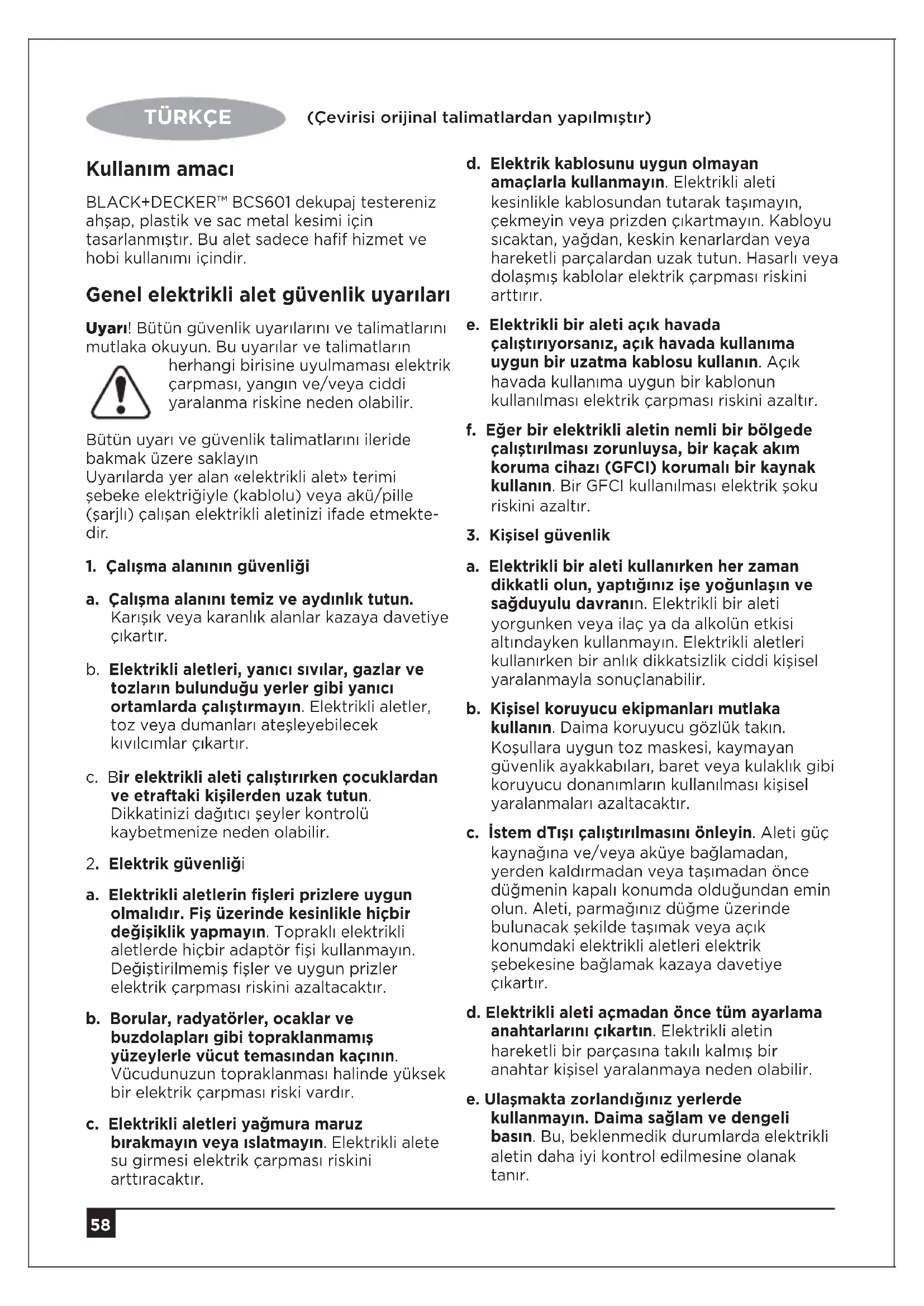 (Çevirisi orijinal talimatlardan yapılmıştır) Kullanım amacı BLACK+DECKER™ BCS601 dekupaj testereniz ahşap, plastik ve sac metal kesimi için tasarlanmıştır. Bu alet sadece hafif hizmet ve hobi kullanımı içindir. Genel elektrikli alet güvenlik uyarıları Uyarı! Bütün güvenlik uyarılarını ve talimatlarını mutlaka okuyun. Bu uyarılar ve talimatların herhangi birisine uyulmaması elektrik çarpması, yangın ve/veya ciddi yaralanma riskine neden olabilir. Bütün uyarı ve güvenlik talimatlarını ileride bakmak üzere saklayın Uyarılarda yer alan «elektrikli alet» terimi şebeke elektriğiyle (kablolu) veya akü/pille (şarjlı) çalışan elektrikli aletinizi ifade etmekte- dir.