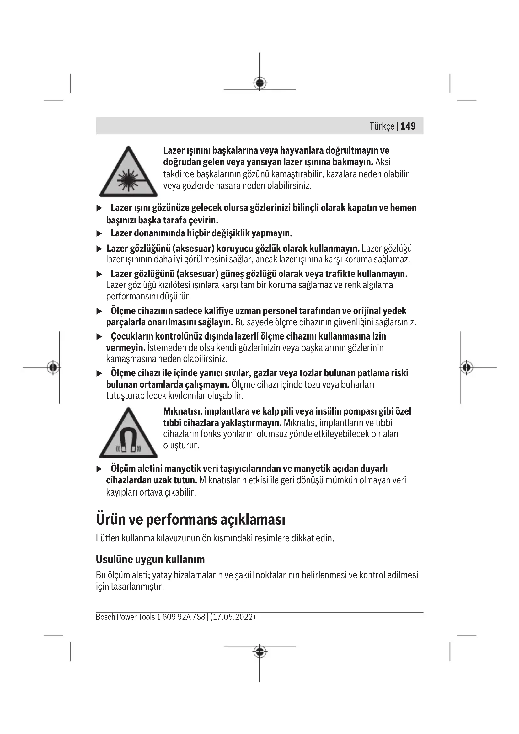 Τα όργανα μέτρησης, τα εξαρτήματα και οι συσκευασίες πρέπει να ανακυκλώνονται με τρόπο φιλικό προς το περιβάλλον. Bosch Power Tools 1 609 92A 7S8 | (17.05.2022)148 | Türkçe Μη ρίχνετε τα όργανα μέτρησης και τις μπαταρίες στα οικιακά απορρίμματα! Μόνο για χώρες τηςΕΕ: Σύμφωνα με την Ευρωπαϊκή οδηγία 2012/19/ΕΕ σχετικά με τις παλιές ηλεκτρικές και ηλε- κτρονικές συσκευές και τη μεταφορά της οδηγίας αυτής σε εθνικό δίκαιο τα άχρηστα όργα- να μέτρησης και σύμφωνα με την Ευρωπαϊκή οδηγία 2006/66/ΕΚ οι χαλασμένες ή χρησι- μοποιημένες μπαταρίες πρέπει να συλλέγονται ξεχωριστά, για να ανακυκλωθούν με τρόπο φιλικό προς το περιβάλλον. Σε περίπτωση μη ενδεδειγμένης απόσυρσης οι ηλεκτρικές και ηλεκτρονικές συσκευές λόγω ενδεχομένης παρουσίας επικίνδυνων ουσιών μπορούν να έχουν επιβλαβείς επιπτώσεις στο περιβάλλον και στην ανθρώπινη υγεία. Türkçe Güvenlik talimatı Ölçme cihazı ile tehlikesiz ve güvenli biçimde çalışabilmek için bütün güvenlik talimatı ve uyarılar okunmalıdır. Ölçme cihazı bu güvenlik talimatına uygun olarak kullanılmazsa, ölçme cihazına entegre koruyucu donanımların işlevi kısıtlanabilir. Ölçme cihazı üzerindeki uyarı etiketlerini hiçbir zaman görünmez duruma getirmeyin. BU TALİMATLARI İYİ VE GÜVENLİ BİR YERDE SAKLAYIN VE ÖLÇME CİHAZINI BAŞKASINA VERDİĞİNİZDE BUNLARI DA BİRLİKTE VERİN. u Dikkat – Burada anılan kullanım ve ayar donanımlarından farklı donanımlar veya farklı yöntemler kullanıldığı takdirde, tehlikeli ışın yayılımına neden olunabilir. u Bu ölçme cihazı bir lazer uyarı etiketi ile teslim edilir (ölçme cihazının resminin bulunduğu grafik sayfasında gösterilmektedir). u Lazer uyarı etiketindeki metin kendi dilinizde değilse, ilk kullanımdan önce cihaz ekinde teslim edilen kendi dilinizdeki lazer uyarı etiketini mevcut lazer uyarı etiketi üzerine yapıştırın. 1 609 92A 7S8 | (17.05.2022) Bosch Power ToolsTürkçe | 149 Lazer ışınını başkalarına veya hayvanlara doğrultmayın ve doğrudan gelen veya yansıyan lazer ışınına bakmayın. Aksi takdirde başkalarının gözünü kamaştırabilir, kazalara neden olabilir veya gözlerde hasara neden olabilirsiniz. u Lazer ışını gözünüze gelecek olursa gözlerinizi bilinçli olarak kapatın ve hemen başınızı başka tarafa çevirin. u Lazer donanımında hiçbir değişiklik yapmayın. u Lazer gözlüğünü (aksesuar) koruyucu gözlük olarak kullanmayın. Lazer gözlüğü lazer ışınının daha iyi görülmesini sağlar, ancak lazer ışınına karşı koruma sağlamaz. u Lazer gözlüğünü (aksesuar) güneş gözlüğü olarak veya trafikte kullanmayın. Lazer gözlüğü kızılötesi ışınlara karşı tam bir koruma sağlamaz ve renk algılama performansını düşürür. u Ölçme cihazının sadece kalifiye uzman personel tarafından ve orijinal yedek parçalarla onarılmasını sağlayın. Bu sayede ölçme cihazının güvenliğini sağlarsınız. u Çocukların kontrolünüz dışında lazerli ölçme cihazını kullanmasına izin vermeyin. İstemeden de olsa kendi gözlerinizin veya başkalarının gözlerinin kamaşmasına neden olabilirsiniz. u Ölçme cihazı ile içinde yanıcı sıvılar, gazlar veya tozlar bulunan patlama riski bulunan ortamlarda çalışmayın. Ölçme cihazı içinde tozu veya buharları tutuşturabilecek kıvılcımlar oluşabilir. Mıknatısı, implantlara ve kalp pili veya insülin pompası gibi özel tıbbi cihazlara yaklaştırmayın. Mıknatıs,implantların ve tıbbi cihazların fonksiyonlarını olumsuz yönde etkileyebilecek bir alan oluşturur. u Ölçüm aletini manyetik veri taşıyıcılarından ve manyetik açıdan duyarlı cihazlardan uzak tutun. Mıknatısların etkisi ile geri dönüşü mümkün olmayan veri kayıpları ortaya çıkabilir. Ürün ve performans açıklaması Lütfen kullanma kılavuzunun ön kısmındaki resimlere dikkat edin. Usulüne uygun kullanım Bu ölçüm aleti; yatay hizalamaların ve şakül noktalarının belirlenmesi ve kontrol edilmesi için tasarlanmıştır. Bosch Power Tools 1 609 92A 7S8 | (17.05.2022)150 | Türkçe Bu ölçme cihazı kapalı mekanlarda ve açık havada kullanılmaya uygundur. Şekli gösterilen elemanlar Şekli gösterilen elemanların numaraları ile grafik sayfasındaki ölçme cihazı resmindeki numaralar aynıdır. (1) Lazer ışını çıkış deliği (2) Açma/kapama şalteri (3) manyetik dönen platform (4) Tripod girişi 1/4" (5) Pil haznesi kapağı kilidi (6) Pil haznesi kapağı (7) Mıknatıs (8) Lazer uyarı etiketi (9) Seri numarası (10) Lazer gözlüğü