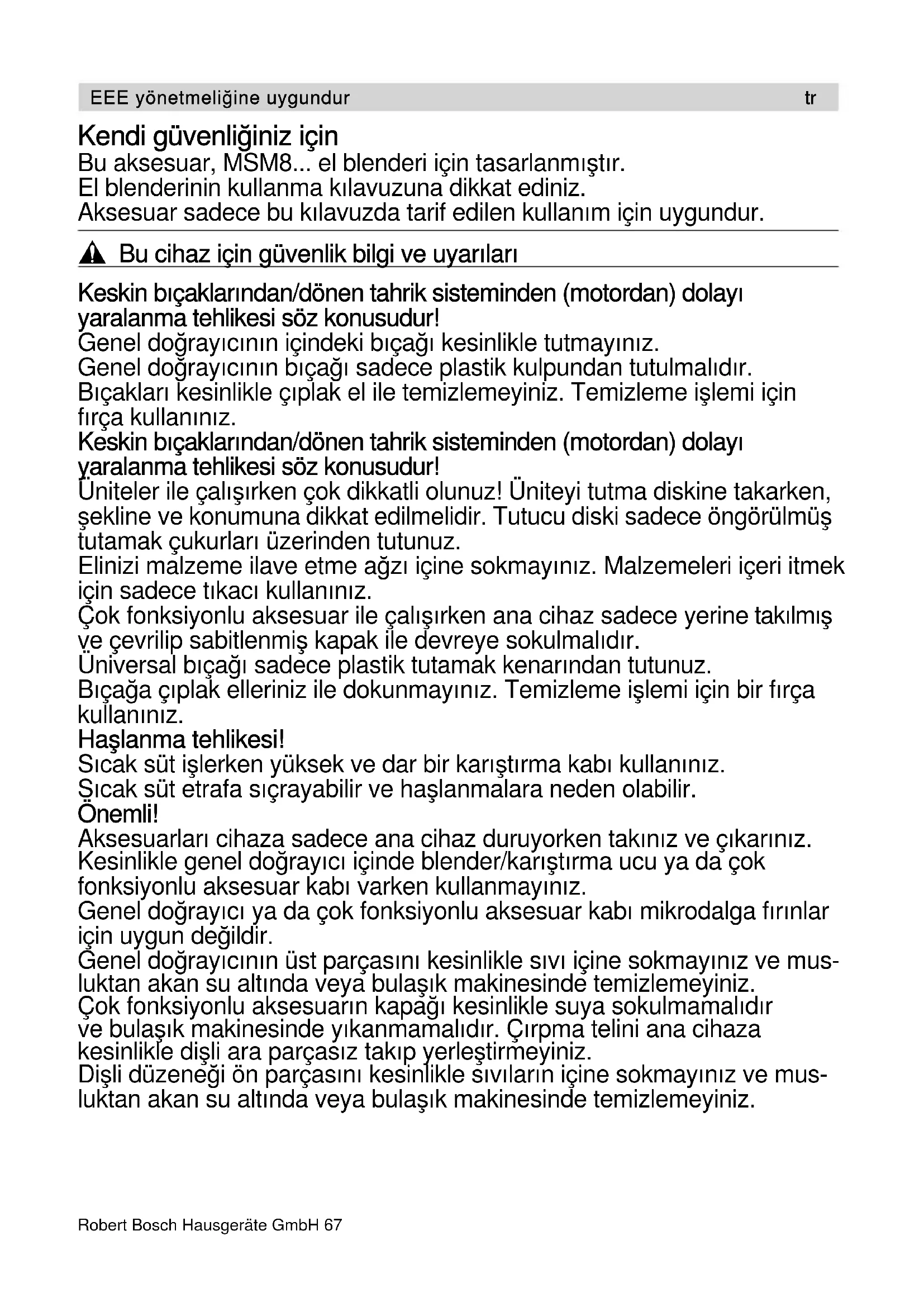 Τηρούμε το δικαίωμα αλλαγών.Robert Bosch Hausgeräte GmbH 67 Kendi güvenliğiniz için Bu aksesuar, MSM8... el blenderi için tasarlanmıştır. El blenderinin kullanma kılavuzuna dikkat ediniz. Aksesuar sadece bu kılavuzda tarif edilen kullanım için uygundur.