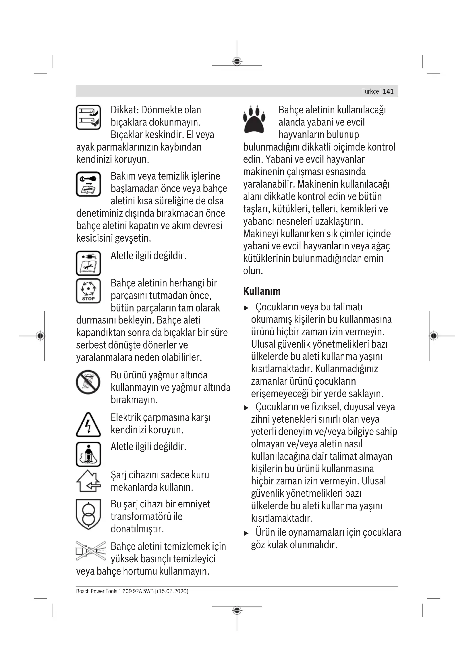 Τα μηχανήματα κήπου, οι μπαταρίες, τα εξαρτήματα και οι συσκευασίες πρέπει να ανακυκλώνονται με τρόπο φιλικό προς το περιβάλλον. Μην ρίξετε τα μηχανήματα κήπου και τις μπαταρίες στα απορρίμματα του σπιτιού σας! Μόνο για χώρες τηςΕΕ: Σύμφωνα με την Κοινοτική Οδηγία 2012/19/EE οι άχρηστες ηλεκτρικές και ηλεκτρονικές συσκευές και σύμφωνα με την Κοινοτική Οδηγία 2006/66/EΚ οι χαλασμένες ή αναλωμένες μπαταρίες πρέπει να συλλέγονται ξεχωριστά για να ανακυκλωθούν με τρόπο φιλικό προς το περιβάλλον. Μπαταρίες/Επαναφορτιζόμενες μπαταρίες: Μπαταρίες ιόντων λιθίου: Παρακαλούμε δώστε προσοχή στο κεφάλαιο Μεταφορά. Türkçe Güvenlik Talimatı Dikkat! Aşağıdaki talimatı dikkatlice okuyun. Kumanda elemanlarının işlevini ve ürünün usulüne uygun olarak kullanılmasını öğrenin. Bu kullanım kılavuzunu ileride başvurmak üzere güvenli bir yerde saklayın. Bahçe aleti üzerindeki sembollerin açıklaması Genel tehlike uyarısı. Kullanım kılavuzunu tam olarak okuyun. Çalışırken yakınınızda duran kişilerin etrafa savrulan yabancı cisimlerle yaralanmamasına dikkat edin. Uyarı: Ürün çalışır durumda iken aletle aranızda güvenli bir mesafe bırakın. 1 609 92A 5WB | (15.07.2020) Bosch Power ToolsTürkçe | 141 Dikkat: Dönmekte olan bıçaklara dokunmayın. Bıçaklar keskindir. El veya ayak parmaklarınızın kaybından kendinizi koruyun. Bakım veya temizlik işlerine başlamadan önce veya bahçe aletini kısa süreliğine de olsa denetiminiz dışında bırakmadan önce bahçe aletini kapatın ve akım devresi kesicisini gevşetin. Aletle ilgili değildir. Bahçe aletinin herhangi bir parçasını tutmadan önce, bütün parçaların tam olarak durmasını bekleyin. Bahçe aleti kapandıktan sonra da bıçaklar bir süre serbest dönüşte dönerler ve yaralanmalara neden olabilirler. Bu ürünü yağmur altında kullanmayın ve yağmur altında bırakmayın. Elektrik çarpmasına karşı kendinizi koruyun. Aletle ilgili değildir. Şarj cihazını sadece kuru mekanlarda kullanın. Bu şarj cihazı bir emniyet transformatörü ile donatılmıştır. Bahçe aletini temizlemek için yüksek basınçlı temizleyici veya bahçe hortumu kullanmayın. Bahçe aletinin kullanılacağı alanda yabani ve evcil hayvanların bulunup bulunmadığını dikkatli biçimde kontrol edin. Yabani ve evcil hayvanlar makinenin çalışması esnasında yaralanabilir. Makinenin kullanılacağı alanı dikkatle kontrol edin ve bütün taşları, kütükleri, telleri, kemikleri ve yabancı nesneleri uzaklaştırın. Makineyi kullanırken sık çimler içinde yabani ve evcil hayvanların veya ağaç kütüklerinin bulunmadığından emin olun. Kullanım u Çocukların veya bu talimatı okumamış kişilerin bu kullanmasına ürünü hiçbir zaman izin vermeyin. Ulusal güvenlik yönetmelikleri bazı ülkelerde bu aleti kullanma yaşını kısıtlamaktadır. Kullanmadığınız zamanlar ürünü çocukların erişemeyeceği bir yerde saklayın. u Çocukların ve fiziksel, duyusal veya zihni yetenekleri sınırlı olan veya yeterli deneyim ve/veya bilgiye sahip olmayan ve/veya aletin nasıl kullanılacağına dair talimat almayan kişilerin bu ürünü kullanmasına hiçbir zaman izin vermeyin. Ulusal güvenlik yönetmelikleri bazı ülkelerde bu aleti kullanma yaşını kısıtlamaktadır. u Ürün ile oynamamaları için çocuklara göz kulak olunmalıdır. Bosch Power Tools 1 609 92A 5WB | (15.07.2020)142 | Türkçe u Bahçe aletini özellikle çocukların ve evcil hayvanların çok yakınında kullanmayın. u Bu aleti kullananlar başkalarının başına gelebilecek kazalardan veya bunların özel mülkiyetinde bulunan mallarda meydana gelebilecek hasarlardan sorumludur. u Bu ürünü kullanırken açık lastik ayakkabılar veya sandaletler kullanmayın. Sağlam iş ayakkabıları ve uzun pantolon kullanın. Bu ürünü hiçbir zaman çıplak ayakla kullanmayın. u İşleyeceğiniz yüzeyi dikkatli biçimde inceleyin ve taş, dal, tel, kemik ve benzeri yabancı nesneleri temizleyin. u Aleti kullanmaya başlamadan önce daima bıçakların, bıçak cıvatalarının veya kesme modülünün aşınmış veya hasarlı olup olmadığını kontrol edin. Balanssız çalışmayı önlemek için aşınmış veya hasar görmüş bıçakları ve bıçak cıvatalarını her zaman takım halinde değiştirin. u Sadece gün ışığında veya iyi aydınlatma koşullarında biçme yapın. u Elverişsiz hava koşullarında, özellikle fırtına ve sağanak yağış beklenirken çim biçme makinesi ile çalışmayın. u Bahçe aletini mümkün olduğu kadar ıslak çimlerde kullanmayın. u Her zaman sakin çalışın, acele etmeyin. u Bahçe aletini arızalı koruma donanımlarıyla, kapaklarla ve örneğin çarpma emniyeti ve/veya çim tutma selesi gibi emniyet donanımları olmadan kullanmayın. u Kendi sağlığınız açısından koruyucu kulaklık kullanmanızı tavsiye ederiz. u Yorgun veya hastaysanız veya alkol, hap veya aldığınız ilaçların etkisi altındaysanız ürünü kullanmayın. u Meyilli yüzeylerde çalışmak tehlikeli olabilir: –Çok meyilli yüzeylerde biçme yapmayın. –Meyilli yüzeylerde veya ıslak çimlerde yere sağlam basmaya dikkat edin. –Dik yüzeylerde her zaman enine biçme yapın, aşağı yukarı yapmayın. –Dik yerlerde yön değiştirirken özellikle dikkatli olun. u Geriye doğru giderken veya bahçe aletini çekerken çok dikkatli olun. u Biçme yaparken bahçe aletini d