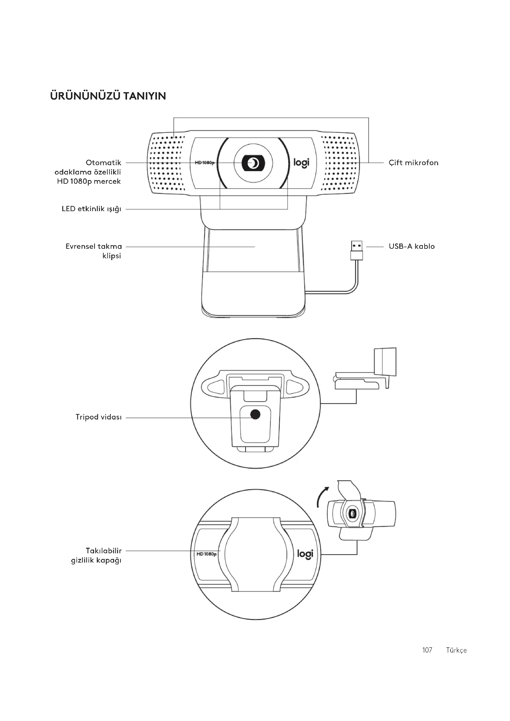 Web kamerası br uygulama tarafından kullanıldığında LED etknlk ışığı yanar. SABİT MONTAJ KLİPSİ İLE BİRLİKTE: Yükseklk x Genşlk x Dernlk: 1,70 nç (43,3 mm) x 3,70 nç (94 mm) x 2,80 nç (71 mm) Kablo Uzunluğu: 1,5 m (5 ft) Ağırlık: 162 g (5,71 ons) BOYUTLAR www.logitech.com/support/C920e © 2020 Logitech, Logi ve Logitech logosu, ABD ve diğer ülkelerde Logitech Europe S.A.’nın ve/veyabağlı kuruluşlarının ticari veya tescilli ticari markalarıdır. Logitech bu kılavuzda bulunabilecekhatalar için hiçbir sorumluluk kabul etmez. Burada bulunan bilgiler önceden haber verilmeksizin değiştirilebilir.1080