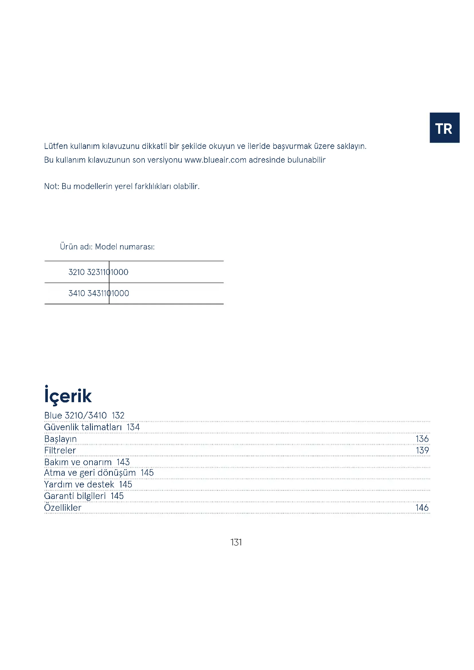 Önemli! Hava temizleyicisin uygun calismasini ve performansini saglamak ve tam garanti kapsami kazanmak icin modele uygun yalinizca original Blueair filtrleri kullanin.
