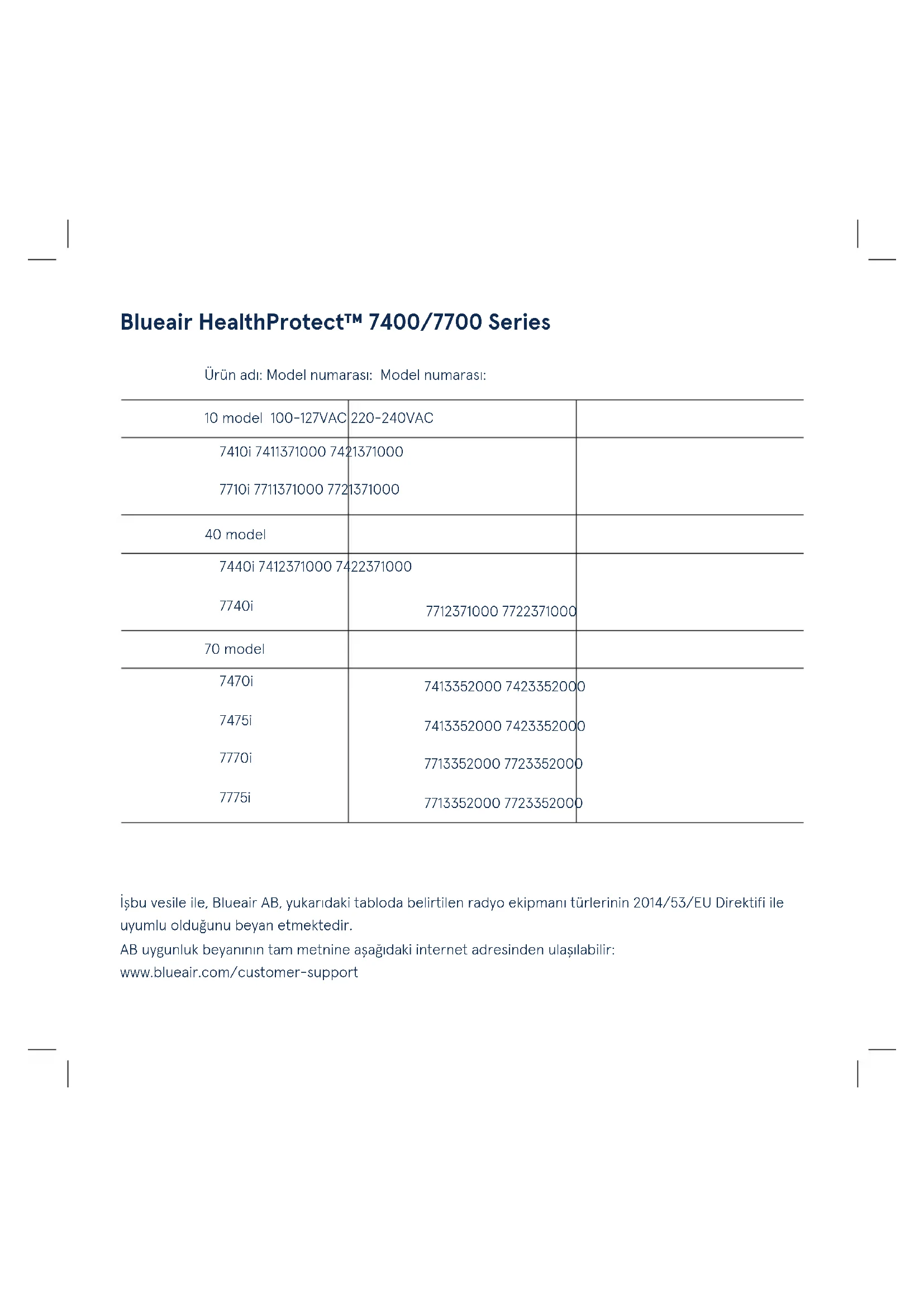 U skladu sa standardom ANSI/AHAM AC-1-2019195İşbu vesile ile, Blueair AB, yukarıdaki tabloda belirtilen radyo ekipmanı türlerinin 2014/53/EU Direktifi ile uyumlu olduğunu beyan etmektedir. AB uygunluk beyanının tam metnine aşağıdaki internet adresinden ulaşılabilir: www.blueair.com/customer-support Ürün adı: Model numarası: Model numarası: 10 model 100-127VAC 220-240VAC 7410i 7411371000 7421371000 7710i 7711371000 7721371000 40 model 7440i 7412371000 7422371000 7740i