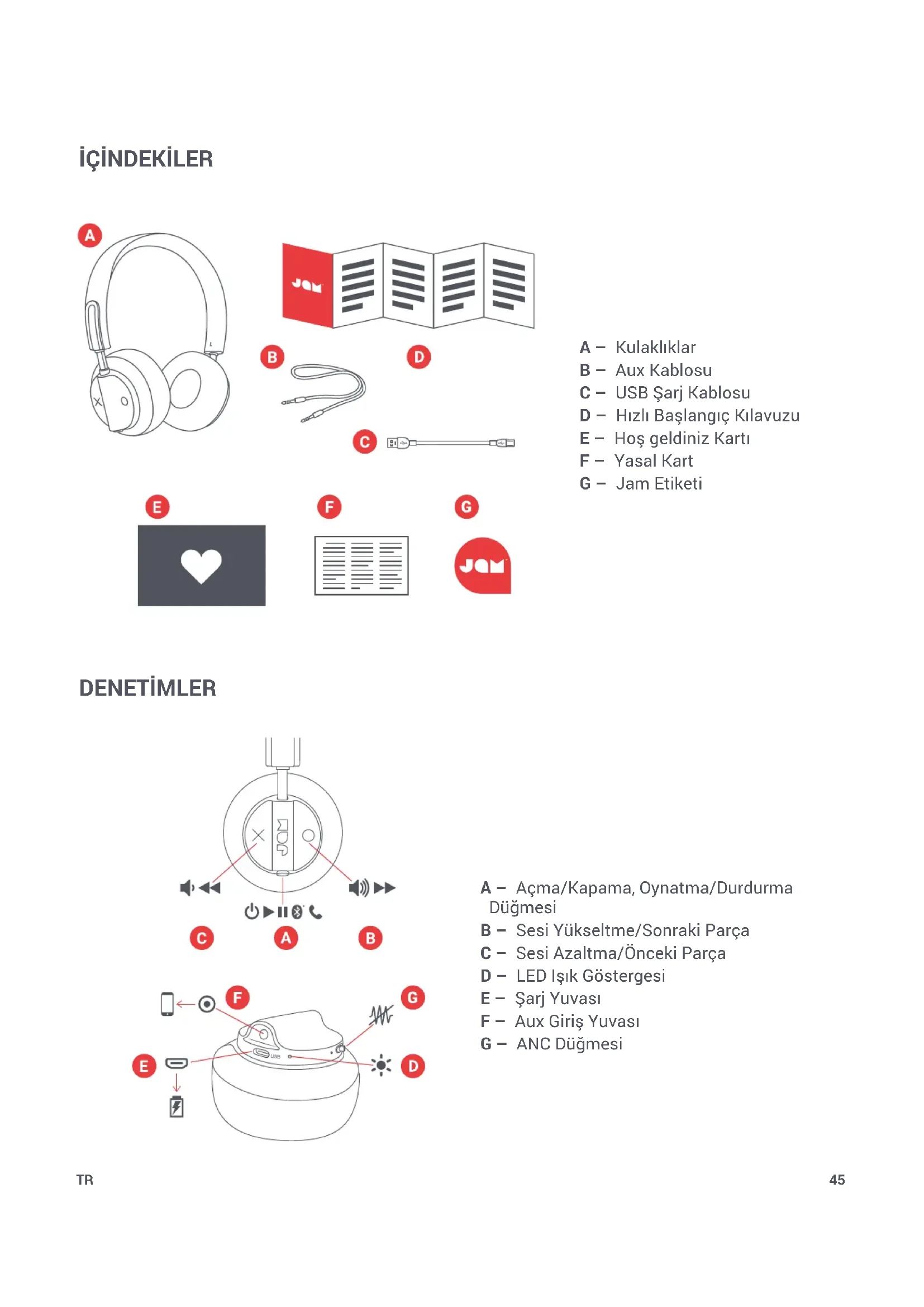 Kaikki oikeudet pidätetään. IB-HXHP303EN 44 “Out There” HX-HP303 Talimat Kitabı45 İÇİNDEKİLER A – Kulaklıklar B – Aux Kablosu C – USB Şarj Kablosu D – Hızlı Başlangıç Kılavuzu E – Hoş geldiniz Kartı F – Yasal Kart G – Jam Etiketi DENETİMLER A – Açma/Kapama, Oynatma/Durdurma Düğmesi B – Sesi Yükseltme/Sonraki Parça C – Sesi Azaltma/Önceki Parça D – LED Işık Göstergesi E – Şarj Yuvası F – Aux Giriş Yuvası G – ANC Düğmesi TR46 KURULUM KULLANIM