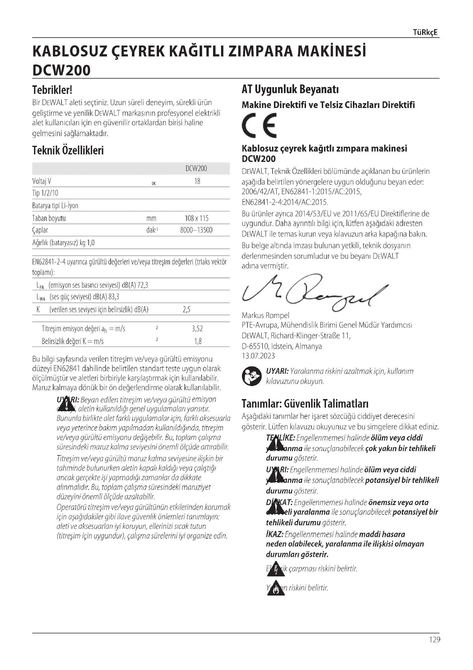 DİKKAT: Engellenmemesi halinde önemsiz veya orta dereceli yaralanma ile sonuçlanabilecek potansiyel bir tehlikeli durumugösterir. İKAZ: Engellenmemesi halinde maddi hasara neden olabilecek, yaralanma ile ilişkisi olmayan durumlarıgösterir. Elektrik çarpması riskinibelirtir. Yangın riskinibelirtir. AT Uygunluk Beyanatı Makine Direktifi ve Telsiz Cihazları Direktifi Kablosuz çeyrek kağıtlı zımpara makinesi DCW200 DeWALT, Teknik Özellikleri bölümünde açıklanan bu ürünlerin aşağıda belirtilen yönergelere uygun olduğunu beyan eder: 2006/42/AT, EN62841-1:2015/AC:2015, EN62841-2-4:2014/AC:2015.Bu ürünler ayrıca 2014/53/EU ve 2011/65/EU Direktiflerine de uygundur. Daha ayrıntılı bilgi için, lütfen aşağıdaki adresten DeWALT ile temas kurun veya kılavuzun arka kapağınabakın.Bu belge altında imzası bulunan yetkili, teknik dosyanın derlenmesinden sorumludur ve bu beyanı DeWALT adınavermiştir.Markus Rompel PTE-Avrupa, Mühendislik Birimi Genel Müdür Yardımcısı DeWALT, Richard-Klinger-Straße 11, D-65510, Idstein, Almanya 13.07.2023Bu bilgi sayfasında verilen titreşim ve/veya gürültü emisyonu düzeyi 62841 dahilinde belirtilen standart teste uygun olarak ölçülmüştür ve aletleri birbiriyle karşılaştırmak için kullanılabilir. Maruz kalmaya dönük bir ön değerlendirme olarakkullanılabilir. UYARI: Beyan edilen titreşim ve/veya gürültü emisyon düzeyi, aletin kullanıldığı genel uygulamaları yansıtır. Bununla birlikte alet farklı uygulamalar için, farklı aksesuarla veya yeterince bakım yapılmadan kullanıldığında, titreşim ve/veya gürültü emisyonu değişebilir. Bu, toplam çalışma süresindeki maruz kalma seviyesini önemli ölçüdeartırabilir.Titreşim ve/veya gürültü maruz kalma seviyesine ilişkin bir tahminde bulunurken aletin kapalı kaldığı veya çalıştığı ancak gerçekte işi yapmadığı zamanlar da dikkate alınmalıdır. Bu, toplam çalışma süresindeki maruziyet düzeyini önemli ölçüdeazaltabilir.Operatörü titreşim ve/veya gürültünün etkilerinden korumak için aşağıdakiler gibi ilave güvenlik önlemleri tanımlayın: aleti ve aksesuarları iyi koruyun, ellerinizi sıcak tutun (titreşim için uygundur), çalışma sürelerini iyi organizeedin.DCW200Voltaj V