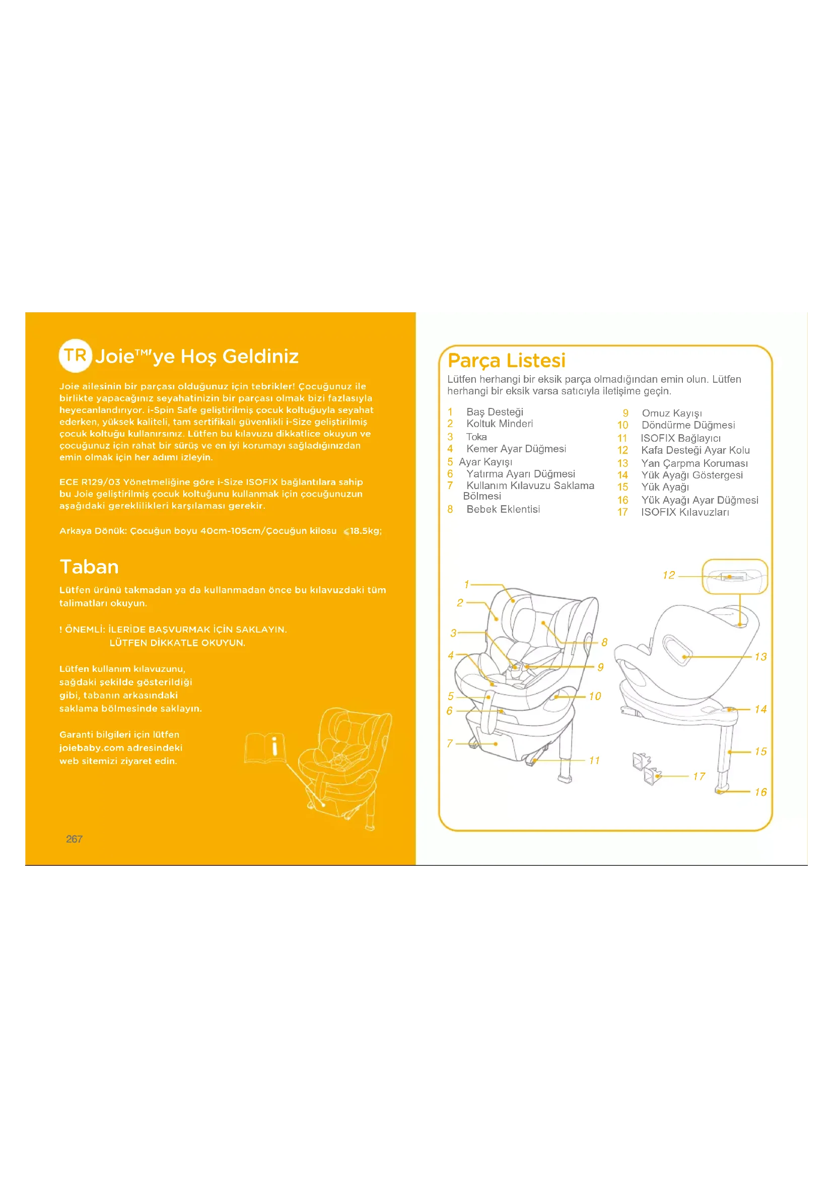 ! Vyjměteklínzvložkyauložtejejmimodosahdětí. ! Potahsedačkyavnitřnípolstrovánípertevestudenévodědo30°C. ! Látkovéčástinežehlete. ! Nalátkovéčástinepoužívejtebělidloanijenečistětezasucha. ! Kmytítétovylepšenédětskéautosedačkynebozákladny nepoužívejtenezředěnéčisticíprostředky,benzínanijináorganická rozpouštědla.Mohlobydojítkpoškozenítétovylepšenédětské autosedačky. ! Potahsedačkyanivnitřnípolstrováníneždímejte.Mohlobytona potahusedačkynebovnitřnímpolstrovánízanechatzáhyby. ! Potahsedačkyavnitřnípolstrovánínechtevyschnoutzavěšenéve stínu. ! Pokudvylepšenoudětskouautosedačkuazákladnudelšídobu nepoužíváte,vyjmětejezvozidla.Vylepšenoudětskouautosedačku skladujtenachladnémasuchémmístěmimodosahdětí. ! Přičištěnísinehrajteskonektorypostroje. Péče a údržba266 267 Joie™'ye Hoş Geldiniz Joie ailesinin bir parçası olduğunuz için tebrikler! Çocuğunuz ile birlikte yapacağınız seyahatinizin bir parçası olmak bizi fazlasıyla heyecanlandırıyor. i-Spin Safe geliştirilmiş çocuk koltuğuyla seyahat ederken, yüksek kaliteli, tam sertifikalı güvenlikli i-Size geliştirilmiş çocuk koltuğu kullanırsınız. Lütfen bu kılavuzu dikkatlice okuyun ve çocuğunuz için rahat bir sürüş ve en iyi korumayı sağladığınızdan emin olmak için her adımı izleyin.ECE R129/03 Yönetmeliğine göre i-Size ISOFIX bağlantılara sahip bu Joie geliştirilmiş çocuk koltuğunu kullanmak için çocuğunuzun aşağıdaki gereklilikleri karşılaması gerekir.Arkaya Dönük: Çocuğun boyu 40cm-105cm/Çocuğun kilosu18.5kg; Taban Lütfen ürünü takmadan ya da kullanmadan önce bu kılavuzdaki tüm talimatları okuyun.! ÖNEMLİ: İLERİDE BAŞVURMAK İÇİN SAKLAYIN.LÜTFEN DİKKATLE OKUYUN.Lütfen kullanım kılavuzunu, sağdaki şekilde gösterildiği gibi, tabanın arkasındaki saklama bölmesinde saklayın.Garanti bilgileri için lütfen joiebaby.com adresindeki web sitemizi ziyaret edin. Parça Listesi 1 BaşDesteği2 KoltukMinderi3 Toka4 KemerAyarDüğmesi5 AyarKayışı6 YatırmaAyarıDüğmesi7 KullanımKılavuzuSaklamaBölmesi8 BebekEklentisi 9 OmuzKayışı10 DöndürmeDüğmesi11 ISOFIXBağlayıcı12 KafaDesteğiAyarKolu13 YanÇarpmaKoruması14 YükAyağıGöstergesi15 YükAyağı16 YükAyağıAyarDüğmesi17 ISOFIXKılavuzlarıLütfenherhangibireksikparçaolmadığındaneminolun.Lütfenherhangibireksikvarsasatıcıylailetişimegeçin.