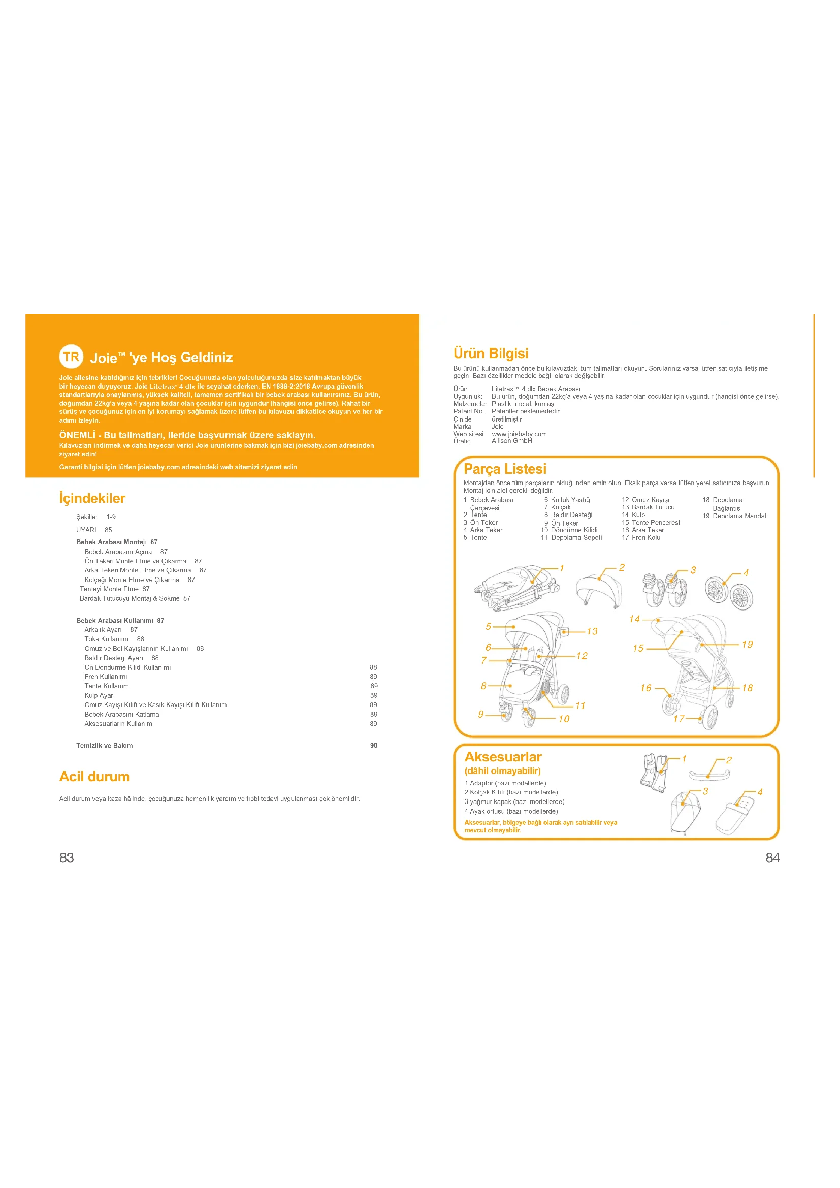 'ye Hoş Geldiniz Joie ailesine katıldığınız için tebrikler! Çocuğunuzla olan yolculuğunuzda size katılmaktan büyük bir heyecan duyuyoruz. Joie Litetrax 4 dlx ile seyahat ederken, EN 1888-2:2018 Avrupa güvenlik standartlarıyla onaylanmış, yüksek kaliteli, tamamen sertifikalı bir bebek arabası kullanırsınız. Bu ürün, doğumdan 22kg’a veya 4 yaşına kadar olan çocuklar için uygundur (hangisi önce gelirse). Rahat bir sürüş ve çocuğunuz için en iyi korumayı sağlamak üzere lütfen bu kılavuzu dikkatlice okuyun ve her bir adımı izleyin. ÖNEMLİ - Bu talimatları, ileride başvurmak üzere saklayın. Kılavuzları indirmek ve daha heyecan verici Joie ürünlerine bakmak için bizi joiebaby.com adresinden ziyaret edin!Garanti bilgisi için lütfen joiebaby.com adresindeki web sitemizi ziyaret edin İçindekiler Şekiller 1-9UYARI 85Bebek Arabası Montajı 87 BebekArabasınıAçma 87 ÖnTekeriMonteEtmeveÇıkarma 87 ArkaTekeriMonteEtmeveÇıkarma 87 KolçağıMonteEtmeveÇıkarma 87 Tenteyi Monte Etme 87 Bardak Tutucuyu Montaj & Sökme 87 Bebek Arabası Kullanımı 87 ArkalıkAyarı 87 TokaKullanımı 88 OmuzveBelKayışlarınınKullanımı 88 BaldırDesteğiAyarı 88 ÖnDöndürmeKilidiKullanımı 88 FrenKullanımı 89 TenteKullanımı 89 KulpAyarı 89 OmuzKayışıKılıfıveKasıkKayışıKılıfıKullanımı 89 BebekArabasınıKatlama 89 AksesuarlarınKullanımı 89 Temizlik ve Bakım 90 Acil durum Acildurumveyakazahâlinde,çocuğunuzahemenilkyardımvetıbbitedaviuygulanmasıçokönemlidir. Ürün Bilgisi Buürünükullanmadanöncebukılavuzdakitümtalimatlarıokuyun.Sorularınızvarsalütfensatıcıylailetişimegeçin.Bazıözelliklermodelebağlıolarakdeğişebilir.Ürün Litetrax™4dlxBebekArabası Uygunluk: Buürün,doğumdan22kg’aveya4yaşınakadarolançocuklariçinuygundur(hangisiöncegelirse). Malzemeler Plastik,metal,kumaşPatent No. Patentler beklemededirÇin'de üretilmiştirMarka JoieWebsitesi www.joiebaby.comÜretici Allison GmbH1 BebekArabasıÇerçevesi2 Tente3 ÖnTeker4 ArkaTeker5 Tente6 KoltukYastığı7 Kolçak8 BaldırDesteği 9 Ön Teker10 DöndürmeKilidi11 DepolamaSepeti12 OmuzKayışı13 BardakTutucu14 Kulp15 TentePenceresi16 ArkaTeker17 FrenKolu18 DepolamaBağlantısı19 DepolamaMandalı Parça Listesi Montajdanöncetümparçalarınolduğundaneminolun.Eksikparçavarsalütfenyerelsatıcınızabaşvurun.Montajiçinaletgereklideğildir. Aksesuarlar (dâhil olmayabilir) 1Adaptör(bazımodellerde)2KolçakKılıfı(bazımodellerde)3yağmurkapak(bazımodellerde)4Ayakortusu(bazımodellerde)Aksesuarlar, bölgeye bağlı olarak ayrı satılabilir veya mevcut olmayabilir.