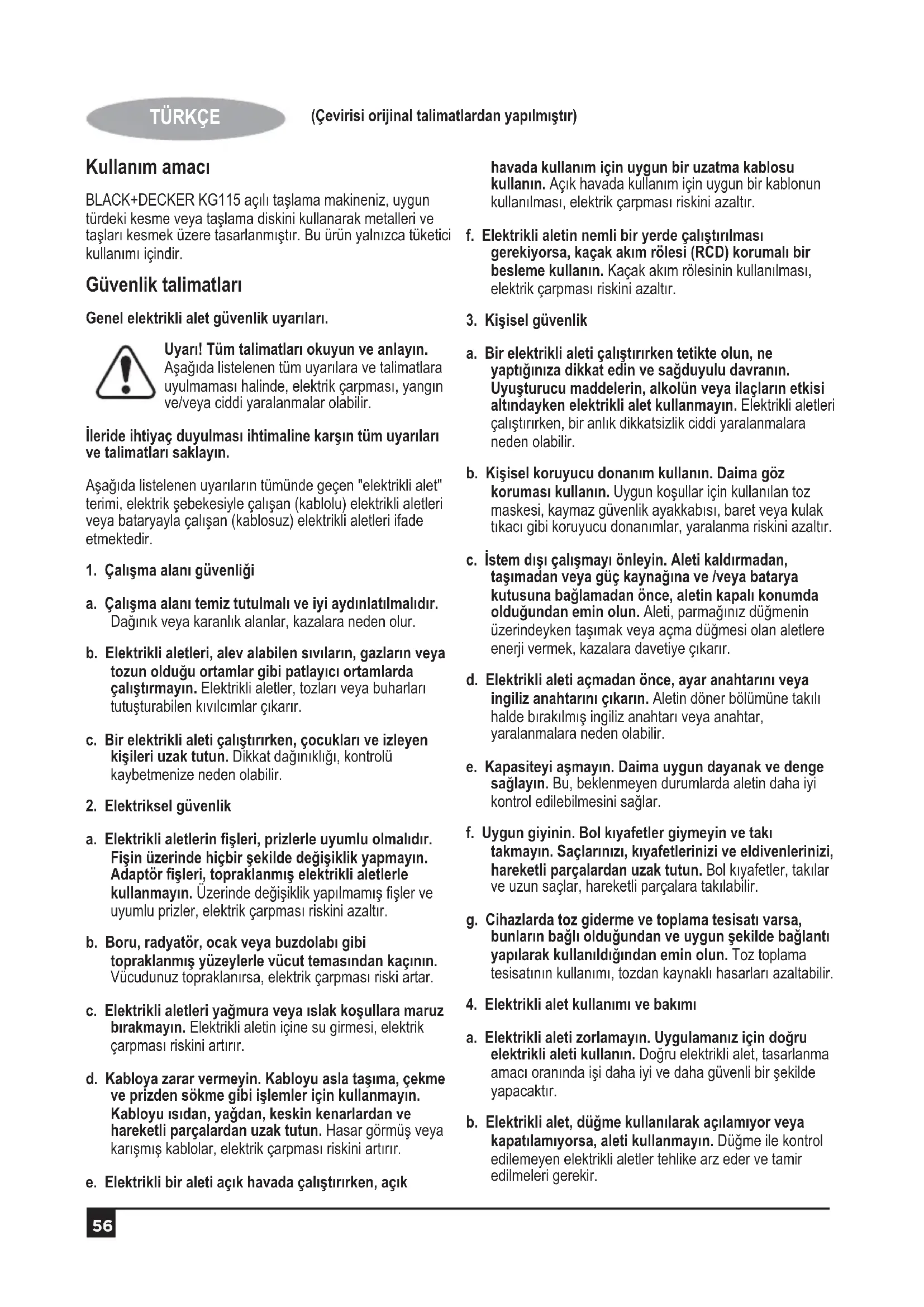 (Çevirisi orijinal talimatlardan yapılmıştır) Kullanım amacı BLACK+DECKER KG115 açılı taşlama makineniz, uygun türdeki kesme veya taşlama diskini kullanarak metalleri ve taşları kesmek üzere tasarlanmıştır. Bu ürün yalnızca tüketici kullanımı içindir. Güvenlik talimatları Genel elektrikli alet güvenlik uyarıları. Uyarı! Tüm talimatları okuyun ve anlayın. Aşağıda listelenen tüm uyarılara ve talimatlara uyulmaması halinde, elektrik çarpması, yangın ve/veya ciddi yaralanmalar olabilir. İleride ihtiyaç duyulması ihtimaline karşın tüm uyarıları ve talimatları saklayın. Aşağıda listelenen uyarıların tümünde geçen "elektrikli alet" terimi, elektrik şebekesiyle çalışan (kablolu) elektrikli aletleri veya bataryayla çalışan (kablosuz) elektrikli aletleri ifade etmektedir.