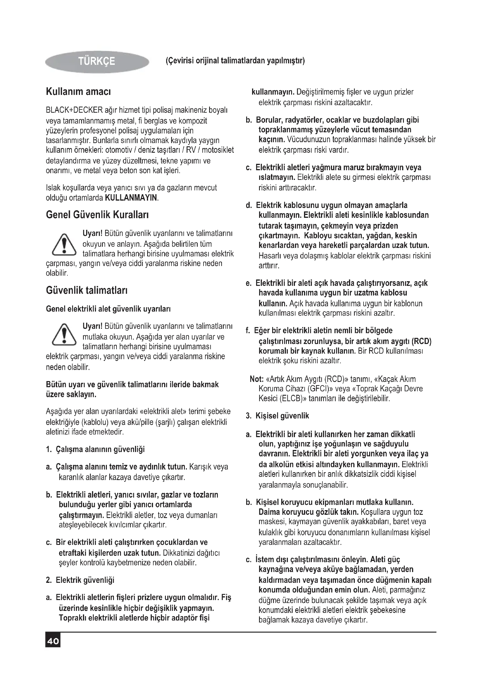- Bu elektrikli alet bir polisaj makinesi olarak kullanilmak üzere tasaranmistr. Bu elektrikli alet ile verilen:tüm Güvenlik uyarılari, talimatlar, resimli acıklamalar ve teknik Özellikleri okuyun. Aşaqida belirtilen:tüm talimatlarin herhangi birisine uyumlaması elektrikçarpması, yangın ve/veya ciddi yaralanma riskine neden olabilir.