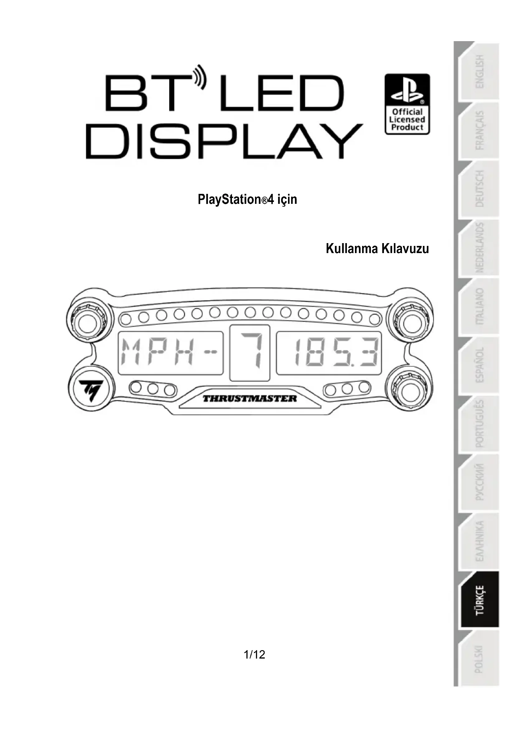 - Ayrı olarak satılır Bununla ilgili daha fazla bilgi için bkz.: http://support.thrustmaster.com. Racing wheels / BT LED DISPLAY, ardından User manual veya FAQ'yı seçin.9/12 BT LED DISPLAY'İN DONANIM YAZILIMININ GÜNCELLENMESİ BT LED DISPLAY'de yer alan her iki donanım yazılımı (genel donanım yazılımı ve Bluetooth donanım yazılımı) ürün iyileştirmeleri içeren en son sürümlerle güncellenebilir. BT LED DISPLAY'inizin donanım yazılımı sürümlerini görmek ve gerekirse güncellemek için: bilgisayarda http://support.thrustmaster.com adresine gidin, Racing wheels / BT LED DISPLAY'i seçin, ardından Firmware'i seçerek talimatları ve indirme ve yükleme prosedürünü izleyin.