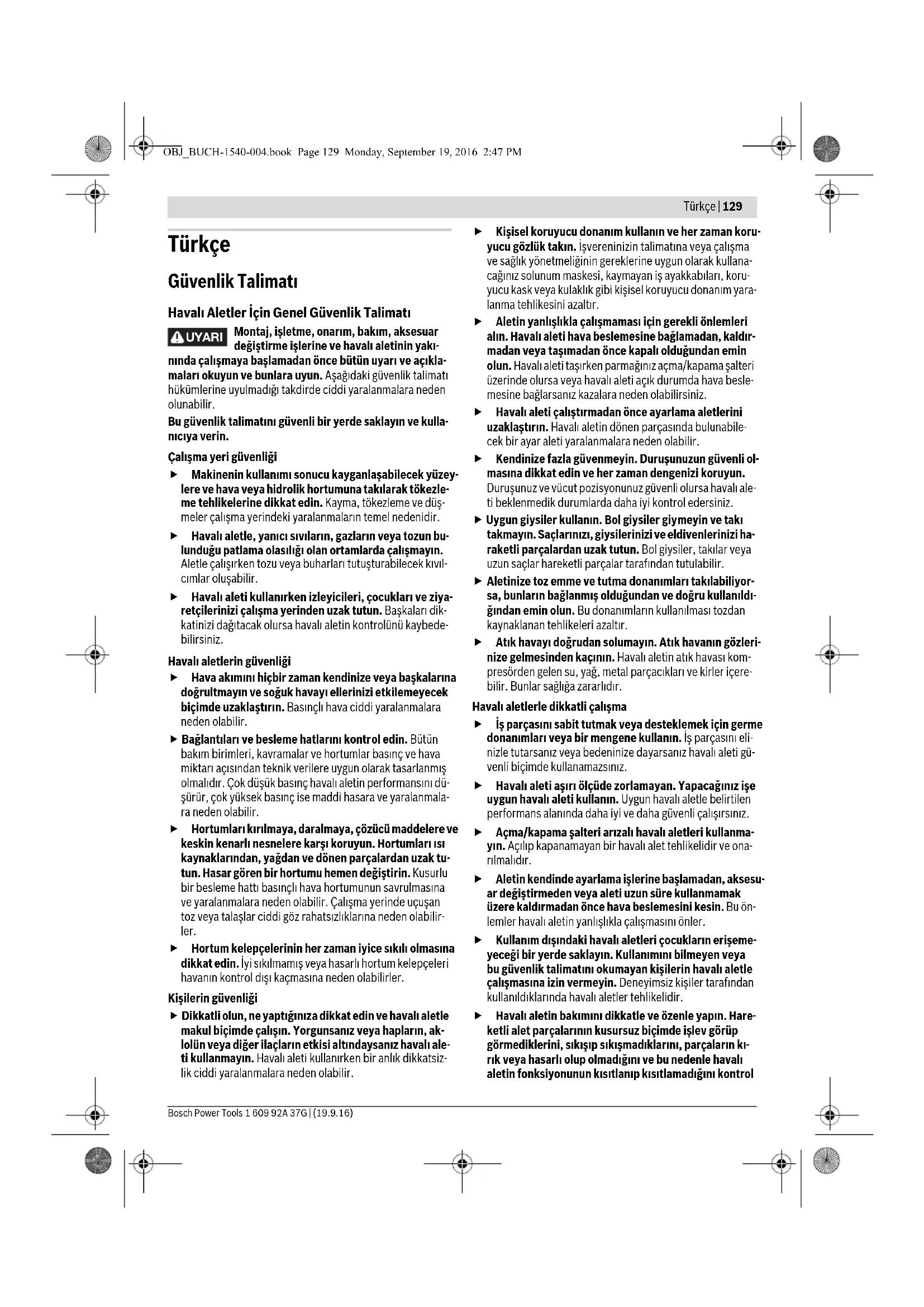 Τα εργαλεία αέρος, τα εξαρτήματα και οι συσκευασίες πρέπει να ανακυκλώνονται με τρόπο φιλικό προς το περιβάλλον. Να αποσύρετε τα υλικά λίπανσης και καθαρισμού με τρό- πο φιλικό προς το περιβάλλον. Να λαμβάνετε υπόψη σας τις σχετικές νομικές διατάξεις. Να αποσύρετε κανονικά τα ελάσματα του κινητήρα! Τα ελάσματα του κινητήρα περιέχουν Teflon. Μην τα θερμάνετε περισσότερο από 400 °C, διαφορετικά μπορεί να δημιουρ- γηθούν ανθυγιεινές αναθυμιάσεις. Όταν το εργαλείο αέρος αχρηστευτεί, πρέπει να προσκομιστεί σε ένα κέντρο ανακύκλωσης υλικών ή να επιστραφεί στο εμπό- ριο ή σε ένα εξουσιοδοτημένο κατάστημα Service της Bosch. Τηρούμε το δικαίωμα αλλαγών. OBJ_BUCH-1540-004.book Page 128 Monday, September 19, 2016 2:47 PMTürkçe | 129 Bosch Power Tools 1 609 92A 37G | (19.9.16) Türkçe Güvenlik Talimatı Havalı Aletler İçin Genel Güvenlik Talimatı Montaj, işletme, onarım, bakım, aksesuar değiştirme işlerine ve havalı aletinin yakı- nında çalışmaya başlamadan önce bütün uyarı ve açıkla- maları okuyun ve bunlara uyun. Aşağıdaki güvenlik talimatı hükümlerine uyulmadığı takdirde ciddi yaralanmalara neden olunabilir. Bu güvenlik talimatını güvenli bir yerde saklayın ve kulla- nıcıya verin. Çalışma yeri güvenliği Makinenin kullanımı sonucu kayganlaşabilecek yüzey- lere ve hava veya hidrolik hortumuna takılarak tökezle- me tehlikelerine dikkat edin. Kayma, tökezleme ve düş- meler çalışma yerindeki yaralanmaların temel nedenidir. Havalı aletle, yanıcı sıvıların, gazların veya tozun bu- lunduğu patlama olasılığı olan ortamlarda çalışmayın. Aletle çalışırken tozu veya buharları tutuşturabilecek kıvıl- cımlar oluşabilir. Havalı aleti kullanırken izleyicileri, çocukları ve ziya- retçilerinizi çalışma yerinden uzak tutun. Başkaları dik- katinizi dağıtacak olursa havalı aletin kontrolünü kaybede- bilirsiniz. Havalı aletlerin güvenliği Hava akımını hiçbir zaman kendinize veya başkalarına doğrultmayın ve soğuk havayı ellerinizi etkilemeyecek biçimde uzaklaştırın. Basınçlı hava ciddi yaralanmalara neden olabilir. Bağlantıları ve besleme hatlarını kontrol edin. Bütün bakım birimleri, kavramalar ve hortumlar basınç ve hava miktarı açısından teknik verilere uygun olarak tasarlanmış olmalıdır. Çok düşük basınç havalı aletin performansını dü- şürür, çok yüksek basınç ise maddi hasara ve yaralanmala- ra neden olabilir. Hortumları kırılmaya, daralmaya, çözücü maddelere ve keskin kenarlı nesnelere karşı koruyun. Hortumları ısı kaynaklarından, yağdan ve dönen parçalardan uzak tu- tun. Hasar gören bir hortumu hemen değiştirin. Kusurlu bir besleme hattı basınçlı hava hortumunun savrulmasına ve yaralanmalara neden olabilir. Çalışma yerinde uçuşan toz veya talaşlar ciddi göz rahatsızlıklarına neden olabilir- ler. Hortum kelepçelerinin her zaman iyice sıkılı olmasına dikkat edin. İyi sıkılmamış veya hasarlı hortum kelepçeleri havanın kontrol dışı kaçmasına neden olabilirler. Kişilerin güvenliği Dikkatli olun, ne yaptığınıza dikkat edin ve havalı aletle makul biçimde çalışın. Yorgunsanız veya hapların, ak- lolün veya diğer ilaçların etkisi altındaysanız havalı ale- ti kullanmayın. Havalı aleti kullanırken bir anlık dikkatsiz- lik ciddi yaralanmalara neden olabilir. Kişisel koruyucu donanım kullanın ve her zaman koru- yucu gözlük takın. İşvereninizin talimatına veya çalışma ve sağlık yönetmeliğinin gereklerine uygun olarak kullana- cağınız solunum maskesi, kaymayan iş ayakkabıları, koru- yucu kask veya kulaklık gibi kişisel koruyucu donanım yara- lanma tehlikesini azaltır. Aletin yanlışlıkla çalışmaması için gerekli önlemleri alın. Havalı aleti hava beslemesine bağlamadan, kaldır- madan veya taşımadan önce kapalı olduğundan emin olun. Havalı aleti taşırken parmağınız açma/kapama şalteri üzerinde olursa veya havalı aleti açık durumda hava besle- mesine bağlarsanız kazalara neden olabilirsiniz. Havalı aleti çalıştırmadan önce ayarlama aletlerini uzaklaştırın. Havalı aletin dönen parçasında bulunabile- cek bir ayar aleti yaralanmalara neden olabilir. Kendinize fazla güvenmeyin. Duruşunuzun güvenli ol- masına dikkat edin ve her zaman dengenizi koruyun. Duruşunuz ve vücut pozisyonunuz güvenli olursa havalı ale- ti beklenmedik durumlarda daha iyi kontrol edersiniz. Uygun giysiler kullanın. Bol giysiler giymeyin ve takı takmayın. Saçlarınızı, giysilerinizi ve eldivenlerinizi ha- raketli parçalardan uzak tutun. Bol giysiler, takılar veya uzun saçlar hareketli parçalar tarafından tutulabilir.