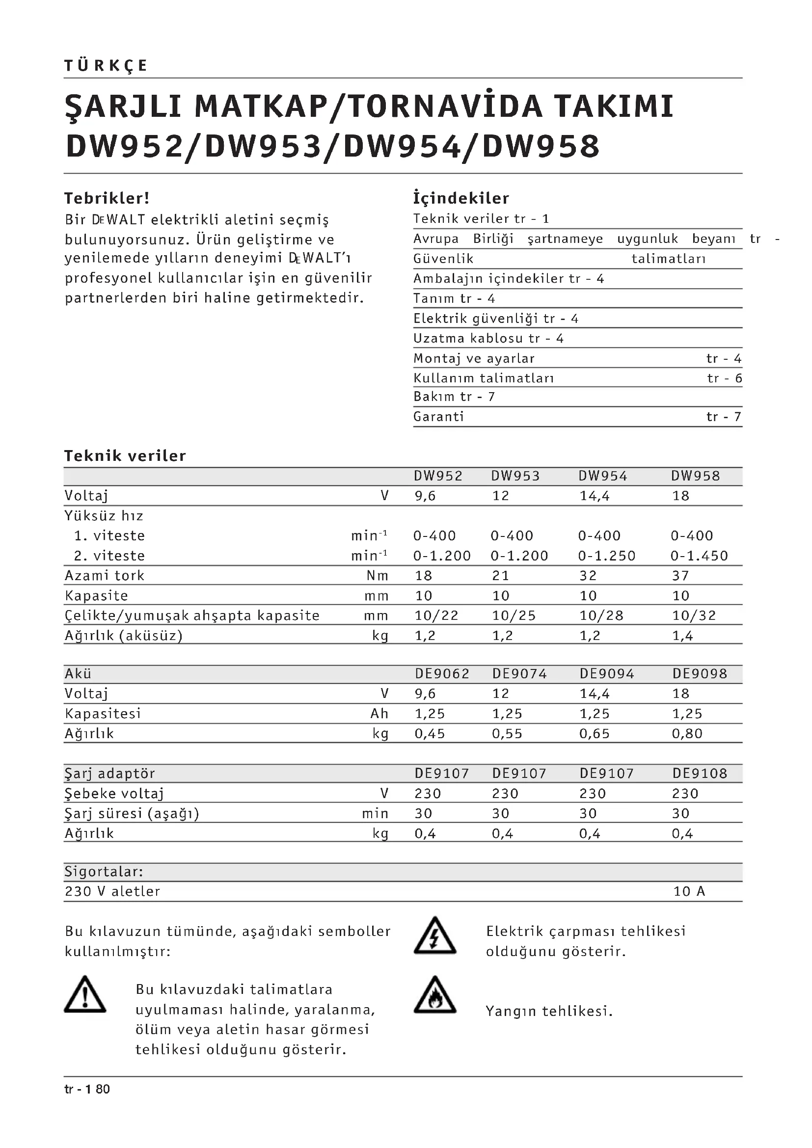 0-1.200 0-1.200 0-1.250 0-1.450 Azami tork Nm 18 21 32 37 Kapasite mm 10 10 10 10 Çelikte/yumuşak ahşapta kapasite mm 10/22 10/25 10/28 10/32 Ağrlk (aküsüz) kg 1,2 1,2 1,2 1,4 Akü DE9062 DE9074 DE9094 DE9098 Voltaj V 9,6 12 14,4 18 Kapasitesi Ah 1,25 1,25 1,25 1,25 Ağrlk kg 0,45 0,55 0,65 0,80 Şarj adaptör DE9107 DE9107 DE9107 DE9108 Şebeke voltaj V 230 230 230 230 Şarj süresi (aşağ) min 30 30 30 30 Ağrlk kg 0,4 0,4 0,4 0,4 Sigortalar: 230 V aletler 10 A Bu klavuzun tümünde, aşağdaki semboller kullanlmştr: Bu klavuzdaki talimatlara uyulmamas halinde, yaralanma, ölüm veya aletin hasar görmesi tehlikesi olduğunu gösterir. Elektrik çarpmas tehlikesi olduğunu gösterir. Yangn tehlikesi.TÜRKÇE 81 tr - 2 Güvenlik talimatlar, Elektrikli aletleri kullanrken daima, yangin, elektrik çarpmas ve yaralanma riskini azaltmak için, ülkenizde uygulanabilecek güvenlik kurallarna uyun. Bu ürünü kullanma girişiminde bulunmadan önce, aşağdaki güvenlik talimatlarn dikkatle okuyun. Bu talimatlar güvenli bir yerde saklayn. Genel Bilgiler 1 Çal,şma alan,n,z, temiz tutun Dağnk yerler ve tezgahlar kazaya neden olabilir. 2 Çal,şma alan,n,z,n çevre koşullar,na dikkat edin Elektrikli aletleri rutubete maruz brakmayn. Çalşma alannz iyi aydnlatn. Elektrikli aletleri, yanc sv ve gazlarn bulunduğu ortamlarda kullanmayn. 3 Elektrik çarpmas,na karş, önlem al,n Topraklanmş yüzeylere temastan kaçnn (Örn: borular, radyatörler, ocaklar ve buzdolaplar). 4 Çocuklar, aletlerden uzak tutun Çocuklarn aletle veya uzatma kablosu ile temasna izin vermeyin. Herkesi çalşma alanndan uzak tutun. 5 Kullan,lmayan aletleri saklay,n Kullanlmayan elektrikli aletleri kuru, güvenli ve çocuklarn ulaşamayacağ bir yerde saklayn. 6 Uygun giyinin Bol elbise giymeyin, tak takmayn. Hareketli motor parçalar bunlar kapabilir. Açk havada çalşken, tercihen lastik eldiven kullann ve kaymaz tabanl ayakkab giyin. Saçnz uzunsa koruyucu başlk giyin. 7 Koruyucu gözlük tak,n İşlemin toz veya frlayan parçack yaratmas halinde, yüz veya toz maskesi kullann. 8 Maksimum ses şiddetine dikkat edin Ses şiddeti 85 dB(A)’y aşarsa, kulağnz korumak için gerekli önlemleri aln. Avrupa Birliği şartnameye uygunluk beyan, DW952/DW953/DW954/DW958