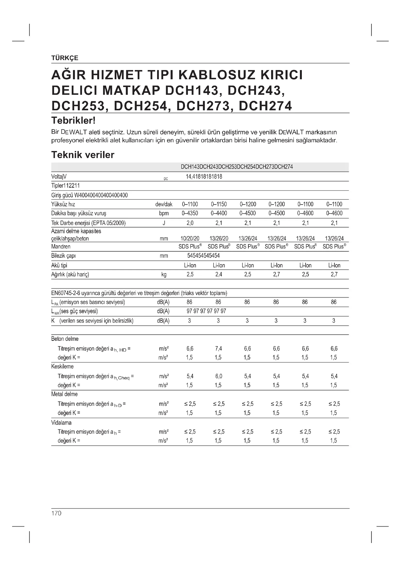 AĞIR HIZMET TIPI KABLOSUZ KIRICI DELICI MATKAP DCH143, DCH243, DCH253, DCH254, DCH273, DCH274 DeWALT, Teknik Özellikleri bölümünde açıklanan bu ürünlerin aşağıda belirtilen yönergelere uygun olduğunu beyan eder: 2006/42/AT, eN60745-1:2009+A11:2010, eN60745-2-6:2010. Bu ürünler ayrıca 2004/108/AT (19.04.2016 tarihine kadar), 2014/30/EU (20.04.2016 tarihinden itibaren) ve 2011/65/EU Direktiflerine de uygundur. Daha ayrıntılı bilgi için, lütfen aşağıdaki adresten DeWALT ile temas kurun veya kılavuzun arka kapağına bakın. Bu belge altında imzası bulunan yetkili, teknik dosyanın derlenmesinden sorumludur ve bu beyanı DeWALT adına vermiştir. Markus Rompel Mühendislik Direktörü DeWALT , Richard-Klinger-Straße 11, D-65510, Idstein, Almanya