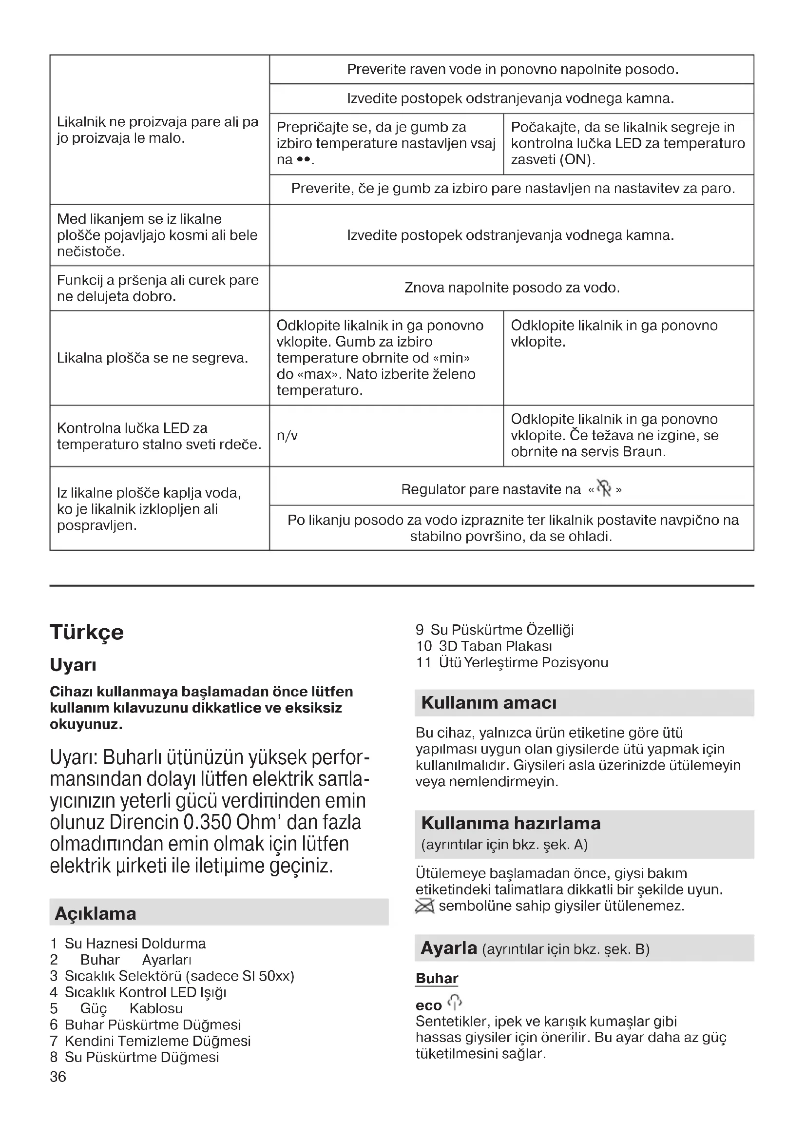 Ütüleme sırasında su damlacıkları kumaşa damlıyor Su haznesinin kapağını bastırın ve kapalı olduğunu kontrol edin Sıcaklık selektörünün en az •• üzerinde olduğunu kontrol edin. Daha yüksek bir sıcaklık ayarı seçin. Buhar püskürtme düğmesine daha uzun aralıklarda basın. Buhar püskürtme düğmesine daha uzun aralıklarda basın. Su haznesine kimyasallar koyulmuşsa, hazneyi boşaltın ve 2-3 kez çalkalayın. Ütü çok az buhar çıkarıyor veya hiç çıkarmıyor Su seviyesini kontrol edin ve hazneyi doldurun Kireç giderme işlemi uygulayın Sıcaklık selektörünün en az •• üzerinde olduğunu kontrol edin. Ütü ısınana ve sıcaklık kontrol LED ışığı daimi olarak AÇIK kalana kadar bekleyin. Buhar selektörünün açık ve buhar ayarında olduğunu kontrol edin Ütüleme sırasında taban plakasından parçacıklar ve beyaz maddeler çıkıyor Kireç giderme işlemi uygulayın Buhar püskürtme özelliği doğru çalışmıyor Su haznesini doldurun Taban plakası ısınmıyor Ütüyü fi şten çıkarın, tekrar takın. Sıcaklık selektörünü «min» den «max» a döndürün Sonra istenilen sıcaklığı seçin Ütüyü fi şten çıkarın, tekrar takın. Sıcaklık kontrol LED ışığı kalıcı olarak kırmızı renk yanıyor yok Ütüyü fi şten çıkarın, tekrar takın. Sorun devam ederse Braun müşteri hizmetleri ile iletişim kurun. Ütü fi şten çekildikten sonra veya saklama sırasında su damlacıkları taban plakasından damlıyor Buhar regülatörünü « » seviyesine ayarlayın Ütü yaptıktan sonra su haznesini boşaltın ve soğuma süresince ütüyü dikey olarak sağlam bir yüzeye yerleştirin Normal Yün, polyester, pamuklu benzer giysiler için önerilir. turbo (maks. buhar) Kalın pamuklu/keten ve blucin gibi daha güçlü bir buhar püskürtmeye ihtiyaç duyulan giysiler için önerilir. Sıcaklık (sadece SI 50xx) seviye 1 (•) Sentetikler seviye 2 (••) Yün,ipek,polyester seviye 3 (•••) Pamuk,keten Kireç giderme (ayrıntılar için bkz. şek. D) Ticari olarak satılan kireç gidericileri kullanmayın, ütüye zarar verebilir. Kireç giderme sıklığı suyun sertlik derecesine, kullanılan buhar miktarına ve ütüleme sürelerinin uzunluğuna bağlıdır. Garanti ve Servis Detaylı bilgi için ayrı olarak verilen garanti ve servis broşürüne bakın veya www.braunhousehold.com adresini ziyaret edin. 5712710761_TS5_INT_01.indd 375712710761_TS5_INT_01.indd 37 09.04.20 15:0809.04.20 15:0838 Română (MD) Înainte de utilizare Citiţi integral şi cu atenţie instrucţiunile de utilizare înainte de a folosi aparatul. Atenţie: Deoarece acest fier de călcat deţine o putere ridicată, asiguraţivă că sursa de curent pe care o aveţi la dispo- ziţie este corespunzătoare. Contactaţi furnizorul local de energie electrică pen- tru a vă asigura că impedanţa curentului electric nu este mai mare de 0.350 Ohm. Descriere 1 Umplere rezervor de apă 2 Setări abur 3 Selector temperatură (numai SI 50xx) 4 LED pentru controlul temperaturii 5 Cablu alimentare 6 Buton jet abur 7 Buton auto-curăţare 8 Buton pulverizare 9 Funcţia de pulverizare 10 Talpa fi erului de călcat 3D 11 Suport pentru fi erul de călcat Scopul utilizării Aparatul trebuie utilizat numai pentru călcarea hainelor care sunt adecvate pentru călcare conform etichetei de îngrij ire. Nu călcaţi sau nu umeziţi niciodată hainele în timp ce le purtaţi. Începerea funcţionării (pentru detalii vezi fi g. A) Înainte de a începe să călcaţi urmaţi cu atenţie instrucţiunile de pe eticheta de îngrij ire. Materialele cu acest simbol nu se calcă. Setări (pentru detalii vezi fi g. B) Abur eco Este recomandat pentru hainele cele mai delicate cum ar fi materialele sintetice, mătasea şi ţesăturile combinate. Această setare permite un consum mai mic de energie. Normal Este recomandat pentru haine cum ar fi lâna, poliesterul şi bumbacul. turbo (abur max.) Este recomandat pentru haine care au nevoie de abur mai puternic, cum ar fi bumbacul/inul gros şi materialul de blugi. Temperatură (numai SI 50xx) nivelul 1 (•) Sintetice nivelul 2 (••) Lână, mătase, poliester nivelul 3 (•••) Bumbac, pânză Îndepărtarea depunerilor (pentru detalii vezi fi g. D) Nu folosiţi decalcifi catori comerciali; aceştia vă pot deteriora fi erul de călcat. Frecvenţa îndepărtării depunerilor depinde de duritatea apei, de cantitatea de abur utilizată şi de frecvenţa şi durata sesiunilor de călcare. Garanţie şi service Pentru informaţii detaliate vezi broşura separată de garanţie şi service sau vizitaţi www.braunhousehold.com. Instrucţiuni de depanare SI 50xx SI 51xx