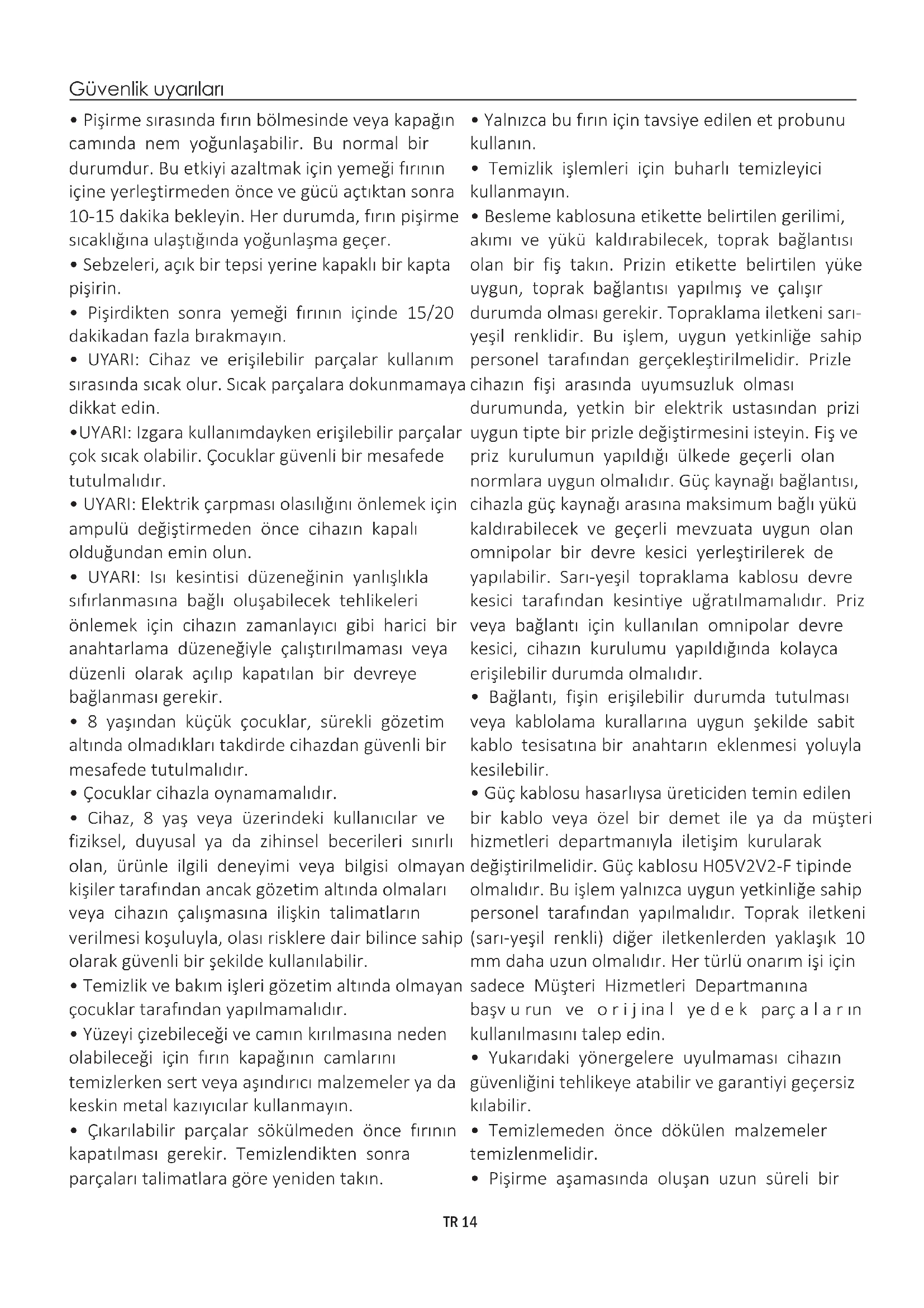 Fırın sadece kullanım amacına uygun biçimde kullanılmalıdır, kullanım amacı yiyeceklerin pişirilmesidir; başka bir amaç için, örneğin bir ısı kaynağı olarak kullanılması uygunsuz ve bu nedenle tehlikeli kullanım olarak değerlendirilir. Uygunsuz, hatalı veya makul olmayan kullanım sonucunda ortaya çıkabilecek her türlü zarardan imalatçı sorumlu tutulamaz. Herhangi bir elektrikli cihazın kullanımı sırasında bazı asli kurallara uyulması gereklidir: - elektrik fişini prizden çıkarmak için asla kablodan tutarak çekmeyin; - elleriniz ya da ayaklarınız ıslak veya nemli iken cihaza dokunmayın; - genellikle adaptörlerin, çoklu prizlerin ve uzatma kablolarının kullanılması tavsiye edilmez; - arızalanması ve/veya düzgün çalışmaması durumunda cihazı kapatın ve kurcalamayın.