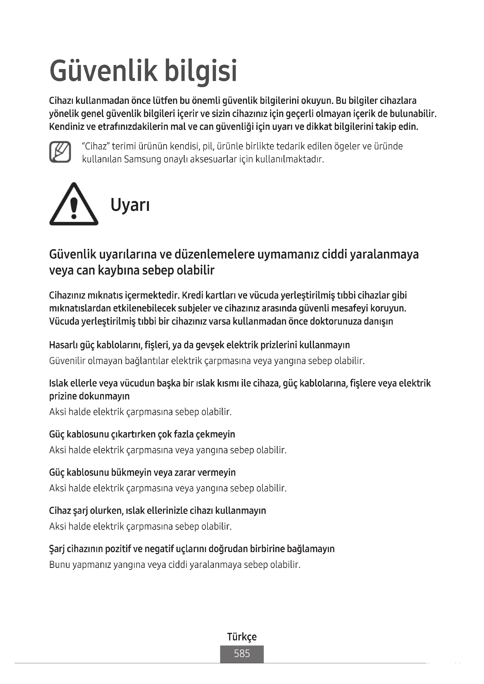 Güvenlik bilgisi Cihazı kullanmadan önce lütfen bu önemli güvenlik bilgilerini okuyun. Bu bilgiler cihazlara yönelik genel güvenlik bilgileri içerir ve sizin cihazınız için geçerli olmayan içerik de bulunabilir. Kendiniz ve etrafınızdakilerin mal ve can güvenliği için uyarı ve dikkat bilgilerini takip edin. “Cihaz” terimi ürünün kendisi, pil, ürünle birlikte tedarik edilen ögeler ve üründe kullanılan Samsung onaylı aksesuarlar için kullanılmaktadır. Uyarı Güvenlik uyarılarına ve düzenlemelere uymamanız ciddi yaralanmaya veya can kaybına sebep olabilir Cihazınız mıknatıs içermektedir. Kredi kartları ve vücuda yerleştirilmiş tıbbi cihazlar gibi mıknatıslardan etkilenebilecek subjeler ve cihazınız arasında güvenli mesafeyi koruyun. Vücuda yerleştirilmiş tıbbi bir cihazınız varsa kullanmadan önce doktorunuza danışın Hasarlı güç kablolarını, fişleri, ya da gevşek elektrik prizlerini kullanmayın Güvenilir olmayan bağlantılar elektrik çarpmasına veya yangına sebep olabilir. Islak ellerle veya vücudun başka bir ıslak kısmı ile cihaza, güç kablolarına, fişlere veya elektrik prizine dokunmayın Aksi halde elektrik çarpmasına sebep olabilir. Güç kablosunu çıkartırken çok fazla çekmeyin Aksi halde elektrik çarpmasına veya yangına sebep olabilir. Güç kablosunu bükmeyin veya zarar vermeyin Aksi halde elektrik çarpmasına veya yangına sebep olabilir. Cihaz şarj olurken, ıslak ellerinizle cihazı kullanmayın Aksi halde elektrik çarpmasına sebep olabilir. Şarj cihazının pozitif ve negatif uçlarını doğrudan birbirine bağlamayın Bunu yapmanız yangına veya ciddi yaralanmaya sebep olabilir.Türkçe