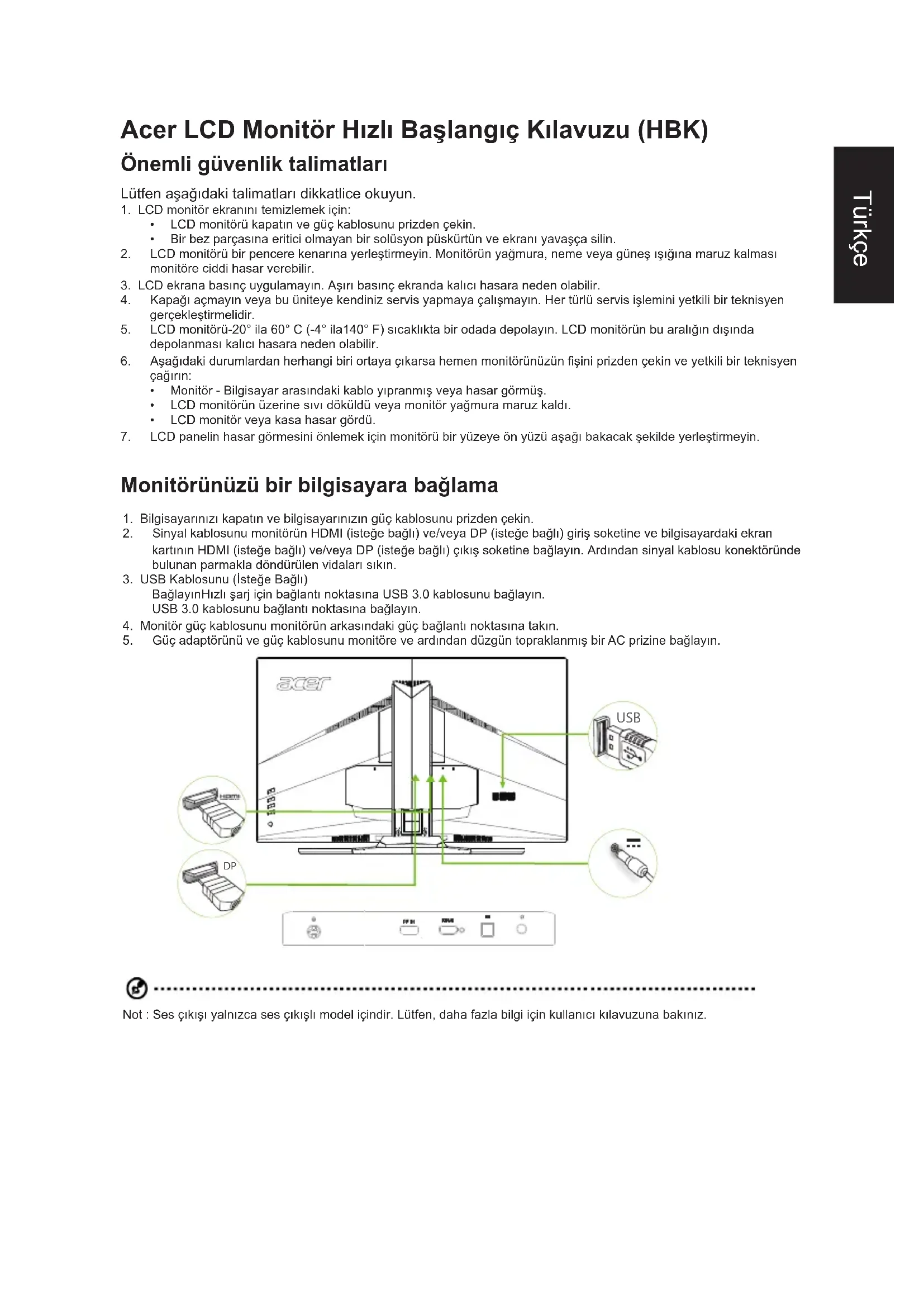 AÇIKModu 45W (tip.) Uyku Modu 0,5 W (tip.) Kapalı/BeklemeModu 0,45 W (tip.) GirişKonektörü DP(YalnızcaDPModeli) HDMI(YalnızcaHDMIModeli) USBHub/USB3.0x4(YalnızcaUSBHubModeli) GirişVideoSinyali DPsinyali(YalnızcaDPGirişliModel) HDMIsinyali(YalnızcaHDMIGirişliModel) Hoparlörler (Tipik) 7 W x 2 Ses SesÇıkışı(YalnızcaSesÇıkışlıModel) Maksimum Ekran Boyutu Yatay: 697,344 mm Dikey: 392,256 mm GüçKaynağı 100-240V~, 50/60Hz ÇevreyleİlgiliHususlar ÇalışmaSıcaklığı:5°-35°C DepolamaSıcaklığı:-20°-60°C ÇalışmaNemi:%10-%85 Boyutlar 712,7 (G) x 484~604 (Y) x 298,3 (D) mm Ağırlık(N.W.) 10,1 kg Ünite (net) Mekanizmaözelliği Eğim:-5°ila+25° Dönme: +/- 25° Yükseklikayarı:120mm Pivot:Hayır Ayrılabilirayakstandı:Evet Harici kontroller: Functions(İşlevler) Parlaklık Karşıtlık MaviIşık Koyu yükseltme Uyarlanırkarşıtlık Gama RenkSıcaklığı Doygunluk 6 eksenli renk Ses Düzeyi ÜstHız Hedefnoktası Dil EkranMenüsüZamanAşımı Şeffaık Yenilemehızısayısı Giriş OrtamIşığı KısayolAtaması GenişMod Derin Uyku Hızlıbaşlatmamodu GüçkapalıykenUSBbağlantısından şarjetme Oyun modu *Tümözelliklerbilgiverilmedendeğiştirilebilir. ResmiAcerdestekwebsitesindeAcerürününüzeaitkılavuzlarıvediğerbelgeleribulabilirsiniz. *Yıllıkenerjitüketimi,yılda365günvegünde4saattipikgüçtüketimiylehesaplanır.简体中文 Acer 液晶显示器快速入门指南 (QSG)