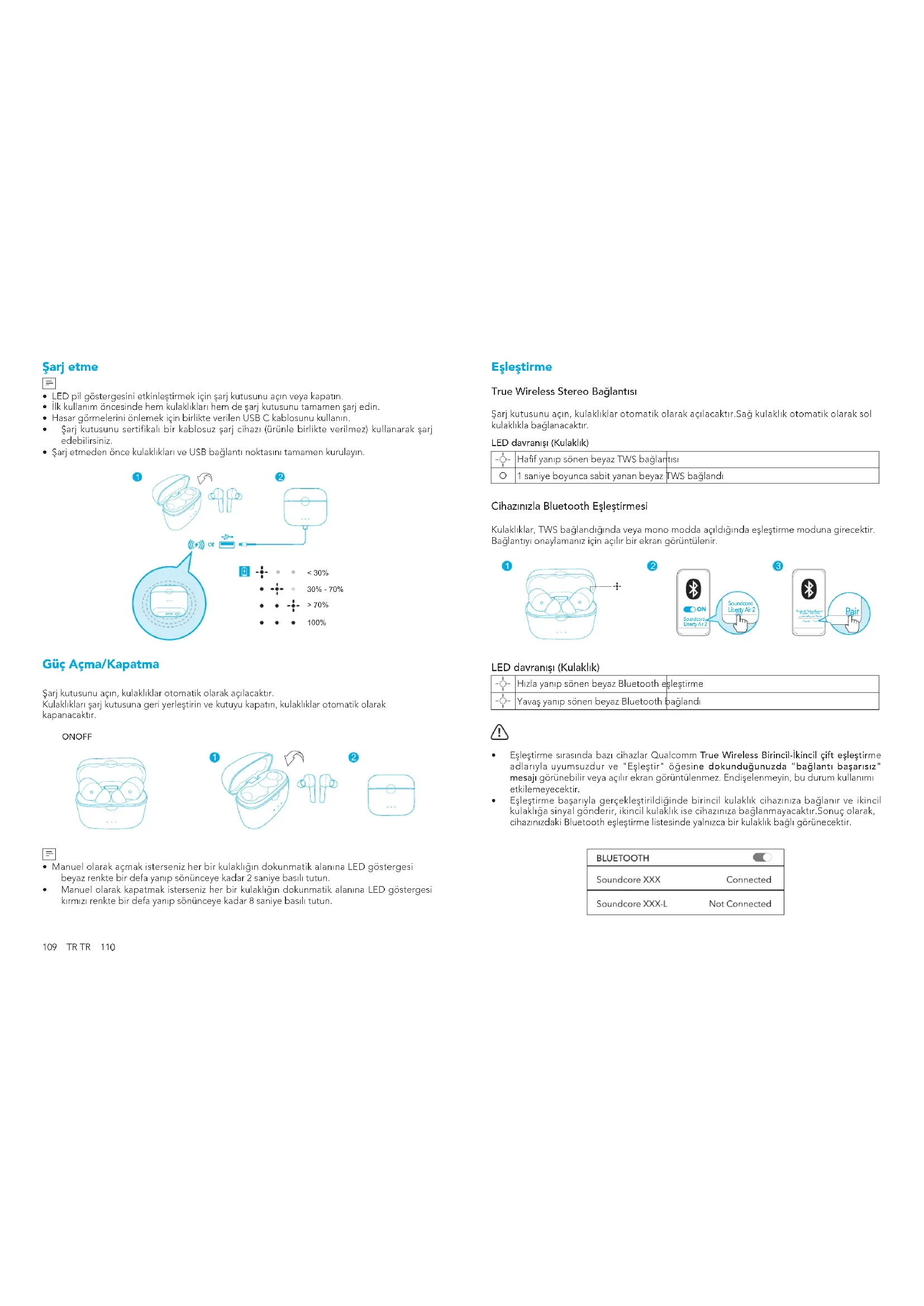 - Manuel olarak kapatmak isterseniz her bir kulaklığın dokunmatik alanına LED göstergesi kırmızı renkte bir defa yanıp sönünceye kadar 8 saniye basılı tutun. Eşleştirme True Wireless Stereo Bağlantısı Şarj kutusunu açın, kulaklıklar otomatik olarak açılacaktır.Sağ kulaklık otomatik olarak sol kulaklıkla bağlanacaktır. LED davranışı (Kulaklık) Haf yanıp sönen beyaz TWS bağlantısı 1 saniye boyunca sabit yanan beyaz TWS bağlandı Cihazınızla Bluetooth Eşleştirmesi Kulaklıklar, TWS bağlandığında veya mono modda açıldığında eşleştirme moduna girecektir. Bağlantıyı onaylamanız için açılır bir ekran görüntülenir.