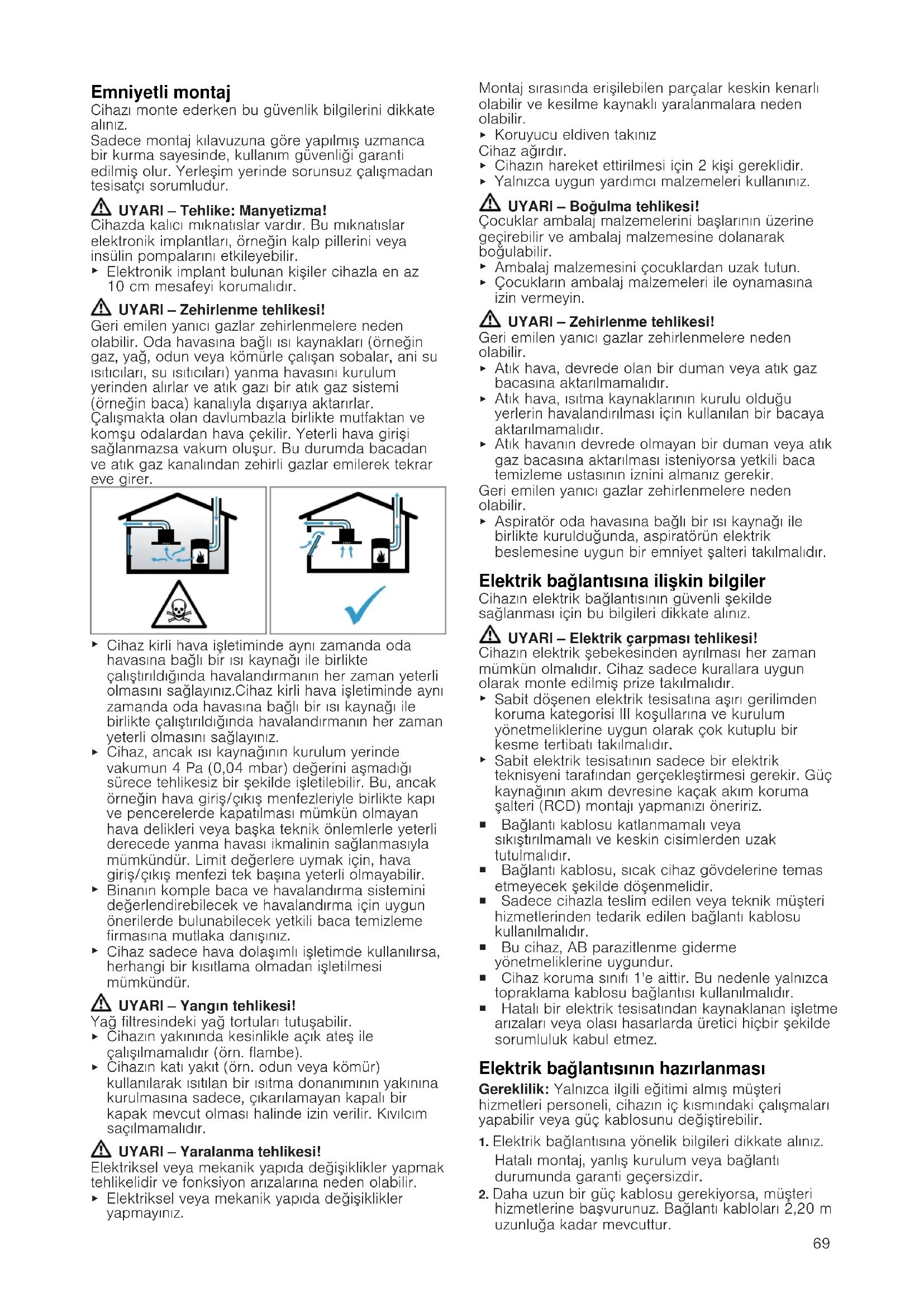 Elektronik implant bulunan kişiler cihazla en az 10cm mesafeyi korumalıdır. UYARI‒Zehirlenme tehlikesi! Geri emilen yanıcı gazlar zehirlenmelere neden olabilir. Oda havasına bağlı ısı kaynakları (örneğin gaz, yağ, odun veya kömürle çalışan sobalar, ani su ısıtıcıları, su ısıtıcıları) yanma havasını kurulum yerinden alırlar ve atık gazı bir atık gaz sistemi (örneğin baca) kanalıyla dışarıya aktarırlar. Çalışmakta olan davlumbazla birlikte mutfaktan ve komşu odalardan hava çekilir. Yeterli hava girişi sağlanmazsa vakum oluşur. Bu durumda bacadan ve atık gaz kanalından zehirli gazlar emilerek tekrar eve girer.