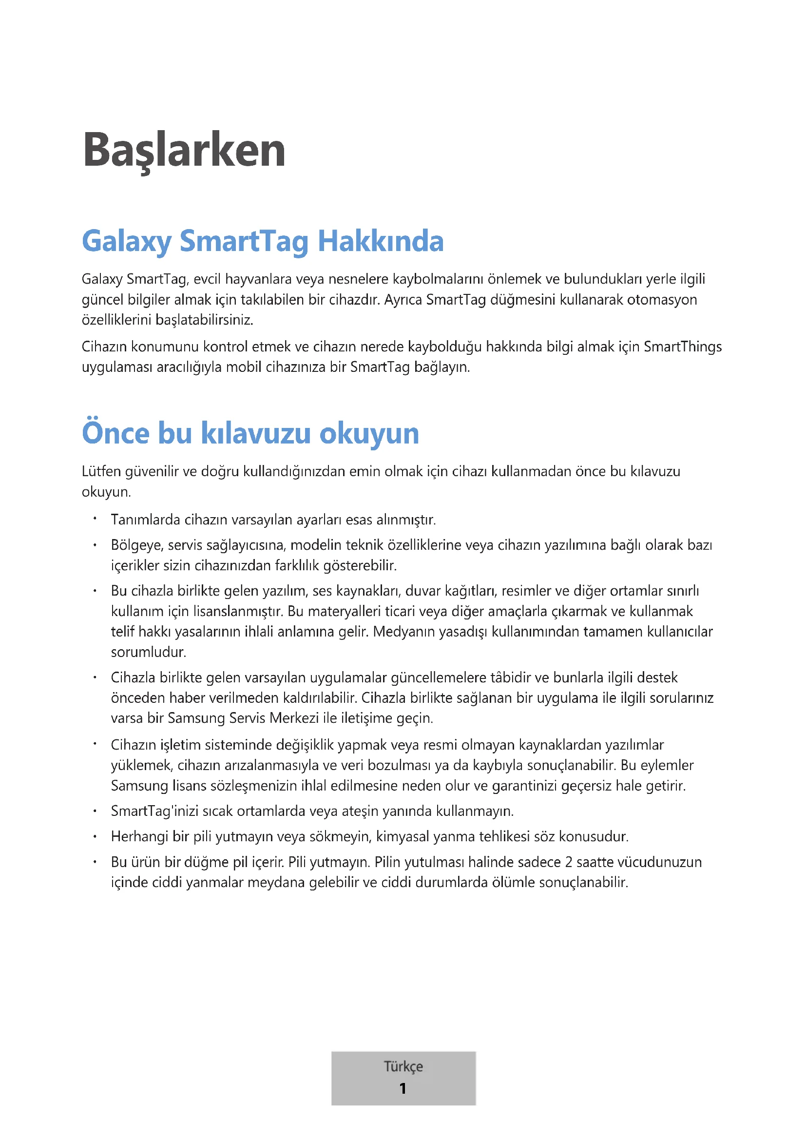 SmartTag Hızlı Başlangıç Kılavuzu SmartTag ile birlikte gelen öğeler ve herhangi bir mevcut aksesuar bölgeye veya servis sağlayıcısına bağlı olarak farklılık gösterebilir. Sunulan öğeler sadece bu cihaz için tasarlanmıştır ve diğer cihazlarla uyumlu olmayabilir. Görüntüler ve teknik özellikler önceden haber verilmeden değiştirilebilir. Yerel Samsung bayinizden ek aksesuarlar satın alabilirsiniz. Satın almadan önce cihazla uyumlu olduklarından emin olun. Yalnızca Samsung tarafından onaylanan aksesuarları kullanın. Onaylanmamış aksesuarların kullanımı performans sorunlarına ve garanti kapsamı dışında kalan arızalara yol açabilir. Tüm cihazların kullanılabilirliği tamamen üretici şirkete bağlı olarak değişebilir. Kullanılabilir cihazlarla ilgili daha fazla bilgi için Samsung web sitesine bakınız. Türkçe 2Başlarken