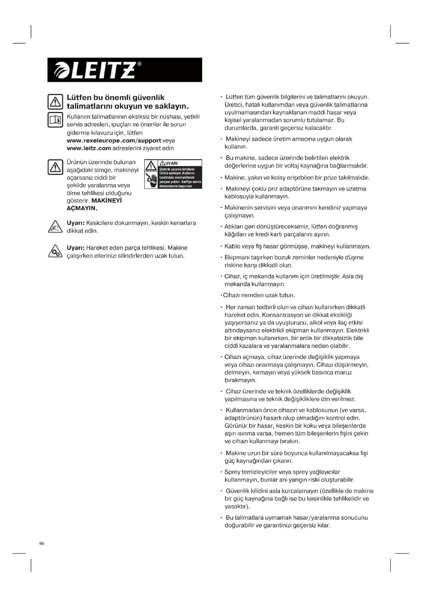 - Bu talimatlara uymamak hasar/yaralanma sonucunu doğurabilir ve garantinizi geçersiz kılar. Lütfen bu önemli güvenlik talimatlarını okuyun ve saklayın. Kullanım talimatlarının eksiksiz bir nüshası, yetkili servis adresleri, ipuçları ve öneriler ile sorun giderme kılavuzu için, lütfen www.rexeleurope.com/support veya www.leitz.com adreslerini ziyaret edin Uyarı: Kesicilere dokunmayın, keskin kenarlara dikkat edin. Uyarı: Hareket eden parça tehlikesi. Makine çalışırken ellerinizi silindirlerden uzak tutun.979797 Sallantılı, zincirli vb. mücevherleri makineden uzak tutun Kravat ve vücuda oturmayan giysileri makineden uzak tutun İkaz simgeleri Uzun saçları makineden uzak tutun Elinizi besleme girişine sokmayın İkaz simgeleri Yaprak kapasitesi CD imha edilemez 26 mm’den uzun olan büyük ve kalın zımba telleri kullanmayın Uyarı: hareket eden parçalar Bu makine, çocuklar tarafından kullanılmamalıdır Sprey kullanmayın. Sprey temizleyiciler veya sprey yağlayıcılar kullanmayın, bunlar ani yangın riski oluşturabilir. Kontroller ve Göstergeler Kredi kartı imha etmez Aksesuarlar Sadece Leitz aksesuarları kullanın: Yağlama sayfaları - 8007 00 00 Ikon Tip model Kaydırma düğmesi / gösterge ve eylem Kontrol düğmeleri 11,12,13 Otomatik çalıştırma ve bekleme düğmesi (bir kez basın) Manuel ters yönde çalıştırma düğmesi (basılı tutun) Manuel ileri yönde çalıştırma düğmesi (basılı tutun) Aşırı ısınma göstergesi (makinenin soğumasına izin verin) Aşırı yükleme göstergesi / Kâğıt sıkışması göstergesi (yaprak sayısını azaltın / sıkışmayı giderin) Çöp kutusu dolu göstergesi (kapağı açın veya kesici kafayı kaldırın ve kutuyu boşaltın) Kapak açık veya kesici kafa çıkarıldı göstergesi (kapağı sıkıca kapatın)98 < 200 gr/m² kalın kâğıt veya kartpostal. Çok katlı yapraklar (örn., ikiye katlanmış A3 kâğıtlar). Kuşe kâğıt veya her iki yüzü de basılı kâğıt. CD ve DVD’ler Sprey kullanmayın Yağ yok, sadece yağ levhaları İmha Kapasitesi Aşağıdakileri parçalayabilir: