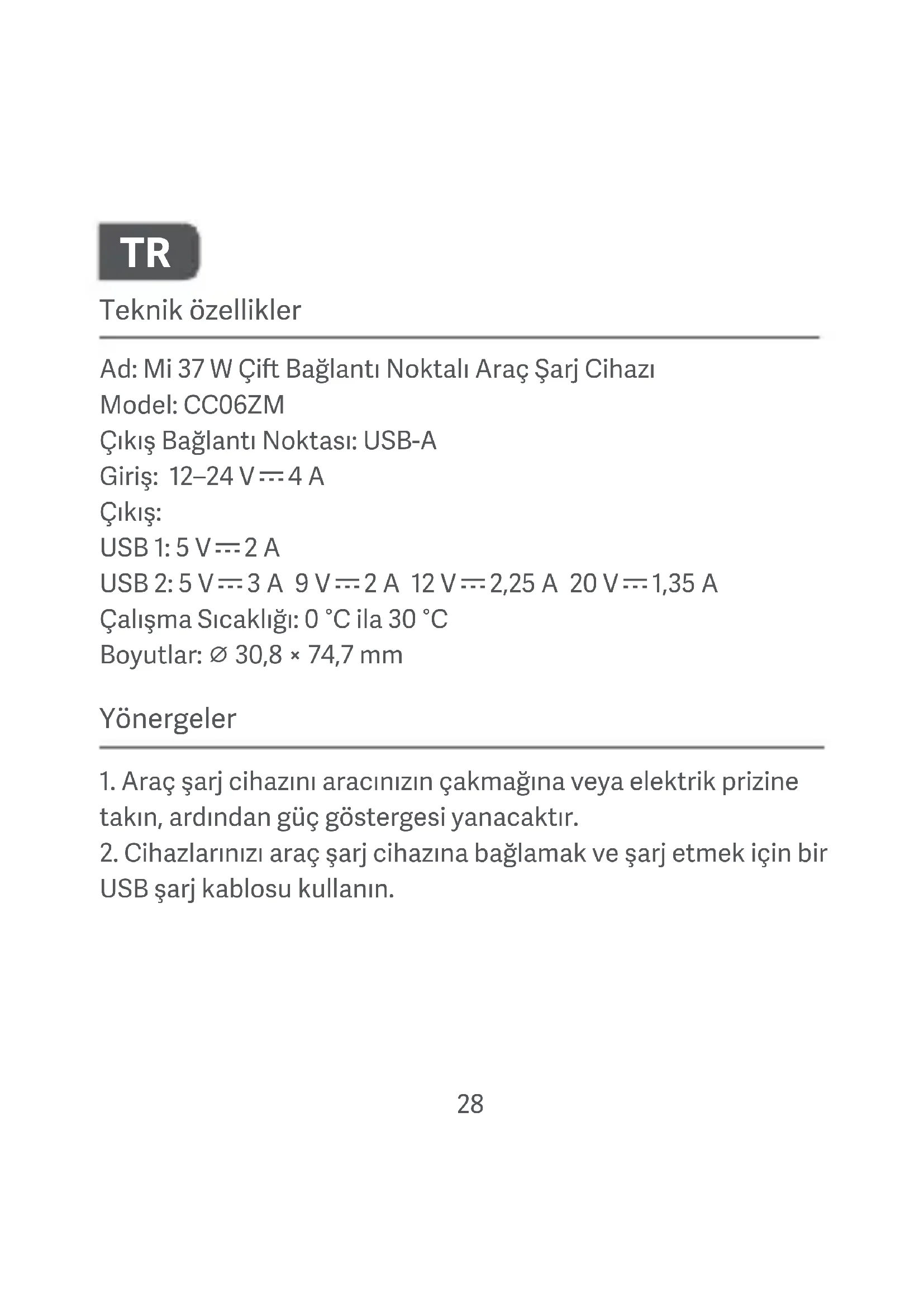 Ad: Mi 37 W Çi Bağlantı Noktalı Araç Şarj Cihazı Model: CC06ZM Çıkış Bağlantı Noktası: USB-A Giriş: 12–24 V=4 A Çıkış:
