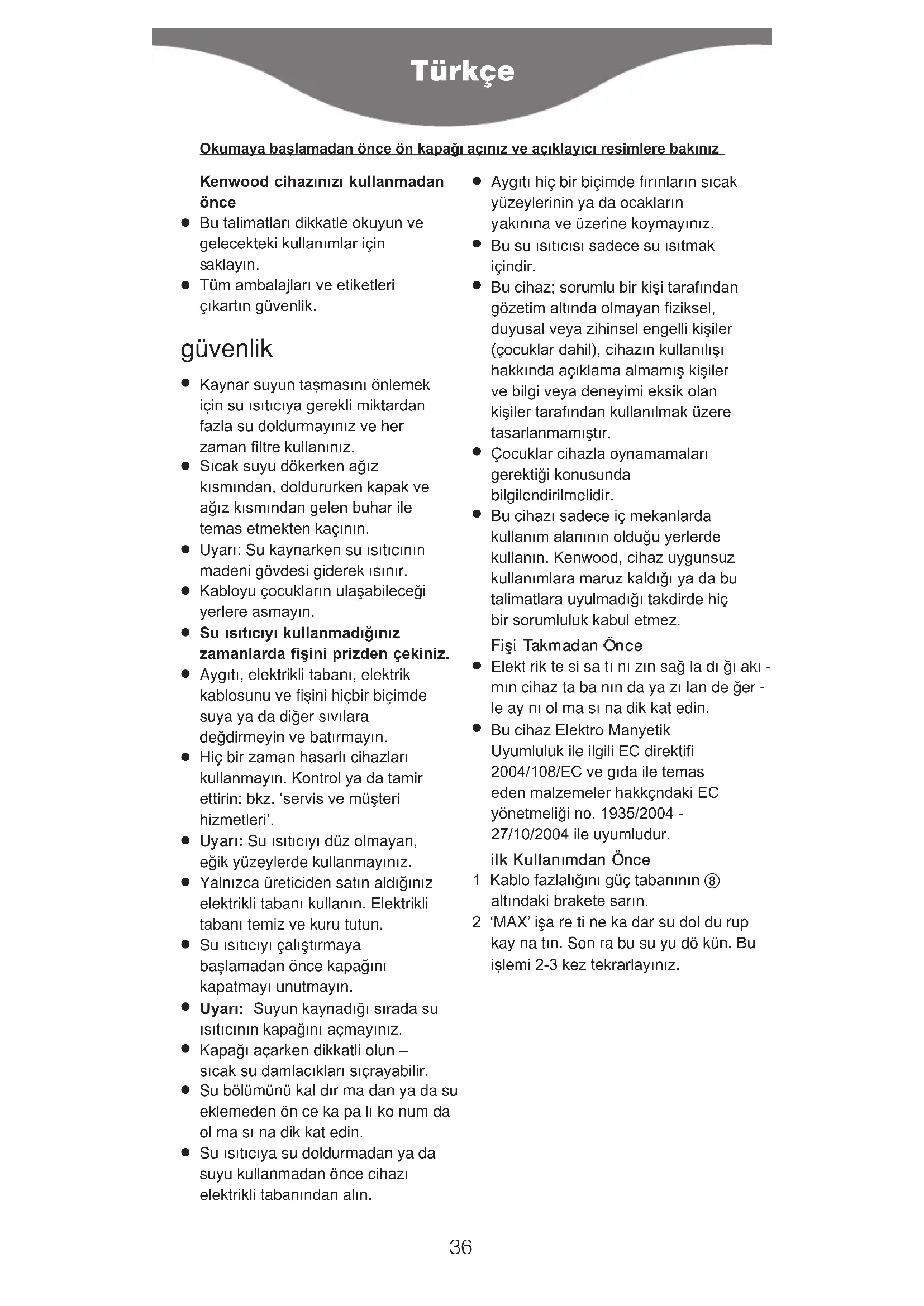 Su ısıtıcıyı çalıfltırmaya bafllamadan önce kapa¤ını kapatmayı unutmayın.