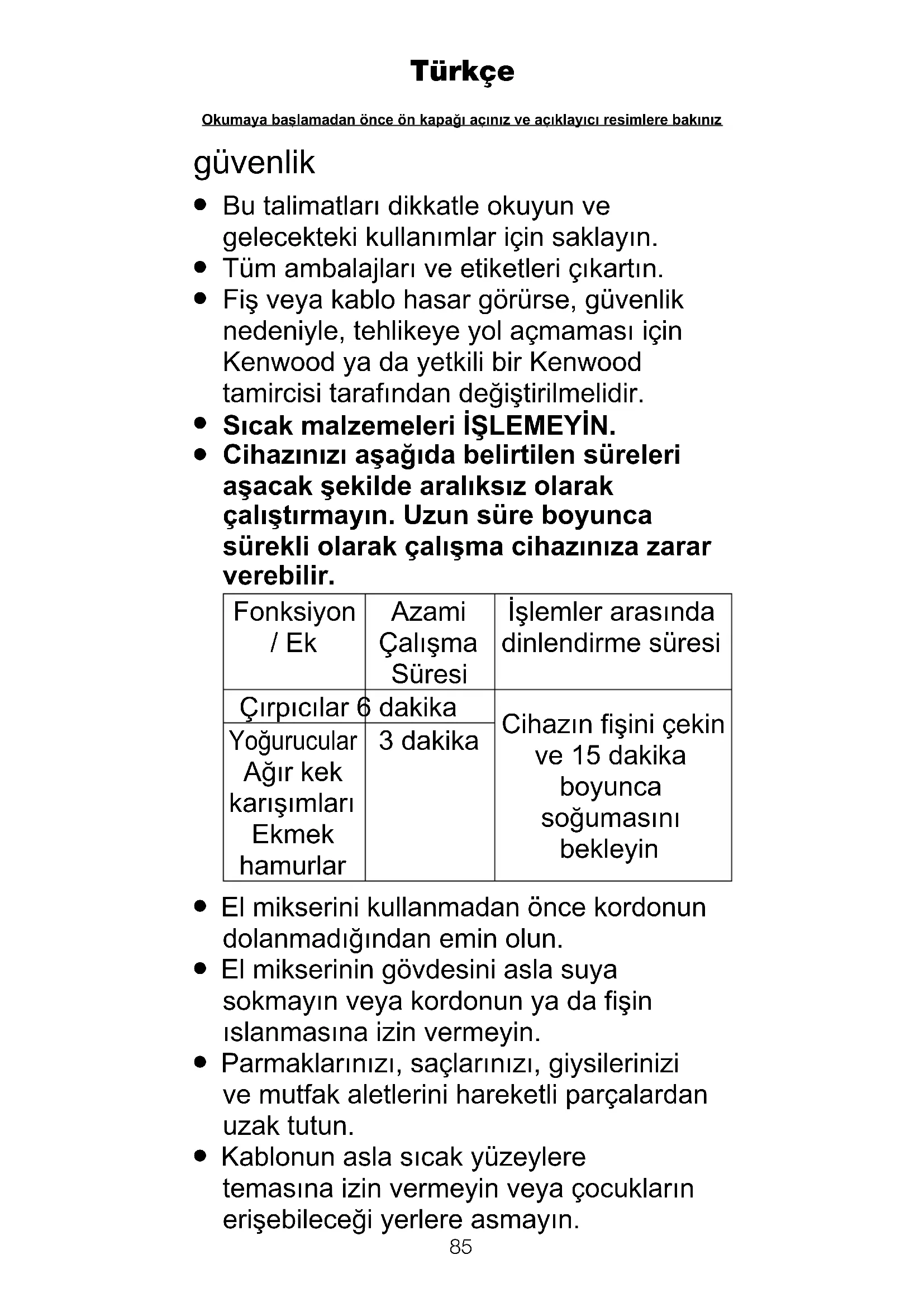 Cihazınızı aşağıda belirtilen süreleri aşacak şekilde aralıksız olarak çalıştırmayın. Uzun süre boyunca sürekli olarak çalışma cihazınıza zarar verebilir. Fonksiyon / Ek Azami Çalışma Süresi İşlemler arasında dinlendirme süresi Çırpıcılar 6 dakika Cihazın fişini çekin ve 15 dakika boyunca soğumasını bekleyin Yoğurucular Ağır kek karışımları Ekmek hamurlar 3 dakika