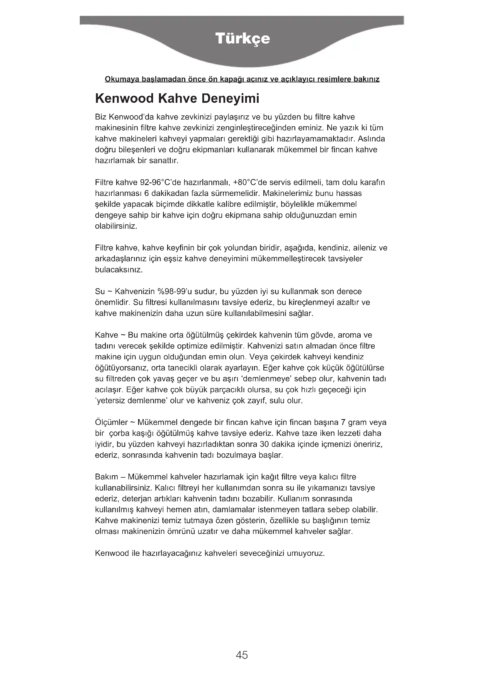 UNIONIN DIREKTIIVIN 2002/96 MUKAISESTI. Tuotetta ei saa hävittää yhdessä tavallisten kotitalousjätteiden kanssa sen lopullisen käytöstä poiston yhteydessä. Vie se paikallisten viranomaisten hyväksymään kierrätyskeskukseen tai anna se jälleenmyyjän hävitettäväksi, mikäli kyseinen palvelu kuuluu jälleenmyyjän toimialaan. Suojelet luontoa ja vältyt virheellisen tai väärän romutuksen aiheuttamilta terveysriskeiltä, mikäli hävität kodinkoneen erillään muista jätteistä. Näin myös kodinkoneen sisältämät kierrätettävät materiaalit voidaan kerätä talteen, jolloin säästät energiaa ja luonnonvaroja. Tuotteessa on ristillä peitetty roskasäiliön merkki, jonka tarkoituksena on muistuttaa että kodinkoneet on hävitettävä erikseen muista kotitalousjätteistä. 44Kenwood Kahve Deneyimi Biz Kenwood’da kahve zevkinizi paylaşırız ve bu yüzden bu filtre kahve makinesinin filtre kahve zevkinizi zenginleştireceğinden eminiz. Ne yazık ki tüm kahve makineleri kahveyi yapmaları gerektiği gibi hazırlayamamaktadır. Aslında doğru bileşenleri ve doğru ekipmanları kullanarak mükemmel bir fincan kahve hazırlamak bir sanattır. Filtre kahve 92-96°C’de hazırlanmalı, +80°C’de servis edilmeli, tam dolu karafın hazırlanması 6 dakikadan fazla sürmemelidir. Makinelerimiz bunu hassas şekilde yapacak biçimde dikkatle kalibre edilmiştir, böylelikle mükemmel dengeye sahip bir kahve için doğru ekipmana sahip olduğunuzdan emin olabilirsiniz. Filtre kahve, kahve keyfinin bir çok yolundan biridir, aşağıda, kendiniz, aileniz ve arkadaşlarınız için eşsiz kahve deneyimini mükemmelleştirecek tavsiyeler bulacaksınız. Su ~ Kahvenizin %98-99’u sudur, bu yüzden iyi su kullanmak son derece önemlidir. Su filtresi kullanılmasını tavsiye ederiz, bu kireçlenmeyi azaltır ve kahve makinenizin daha uzun süre kullanılabilmesini sağlar. Kahve ~ Bu makine orta öğütülmüş çekirdek kahvenin tüm gövde, aroma ve tadını verecek şekilde optimize edilmiştir. Kahvenizi satın almadan önce filtre makine için uygun olduğundan emin olun. Veya çekirdek kahveyi kendiniz öğütüyorsanız, orta tanecikli olarak ayarlayın. Eğer kahve çok küçük öğütülürse su filtreden çok yavaş geçer ve bu aşırı ‘demlenmeye’ sebep olur, kahvenin tadı acılaşır. Eğer kahve çok büyük parçacıklı olursa, su çok hızlı geçeceği için ‘yetersiz demlenme’ olur ve kahveniz çok zayıf, sulu olur. Ölçümler ~ Mükemmel dengede bir fincan kahve için fincan başına 7 gram veya bir çorba kaşığı öğütülmüş kahve tavsiye ederiz. Kahve taze iken lezzeti daha iyidir, bu yüzden kahveyi hazırladıktan sonra 30 dakika içinde içmenizi öneririz, ederiz, sonrasında kahvenin tadı bozulmaya başlar. Bakım – Mükemmel kahveler hazırlamak için kağıt filtre veya kalıcı filtre kullanabilirsiniz. Kalıcı filtreyi her kullanımdan sonra su ile yıkamanızı tavsiye ederiz, deterjan artıkları kahvenin tadını bozabilir. Kullanım sonrasında kullanılmış kahveyi hemen atın, damlamalar istenmeyen tatlara sebep olabilir. Kahve makinenizi temiz tutmaya özen gösterin, özellikle su başlığının temiz olması makinenizin ömrünü uzatır ve daha mükemmel kahveler sağlar. Kenwood ile hazırlayacağınız kahveleri seveceğinizi umuyoruz. Türkçe
