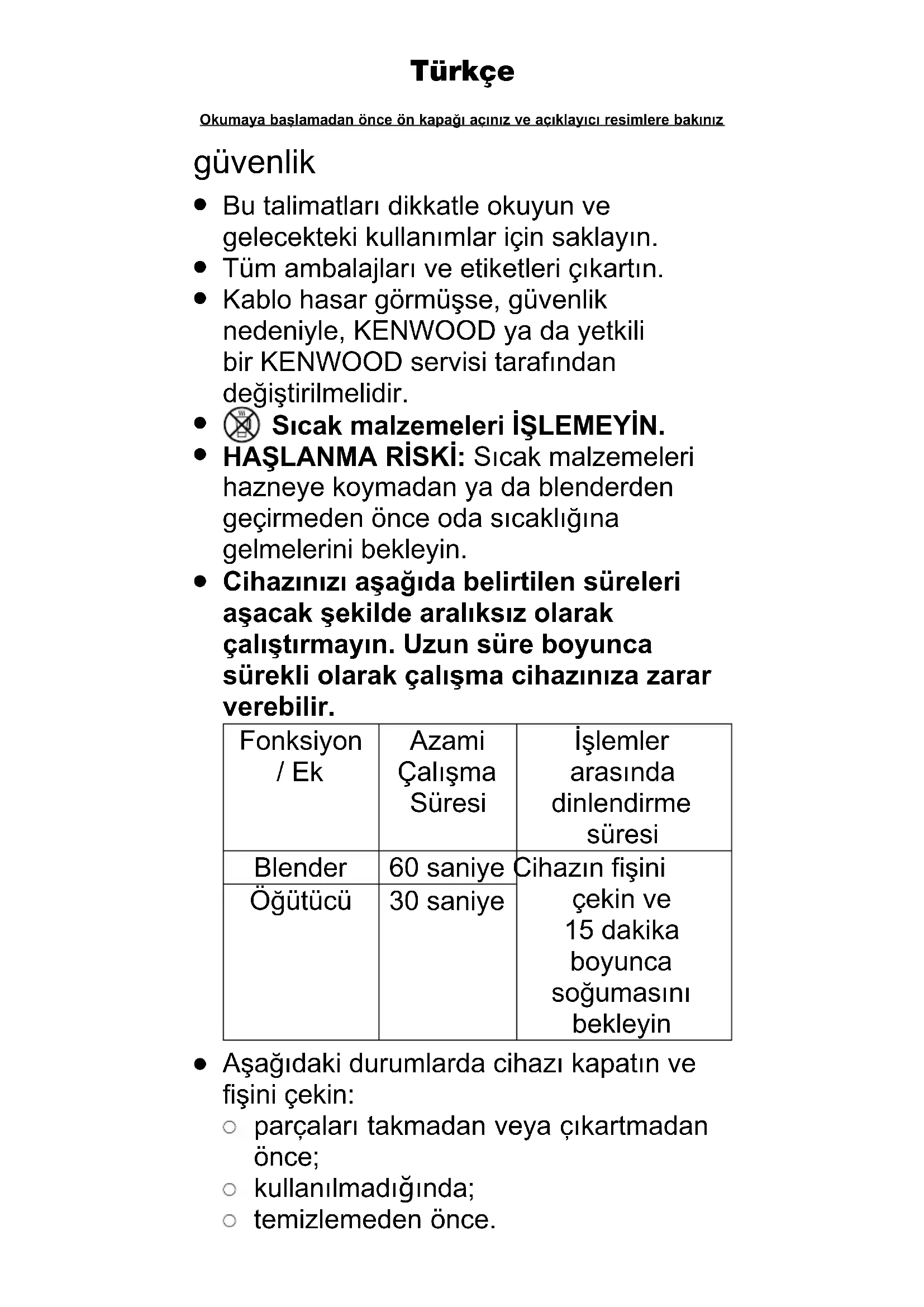 Cihazınızı aşağıda belirtilen süreleri aşacak şekilde aralıksız olarak çalıştırmayın. Uzun süre boyunca sürekli olarak çalışma cihazınıza zarar verebilir. Fonksiyon / Ek Azami Çalışma Süresi İşlemler arasında dinlendirme süresi Blender 60 saniye Cihazın fişini çekin ve 15 dakika boyunca soğumasını bekleyin Öòütücü 30 saniye