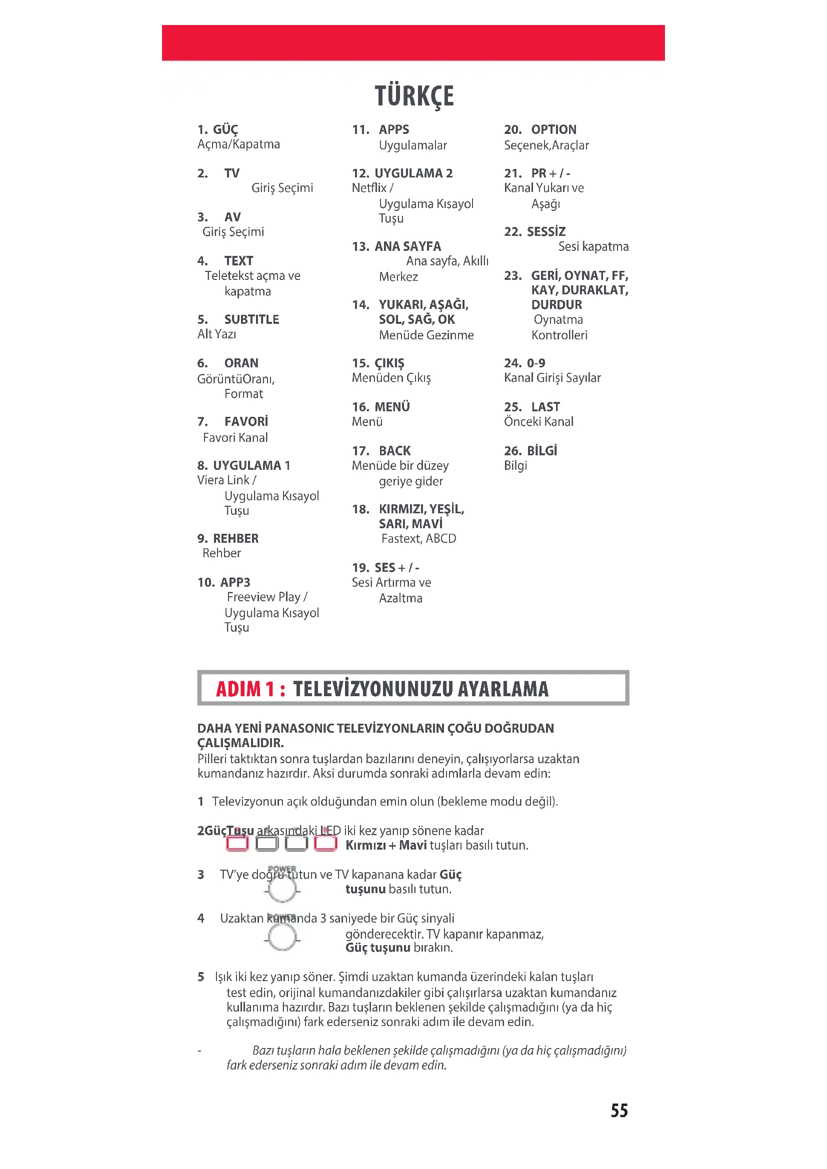 DAHA YENİ PANASONIC TELEVİZYONLARIN ÇOĞU DOĞRUDAN ÇALIŞMALIDIR. Pller taktıktan sonra tulardan bazılarını deneyn, çalııyorlarsa uzaktan kumandanız hazırdır. Aks durumda sonrak adımlarla devam edn: 1 Televzyonun açık olduğundan emn olun (bekleme modu değl). 2 Güç Tuşu arkasındak LED k kez yanıp sönene kadar Kırmızı + Mavi tuları basılı tutun. 3 TV’ye doğru tutun ve TV kapanana kadar Güç tuşunu basılı tutun. 4 Uzaktan kumanda 3 sanyede br Güç snyal gönderecektr. TV kapanır kapanmaz, Güç tuşunu bırakın. 5 Iık k kez yanıp söner. md uzaktan kumanda üzerndek kalan tuları test edn, orjnal kumandanızdakler gb çalıırlarsa uzaktan kumandanız kullanıma hazırdır. Bazı tuların beklenen eklde çalımadığını (ya da hç çalımadığını) fark edersenz sonrak adım le devam edn. - Bazı tuşların hala beklenen şekilde çalışmadığını (ya da hiç çalışmadığını) fark ederseniz sonraki adım ile devam edin.