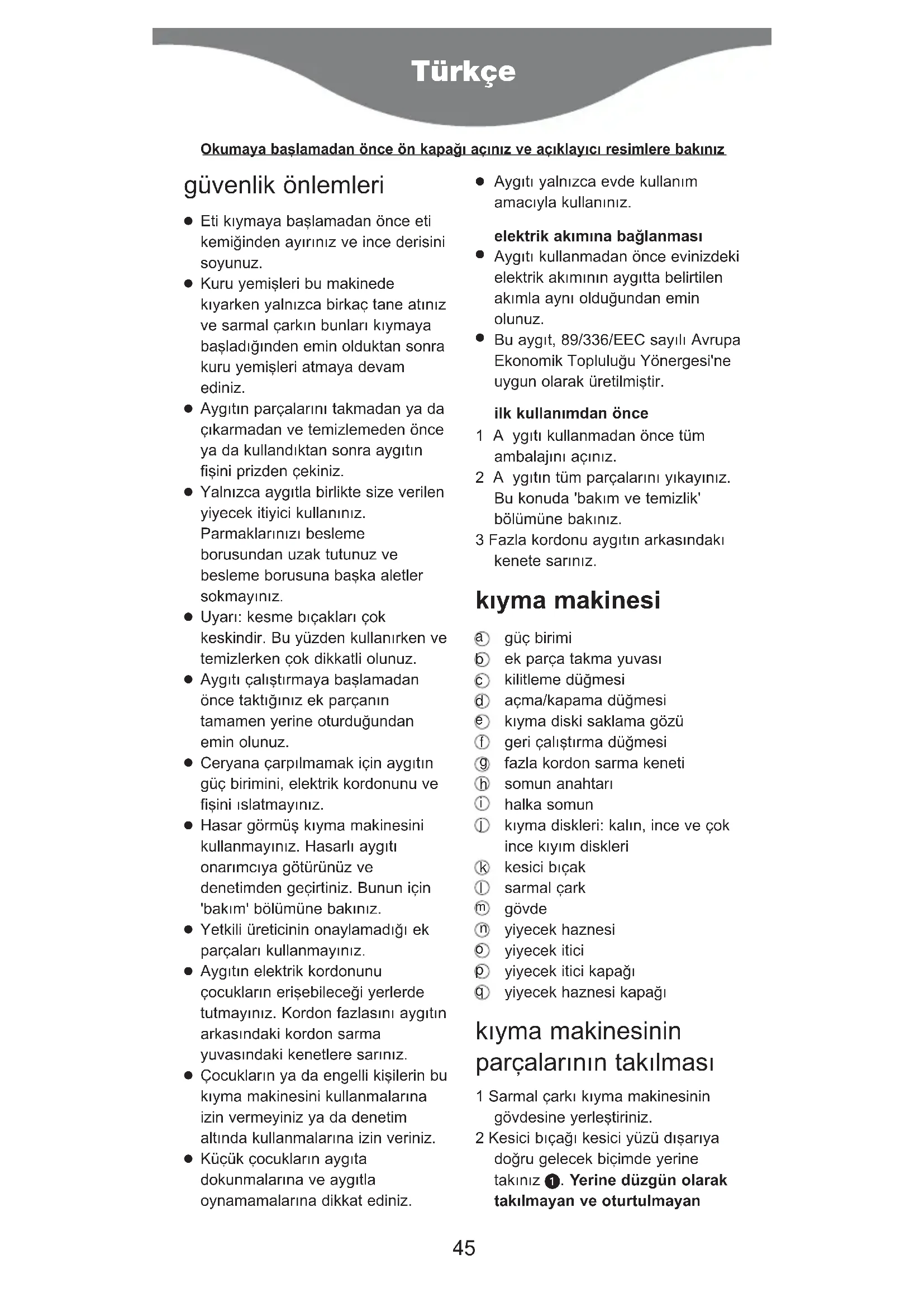 Bu aygıt, 89/336/EEC sayılı Avrupa Ekonomik Topluluòu Yönergesi'ne uygun olarak üretilmi…tir. ilk kullanımdan önce 1Aygıtı kullanmadan önce tüm ambalajını açınız. 2Aygıtın tüm parçalarını yıkayınız. Bu konuda 'bakım ve temizlik' bölümüne bakınız. 3 Fazla kordonu aygıtın arkasındakı kenete sarınız. kıyma makinesi güç birimi ek parça takma yuvası kilitleme düòmesi açma/kapama düòmesi kıyma diski saklama gözü geri çalı…tırma düòmesi fazla kordon sarma keneti somun anahtarı halka somun kıyma diskleri: kalın, ince ve çok ince kıyım diskleri kesici bıçak sarmal çark gövde yiyecek haznesi yiyecek itici yiyecek itici kapaòı yiyecek haznesi kapaòı kıyma makinesinin parçalarının takılması 1 Sarmal çarkı kıyma makinesinin gövdesine yerle…tiriniz. 2 Kesici bıçaòı kesici yüzü dı…arıya doòru gelecek biçimde yerine takınız . Yerine düzgün olarak takılmayan ve oturtulmayan