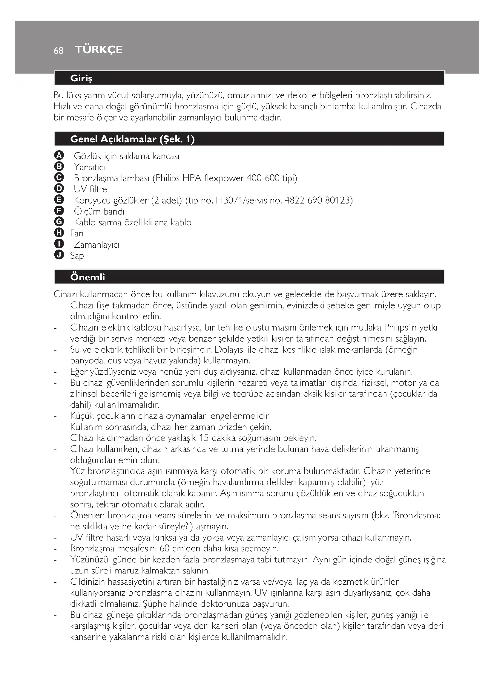 SVENSKA 6768 Giriş Bulüksyarımvücutsolaryumuyla,yüzünüzü,omuzlarınızıvedekoltebölgeleribronzlaştırabilirsiniz. Hızlıvedahadoğalgörünümlübronzlaşmaiçingüçlü,yüksekbasınçlıbirlambakullanılmıştır.Cihazda birmesafeölçerveayarlanabilirzamanlayıcıbulunmaktadır. Genel Açıklamalar (Şek. 1) A Gözlükiçinsaklamakancası B Yansıtıcı C Bronzlaşmalambası(PhilipsHPAexpower400-600tipi) D UVltre E Koruyucugözlükler(2adet)(tipno.HB071/servisno.482269080123) F Ölçümbandı G Kablosarmaözelliklianakablo H Fan I Zamanlayıcı J Sap Önemli Cihazıkullanmadanöncebukullanımkılavuzunuokuyunvegelecektedebaşvurmaküzeresaklayın. Cihazışetakmadanönce,üstündeyazılıolangerilimin,evinizdekişebekegerilimiyleuygunolup olmadığınıkontroledin. Cihazınelektrikkablosuhasarlıysa,birtehlikeoluşturmasınıönlemekiçinmutlakaPhilips’inyetki verdiğibirservismerkeziveyabenzerşekildeyetkilikişilertarafındandeğiştirilmesinisağlayın. Suveelektriktehlikelibirbirleşimdir.Dolayısıilecihazıkesinlikleıslakmekanlarda(örneğin banyoda,duşveyahavuzyakında)kullanmayın. Eğeryüzdüysenizveyahenüzyeniduşaldıysanız,cihazıkullanmadanönceiyicekurulanın. Bucihaz,güvenliklerindensorumlukişilerinnezaretiveyatalimatlarıdışında,ziksel,motoryada zihinselbecerilerigelişmemişveyabilgivetecrübeaçısındaneksikkişilertarafından(çocuklarda dahil)kullanılmamalıdır. Küçükçocuklarıncihazlaoynamalarıengellenmelidir. Kullanımsonrasında,cihazıherzamanprizdençekin. Cihazıkaldırmadanönceyaklaşık15dakikasoğumasınıbekleyin. Cihazıkullanırken,cihazınarkasındavetutmayerindebulunanhavadeliklerinintıkanmamış olduğundaneminolun. Yüzbronzlaştırıcıdaaşırıısınmayakarşıotomatikbirkorumabulunmaktadır.Cihazınyeterince soğutulmamasıdurumunda(örneğinhavalandırmadeliklerikapanmışolabilir),yüz bronzlaştırıcıotomatikolarakkapanır.Aşırıısınmasorunuçözüldüktenvecihazsoğuduktan sonra,tekrarotomatikolarakaçılır. Önerilenbronzlaşmaseanssürelerinivemaksimumbronzlaşmaseanssayısını(bkz.‘Bronzlaşma: nesıklıktavenekadarsüreyle?’)aşmayın. UVltrehasarlıveyakırıksayadayoksaveyazamanlayıcıçalışmıyorsacihazıkullanmayın. Bronzlaşmamesafesini60cm’dendahakısaseçmeyin. Yüzünüzü,gündebirkezdenfazlabronzlaşmayatabitutmayın.Aynıgüniçindedoğalgüneşışığına uzunsürelimaruzkalmaktansakının. Cildinizinhassasiyetiniartıranbirhastalığınızvarsave/veyailaçyadakozmetikürünler kullanıyorsanızbronzlaşmacihazınıkullanmayın.UVışınlarınakarşıaşırıduyarlıysanız,çokdaha dikkatliolmalısınız.Şüphehalindedoktorunuzabaşvurun. Bucihaz,güneşeçıktıklarındabronzlaşmadangüneşyanığıgözlenebilenkişiler,güneşyanığıile karşılaşmışkişiler,çocuklarveyaderikanseriolan(veyaöncedenolan)kişilertarafındanveyaderi kanserineyakalanmariskiolankişilercekullanılmamalıdır.