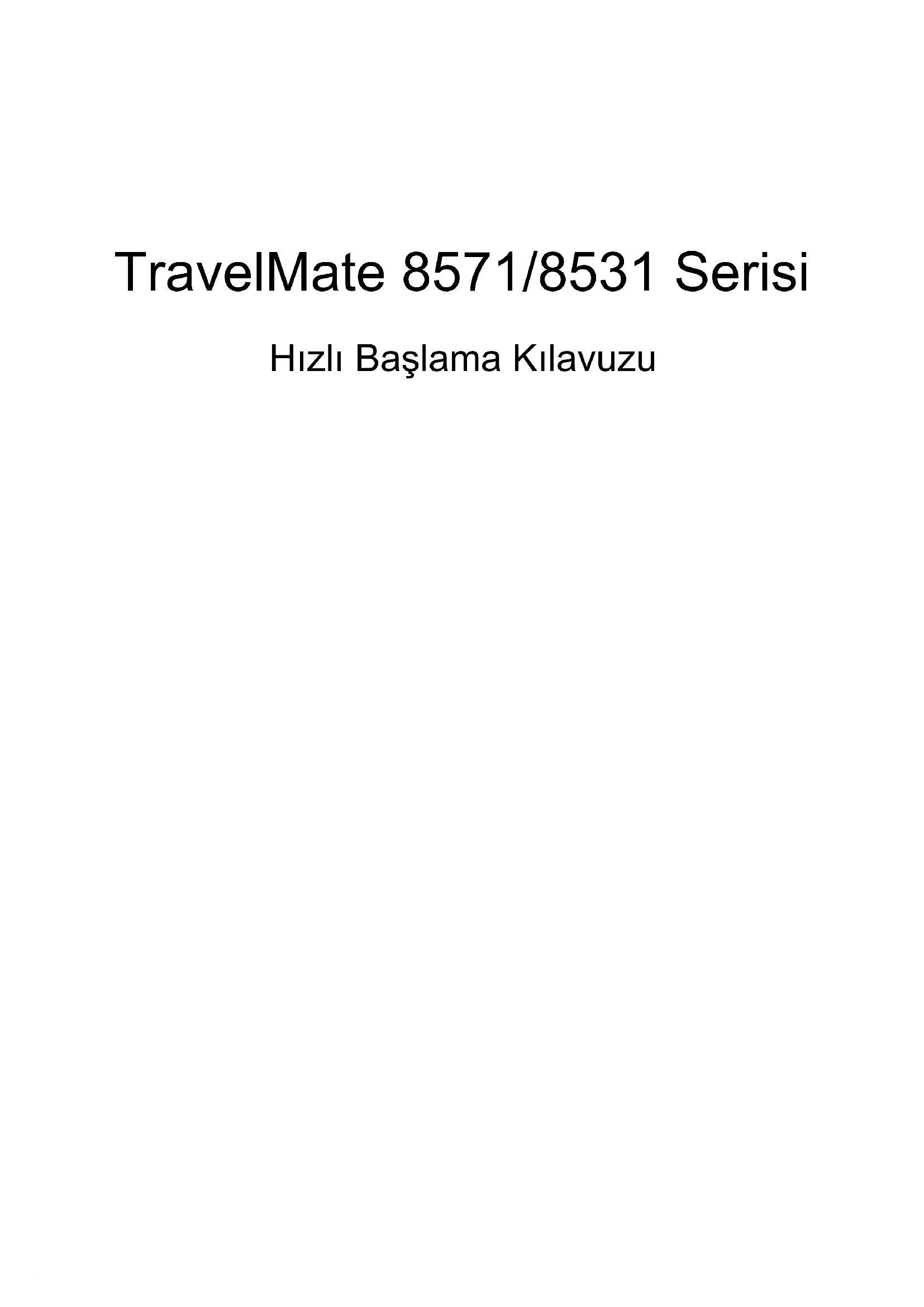 © 2010 Tüm Hakları Saklıdır. TravelMate 8571/8531 Serisi Hızlı Başlama Kılavuzu Orijinal İhraç: 03/2010 TravelMate 8571/8531 Serisi Dizüstü Bilgisayarı3 İlk şeyler ilk Mobil bilgisayar ihtiyaçlarınızı karşılamak için tercihinizi Acer dizüstü bilgisayardan yana yaptığınız için teşekkür ederiz. Rehberleriniz Acer dizüstü bilgisayarı kullanırken size yardımcı olması için bir dizi rehber tasarladık: İlk önce, Sadece Başlayanlar için… poster bilgisayarınızı başlatmanıza yardım eder. Basılı TravelMate Serisi Gelen Kılavuzu TravelMate ürün serisindeki tüm modellere uygulanan faydalı bilgiler içermektedir. Klavyeyi kullanma, Ses vs. gibi temel konular içermektedir. Lütfen aşağıda bahsedilen Acer Sistem Kullanıcı Kılavuzu’nun yanı sıra Genel Kılavuz’un doğası gereği zaman zaman serinin sadece belirli modellerinde bulunan işlev ve özelliklere başvurduğunu ancak satın aldığınız modelde gerekli olmayabileceğini unutmayın. Bu durumda metin “sadece belirli modeller” yazısıyla işaretlenmi ştir. Yazılı Hızlı Başlama Kılavuzu size bilgisayarınızın temel özelliklerini ve işlevlerini tanıtır. Daha verimli olmak için bilgisayarınızın size nasıl yardım ettiğini görmek için lütfen AcerSistem Kullanıcı Kılavuzu’na bakın. Bu rehber; sistem işlevleri, veri kurtarma, genişletme seçenekleri ve sorun giderme gibi konular üzerine detaylı bilgi içerir. Ayrıca; garanti bilgisi ve dizüstü bilgisayarınız için genel kurallar ve güvenlik önlemleri içerir. PDF dosyası içinde mevcuttur ve dizüstü bilgisayarınızda önceden yüklüdür. Ona ulaşmak için bu adımları takip edin: 1 Başlat, Tüm Programlar’a, AcerSistemi’ni tıklayın. 2 AcerSistemi Kullanıcı K ılavuzu’nu tıklayın. Not: Adobe Reader gerektiren dosyayı inceleme. Adobe Reader bilgisayarınızda yüklü değilse AcerSistemi Kullanıcı Kılavuzu’nu tıklamak Adobe Reader ayarlama programını çalıştıracaktır. Bu yüklemeyi tamamlamak için ekrandaki yönergeleri takip edin. Adobe Reader’ın nasıl kullanıldığını öğrenmek için, Yardım ve Destek menüsüne girin.4 Türkçe Acer dizüstü bilgisayarınızda bir gezinti Başlangıç seviyesindekiler için... posterinde gösterildiği şekilde bilgisayarınızı kurduktan sonra, yeni Acer dizüstü bilgisayarınızla ilgili bilgiler verelim. Üst Görünüm # Için Öğe Açıklama 1 Acer Crystal Eye web kamerası Video iletişimi için Web kamerası (sadece belirli modeller).5 Türkçe 2 Mikrofon Ses kaydı için dahili mikrofon. 3 Görüntü ekranı Sıvı Kristalli Görüntü (LCD) olarak da bilinir ve bilgisayar çıktılarını gösterir (yapılandırma modellere göre farklı olabilir). 4 Hoparlörler Sol ve sağ hoparlörler stereo ses çıkışı verir. 5 Klavye Bilgisayarınıza veri girmek için. 6 Dokunmatik yüzey Bilgisayar faresi gibi bir işleve sahip dokunmaya duyarlı işaretleme cihazı. 7Tuşlar (sol, orta* ve sağ) Sol ve sağ düğmeler sol ve sağ fare düğmeleriyle aynı işlevi görürler. *Ortadaki düğme Acer Bio-Protection parmak izi okuyucusu olarak çalışır ve Acer FingerNav 4 yönlü kontrol işlevini destekler (sadece belirli modeller). 8 Palmrest Bilgisayarı kullanırken ellerinizi destekleyen rahat bir alan. 9 Dokunmatik yüzey değişikliği Dahili dokunmatik yüzeyi açar ve kapatır. 10 Çı karma tuşu Optik diski sürücüden çıkarmak için basılır. Optik sürücü erişim göstergesi Optik sürücü etkinken yanar. 11 HDD Sabit diskin etkin olduğunu gösterir. Num Lock Num Lock etkin olduğunda yanar. Caps Lock Caps Lock etkin olduğunda yanar. İletişim anahtarı WLAN/3G işlevlerini etkinleştirir/engeller. Yedekleme TuşuÜç adımlı veri yedekleme için Acer Backup Management’ı başlatır. Acer PowerSmart tuşu Bilgisayarınızı güç tasarrufu moduna çevirir. 12 Güç tuşu/ gösterge Bilgisayarı açar ve kapatır./ Bilgisayarın güç durumunu gösterir. # Için Öğe Açıklama6 Türkçe Faydalı tuşlar Bilgisayarda, ekran parlaklığı ve ses çıkışı gibi bilgisayarın birçok kontrolüne erişimin sağlanması için faydalı tuşlar yer almaktadır. Faydalı tuşları etkinleştirmek için, faydalı tuş kombinasyonundaki diğer tuşa basmadan önce <Fn> tuşuna basılı tutun. Faydalı tuş Için İşlev Açıklama <Fn> + <F2> Sistem özellikleri Sistem bilgileri için Sistem Özellikleri’ni baslatir. <Fn> + <F3> Bluetooth Bluetooth işlevini etkinleştirir/engeller (sadece belirli modeller). <Fn> + <F4> Uyku Bilgisayarı Uyku moduna sokar. <Fn> + <F5> Ekran değişikliği Görüntü ekranı, harici monitör (eğer bağlıysa) ve ikisi arasında ekran çıktısını değiştirir. <Fn> + <F6> Ekran boş Görüntü ekran arka ışığını, güçten kazanmak için kapatır. Geriye dönmek için herhangi bir tuşa basın. <Fn> + <F8> Hoparlör değişikliği Hoparlörleri açar ve kapatır. <Fn> + < > Parlaklığı artır Ekran parlaklığını art ırır. <Fn> + < > Parlaklığı azalt Ekran parlaklığını azaltır. <Fn> + < > Ses aç Sesi artırır. <Fn> + < > Ses kapat Sesi azaltır.7 Türkçe Kapalı ön görünüm Arka görünüm # Için Öğe Açıklama 1 Pil Bilgisayarın pil durumunu gösterir.