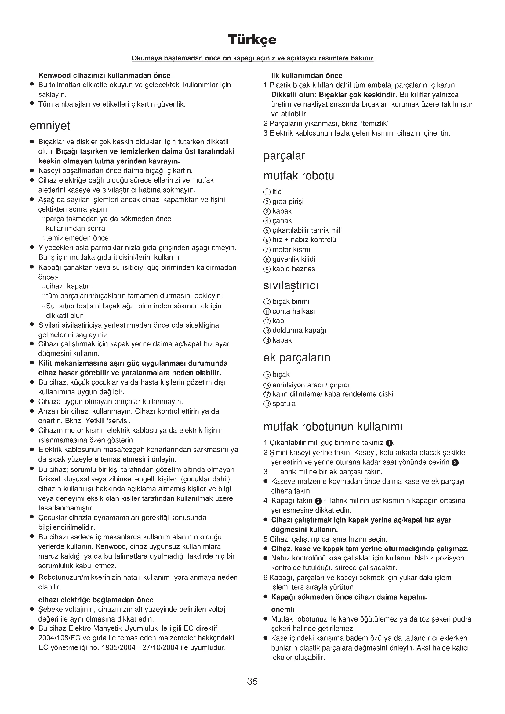 Bu cihaz Elektro Manyetik Uyumluluk ile ilgili EC direktifi 2004/108/EC ve gıda ile temas eden malzemeler hakkçndaki EC yönetmeliği no. 1935/2004 - 27/10/2004 ile uyumludur. ilk kullan›mdan önce 1 Plastik b›çak k›l›flar› dahil tüm ambalaj parçalar›n› ç›kart›n. Dikkatli olun: B›çaklar çok keskindir. Bu k›l›flar yaln›zca üretim ve nakliyat s›ras›nda b›çaklar› korumak üzere tak›lm›flt›r ve at›labilir. 2 Parçalar›n y›kanmas›, bknz. ‘temizlik’ 3 Elektrik kablosunun fazla gelen k›sm›n› cihaz›n içine itin. parçalar mutfak robotu itici g›da girifli kapak çanak ç›kart›labilir tahrik mili hız + nabız kontrolü motor k›sm› güvenlik kilidi kablo haznesi s›v›laflt›r›c› b›çak birimi conta halkas› kap doldurma kapa¤› kapak ek parçalar›n b›çak emülsiyon aracı / çırpıcı kal›n dilimleme/ kaba rendeleme diski spatula mutfak robotunun kullan›m› 1 Çıkarılabilir mili güç birimine takınız . 2 fiimdi kaseyi yerine tak›n. Kaseyi, kolu arkada olacak flekilde yerlefltirin ve yerine oturana kadar saat yönünde çevirin . 3Tahrik miline bir ek parças› tak›n.