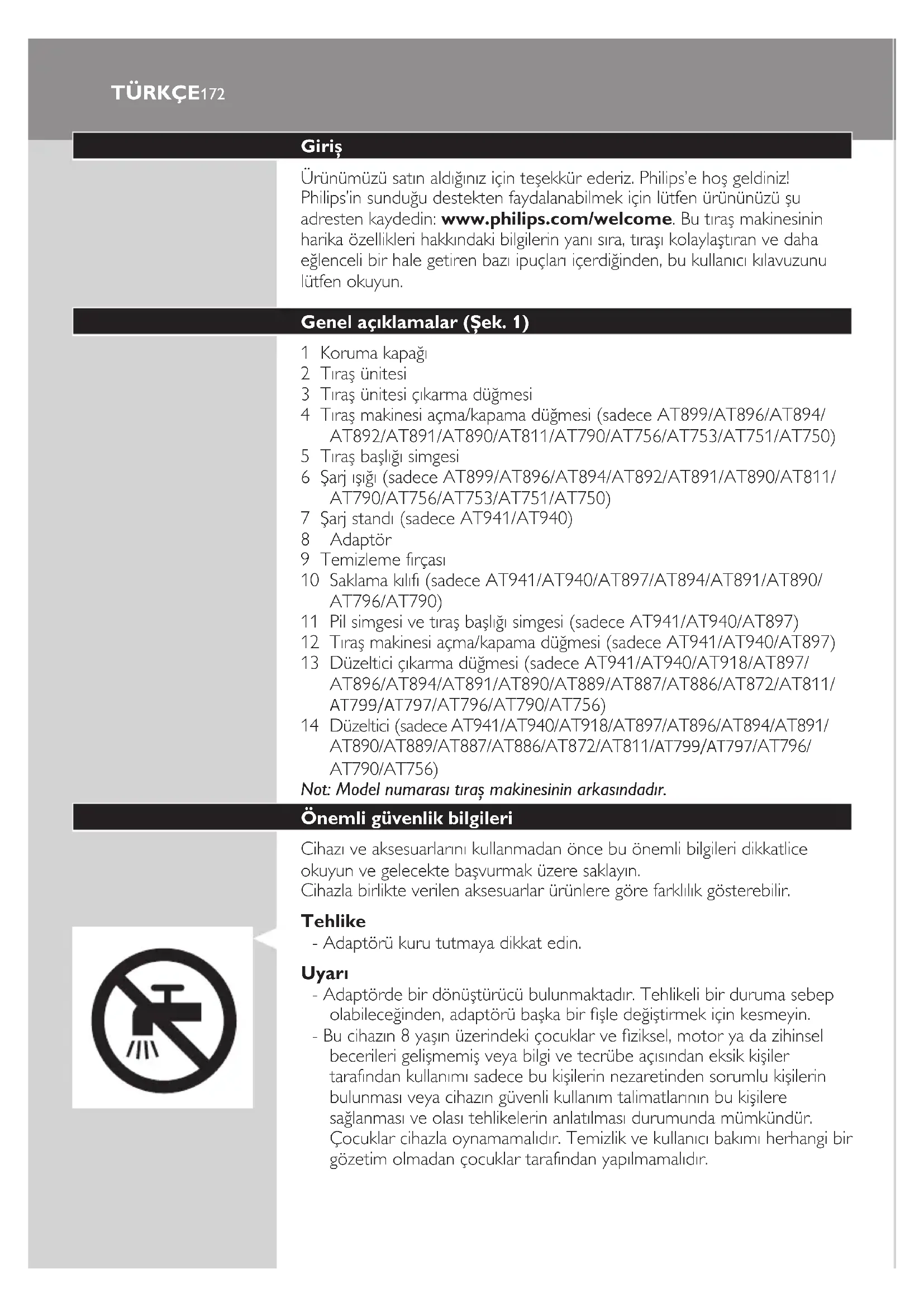 Giriş Ürünümüzü satın aldığınız için teşekkür ederiz. Philips’e hoş geldiniz! Philips’in sunduğu destekten faydalanabilmek için lütfen ürününüzü şu adresten kaydedin: www.philips.com/welcome. Bu tıraş makinesinin harika özellikleri hakkındaki bilgilerin yanı sıra, tıraşı kolaylaştıran ve daha eğlenceli bir hale getiren bazı ipuçları içerdiğinden, bu kullanıcı kılavuzunu lütfen okuyun. Genel açıklamalar (Şek. 1) 1 Koruma kapağı 2 Tıraş ünitesi 3 Tıraş ünitesi çıkarma düğmesi 4 Tıraş makinesi açma/kapama düğmesi (sadece AT899/AT896/AT894/ AT892/AT891/AT890/AT811/AT790/AT756/AT753/AT751/AT750) 5 Tıraş başlığı simgesi 6 Şarj ışığı (sadece AT899/AT896/AT894/AT892/AT891/AT890/AT811/ AT790/AT756/AT753/AT751/AT750) 7 Şarj standı (sadece AT941/AT940) 8 Adaptör 9 Temizleme fırçası 10 Saklama kılıfı (sadece AT941/AT940/AT897/AT894/AT891/AT890/ AT796/AT790) 11 Pil simgesi ve tıraş başlığı simgesi (sadece AT941/AT940/AT897) 12 Tıraş makinesi açma/kapama düğmesi (sadece AT941/AT940/AT897) 13 Düzeltici çıkarma düğmesi (sadece AT941/AT940/AT918/AT897/ AT896/AT894/AT891/AT890/AT889/AT887/AT886/AT872/AT811/ AT799/AT797/AT796/AT790/AT756) 14 Düzeltici (sadece AT941/AT940/AT918/AT897/AT896/AT894/AT891/ AT890/AT889/AT887/AT886/AT8 72/AT811/AT799/AT797/AT796/ AT790/AT756) Not: Model numarası tıraş makinesinin arkasındadır. Önemli güvenlik bilgileri Cihazı ve aksesuarlarını kullanmadan önce bu önemli bilgileri dikkatlice okuyun ve gelecekte başvurmak üzere saklayın. Cihazla birlikte verilen aksesuarlar ürünlere göre farklılık gösterebilir. Tehlike - Adaptörü kuru tutmaya dikkat edin. Uyarı - Adaptörde bir dönüştürücü bulunmaktadır. Tehlikeli bir duruma sebep olabileceğinden, adaptörü başka bir şle değiştirmek için kesmeyin. - Bu cihazın 8 yaşın üzerindeki çocuklar ve ziksel, motor ya da zihinsel becerileri gelişmemiş veya bilgi ve tecrübe açısından eksik kişiler tarafından kullanımı sadece bu kişilerin nezaretinden sorumlu kişilerin bulunması veya cihazın güvenli kullanım talimatlarının bu kişilere sağlanması ve olası tehlikelerin anlatılması durumunda mümkündür. Çocuklar cihazla oynamamalıdır. Temizlik ve kullanıcı bakımı herhangi bir gözetim olmadan çocuklar tarafından yapılmamalıdır.173 - Tıraş makinesini musluk altında yıkamadan önce mutlaka prizden çekin. - Kullanmadan önce her zaman cihazı ve aksesuarlarını kontrol edin. Hasarlıysa yaralanmalara sebep olabileceğinden, cihazı ya da aksesuarlarını kullanmayın. Hasarlı parçayı mutlaka orijinaliyle değiştirin. Dikkat - Şarj ünitesini kesinlikle suya batırmayınız ve suda yıkmayınız. - Bu cihazı yalnızca kullanım amacına uygun olarak, kullanım kılavuzunda gösterildiği gibi kullanın. - Hijyenik nedenlerden dolayı cihaz sadece bir kişi tarafından kullanılmalıdır. - Adaptöre kalıcı hasar vermesini önlemek için elektrikli oda parfümlerinin takılmış ya da takılı olduğu duvar soketlerinin yakınında kullanmayın. - Cihazı temizlemek için asla basınçlı hava, ovalama bezleri, benzin veya aseton gibi aşındırıcı temizlik ürünleri veya zarar verici sıvılar kullanmayın. - Tıraş makinesini yıkadığınızda, alt kısımda bulunan soketten içeri su damlayabilir. Bu durum normaldir ve cihazın tüm elektronik parçaları su geçirmez bir güç ünitesi ile kaplı olduğu için tehlikeli değildir. Elektromanyetik alanlar (EMF) - Bu Philips cihazı, elektromanyetik alanlara maruz kalmaya ilişkin geçerli tüm standartlara ve düzenlemelere uygundur. Genel - Bu tıraş makinesi su geçirmezdir. Banyo veya duşta kullanıma ve musluk altında temizlemeye uygundur. Güvenlik nedeniyle bu epilatör yalnızca kablosuz olarak kullanılabilir. - Cihaz 100 ile 240 volt arasındaki şebeke gerilimlerine uygundur. - Adaptör 100-240 volt’u güvenli seviye olan 24 volttan daha düşük değerlere çevirmektedir. - Maksimum gürültü düzeyi: Lc = 69 dB(A) Şarj etme Not: Tıraş makinesi, doğrudan prizdeki şebeke elektriğine bağlı halde kullanılamaz. Tıraş makinesini ilk defa veya uzun süre kullanılmadıktan sonra şarj ettiğinizde, şarj ışığı sürekli yanana kadar şarjda bırakın. Tıraş makinenizin şarj süresi için aşağıdaki tabloyu inceleyin. Şarj süresi 1 saat 8 saat AT941, AT940, AT918 AT897, AT896, AT894 AT892, AT891, AT890 AT889, AT887, AT886 AT899, AT896, AT872 , AT799, AT797, AT796, AT790, AT770, AT756, AT753, AT751, AT750 AT811 Tıraş olma işlemi; tıraş olma tarzı, temizlik alışkanlıkları veya sakal tipine bağlı olarak aşağıdaki tabloda belirtilenden daha kısa sürebilir. TÜRKÇETıraş süresi 60 dak. 50 dak. 45 dak. 40 dak. AT941 AT899 AT790, AT756, AT753 AT940 AT897, AT894, AT892 AT891, AT890, AT811, AT799 AT896 AT751, AT750 Şarj göstergeleri Düşük pil - AT941/AT940/AT897: Pil bitmek üzereyken (5 dakika veya daha az tıraş olma süresi kaldığında) turuncu pil simgesi yanıp sönmeye başlar. Tıraş makinesini kapattığınızda turuncu pil simgesi birkaç saniye daha yanıp sönmeye devam eder. - AT899, AT896, AT918, AT896, AT894, AT891, AT890, AT889, AT887, AT886, AT872, AT811, AT799, AT797, AT796, AT790, AT770, AT756, AT753, AT751, AT750: Pil bitmek üzereyken (5 dakika veya daha az tıraş olma süresi kaldığında) şarj ışığı turuncu renkte yanıp sönmeye başlar. Tıraş makinesini kapattığınızda şarj ışığı birkaç saniye turuncu renkte yanıp sönmeye devam eder. Hızlı şarj (sadece AT941, AT940, AT918, AT 897, AT896, AT894, AT891, AT890, AT889, AT887, AT886, AT811) - AT941/AT940/AT897: Boş pili şarj etmeye başladığınızda, pil simgesi turuncu ve beyaz renkte yanıp söner. Not: Turuncu ve beyaz renkte yanıp sönen pil simgesinin sadece beyaz renkte yanıp sönmeye başlaması, üç dakikalık hızlı bir tıraş için y