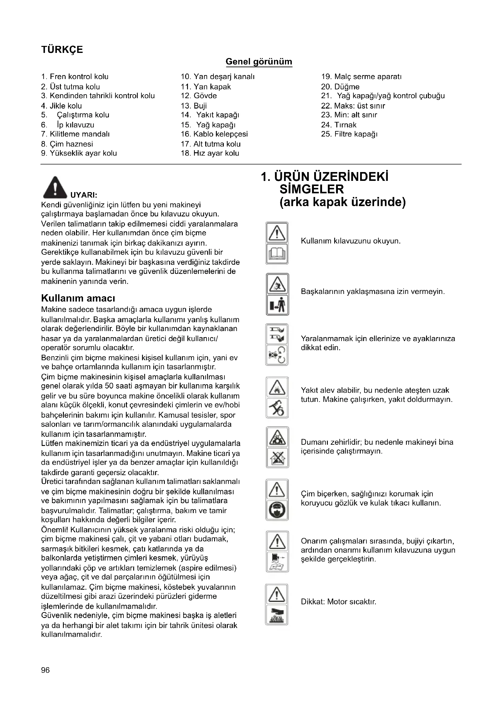 Kullanım kılavuzunu okuyun. Başkalarının yaklaşmasına izin vermeyin. Yaralanmamak için ellerinize ve ayaklarınıza dikkat edin. Yakıt alev alabilir, bu nedenle ateşten uzak tutun. Makine çalışırken, yakıt doldurmayın. Dumanı zehirlidir; bu nedenle makineyi bina içerisinde çalıştırmayın. Çim biçerken, sağlığınızı korumak için koruyucu gözlük ve kulak tıkacı kullanın. Onarım çalışmaları sırasında, bujiyi çıkartın, ardından onarımı kullanım kılavuzuna uygun şekilde gerçekleştirin. Dikkat: Motor sıcaktır.97